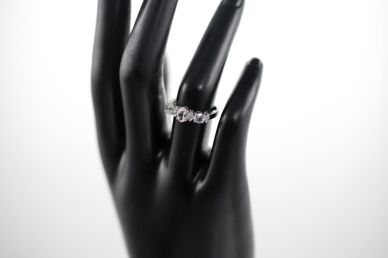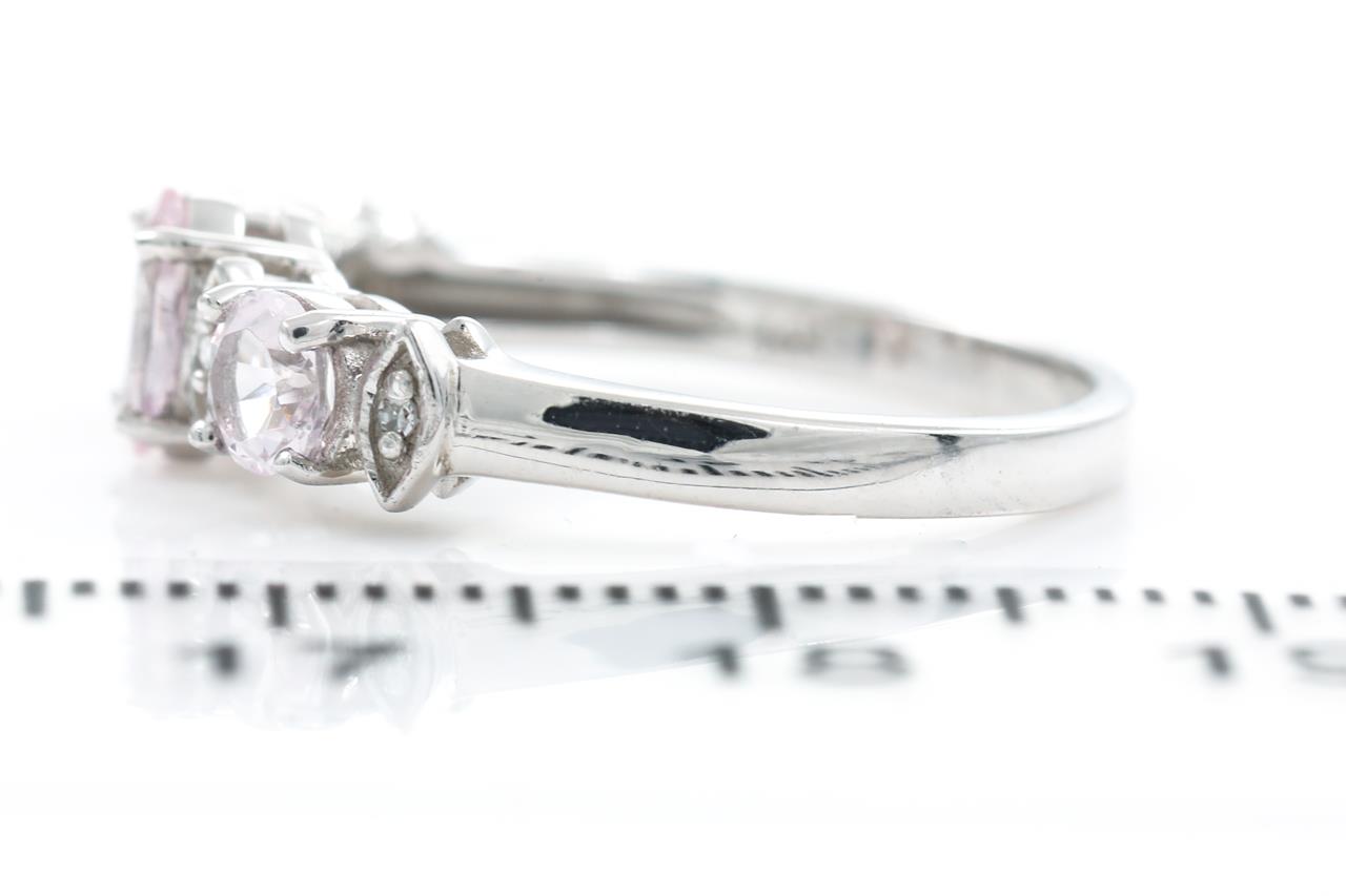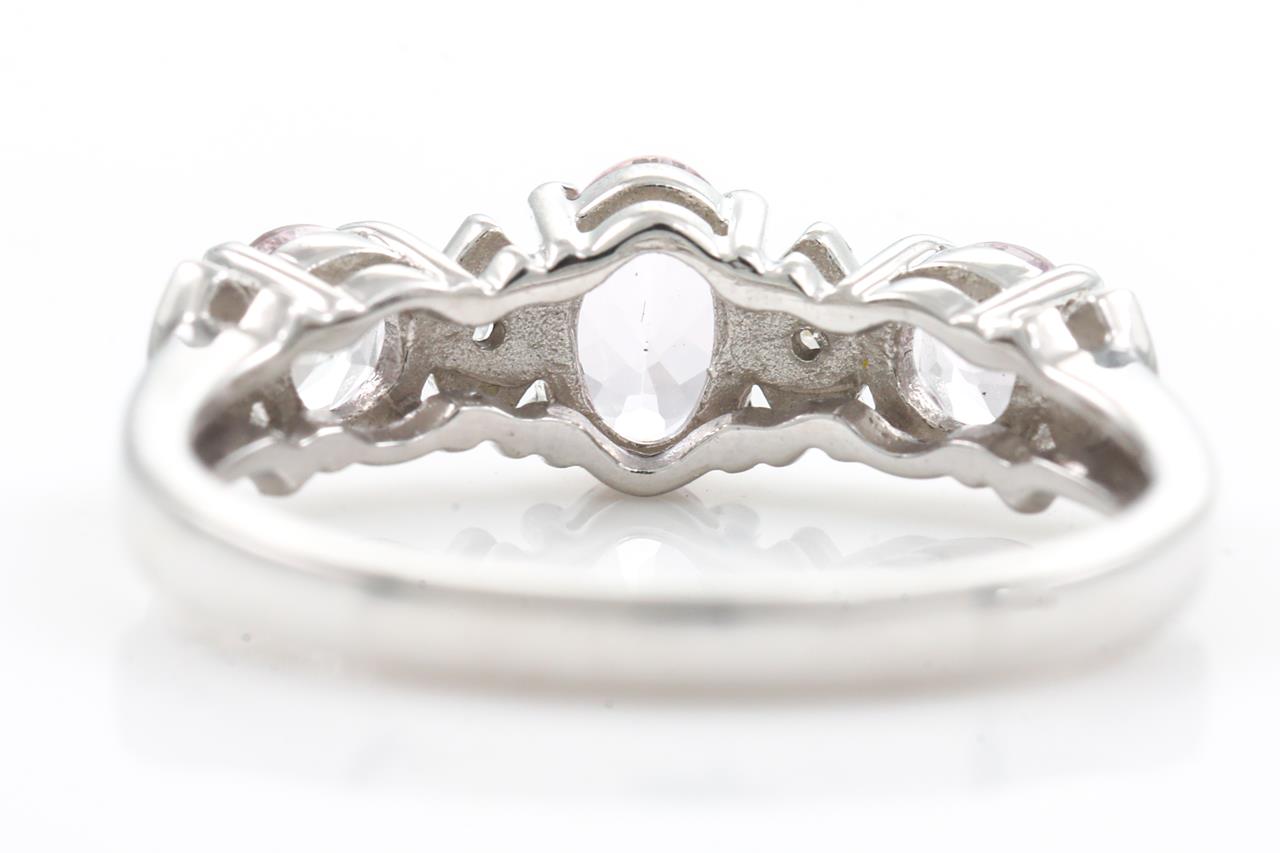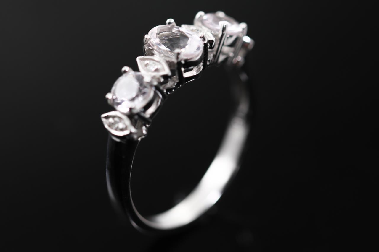 Quartz and Diamond ring with round & oval shape light pink Quartz totalling approximately 0.70cts and Diamonds totalling approximately 0.02cts. 14ct white gold. Ring size L. Weight: 2.7g. (As new)
