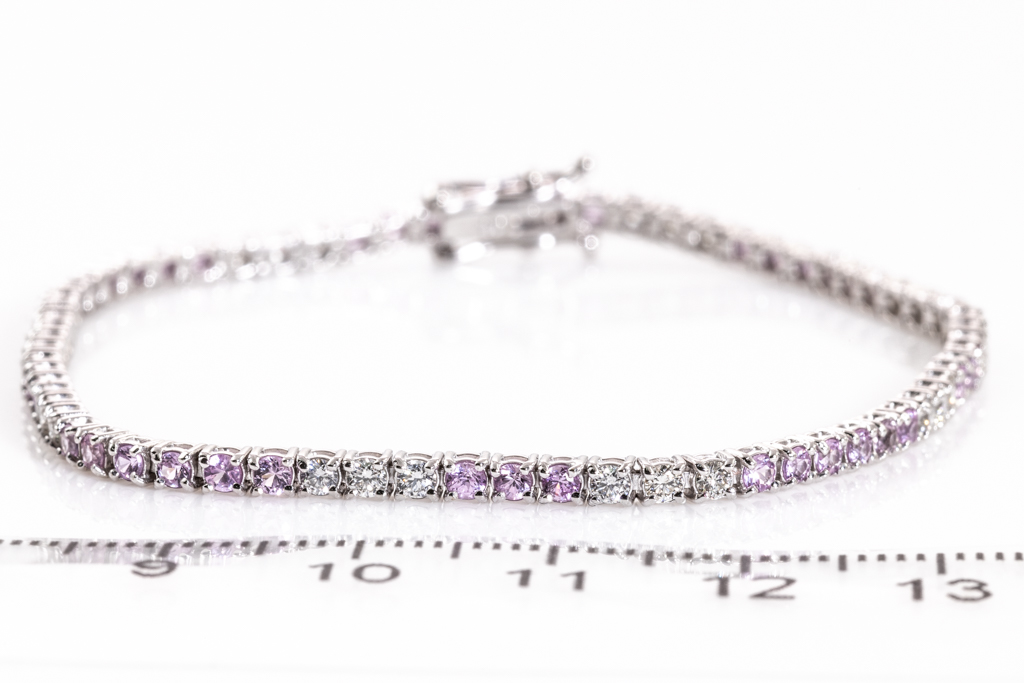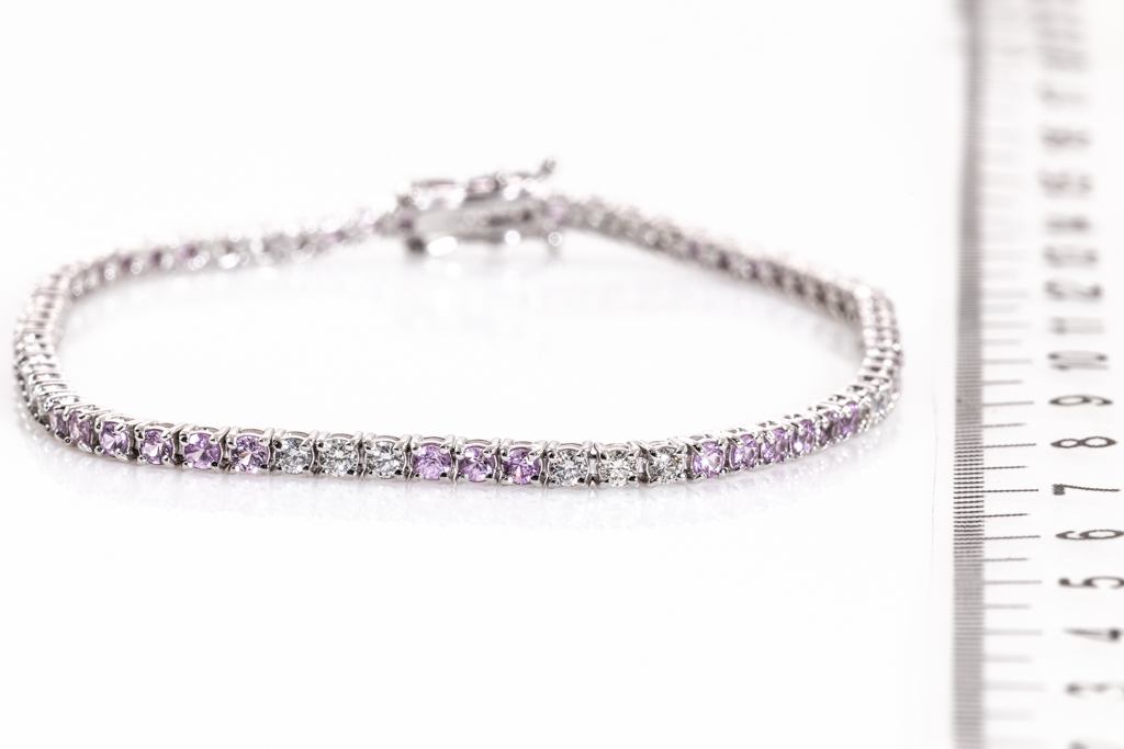 Sapphire and Diamond tennis bracelet with round pink Sapphires totalling approximately 1.60cts and round cut Diamonds totalling approximately 1.00cts (Estimated Grading: H-I SI). 18ct white gold. Length: 18cm. Weight 7.0g. (Pre-owned)