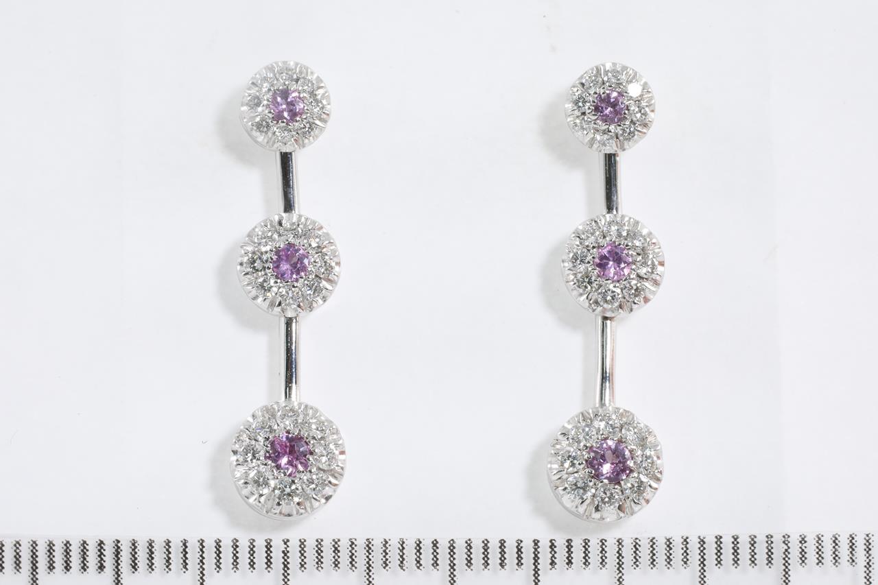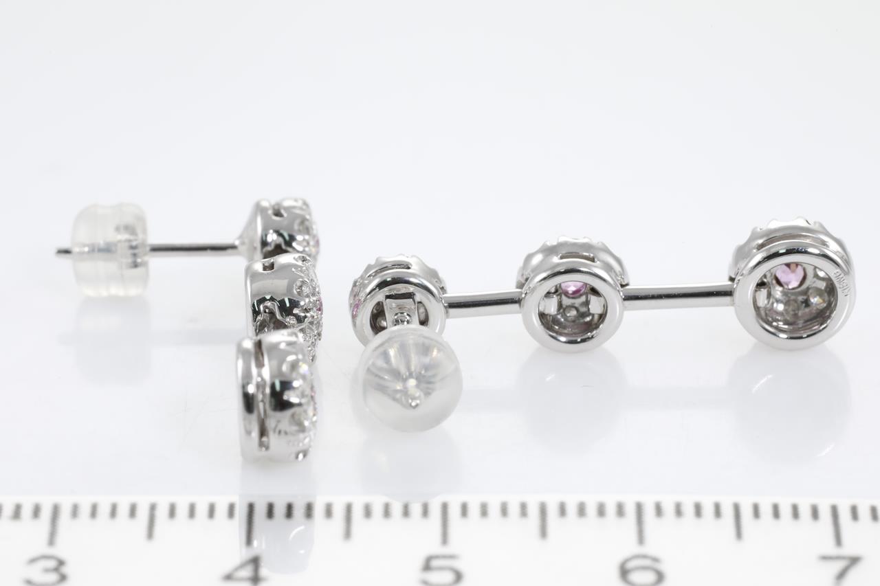 Sapphire and Diamond drop shape earrings with 6 round pink Sapphires and round Diamonds totalling approximately 0.60cts. 18ct white gold. (Pre-owned)
