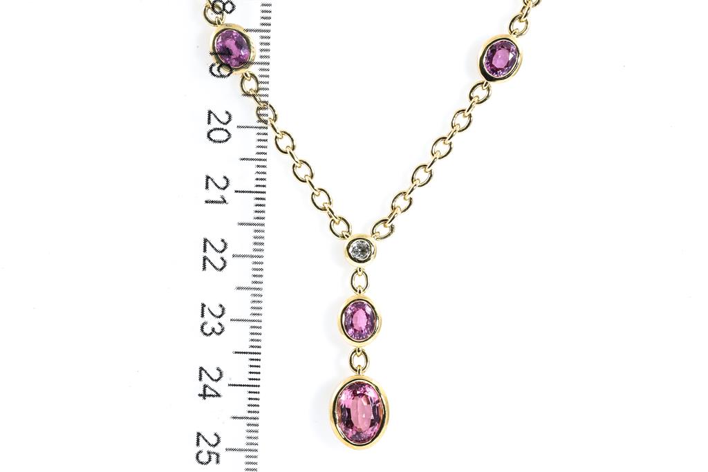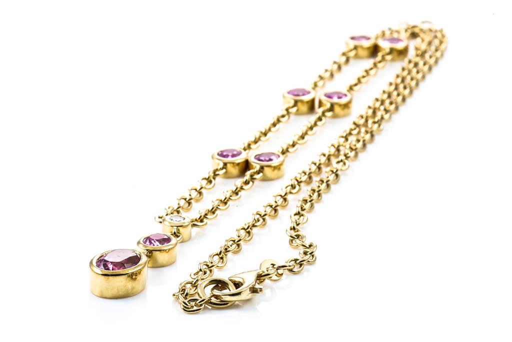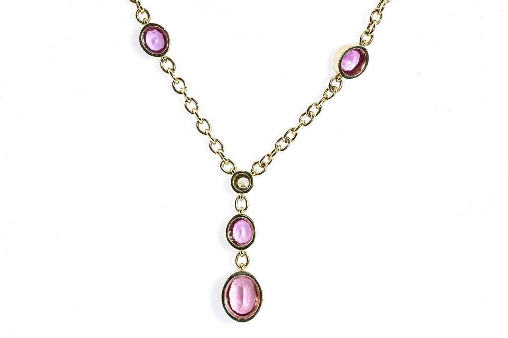 1843. Sapphire and Diamond Necklace with oval pink Sapphires totalling approximately 6.00cts and round Diamond totalling approximately 0.12cts. 18ct yellow gold. Length 60cm. Weight 21.1g. (Pre-owned)