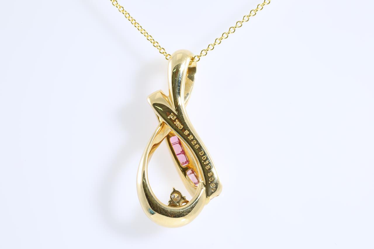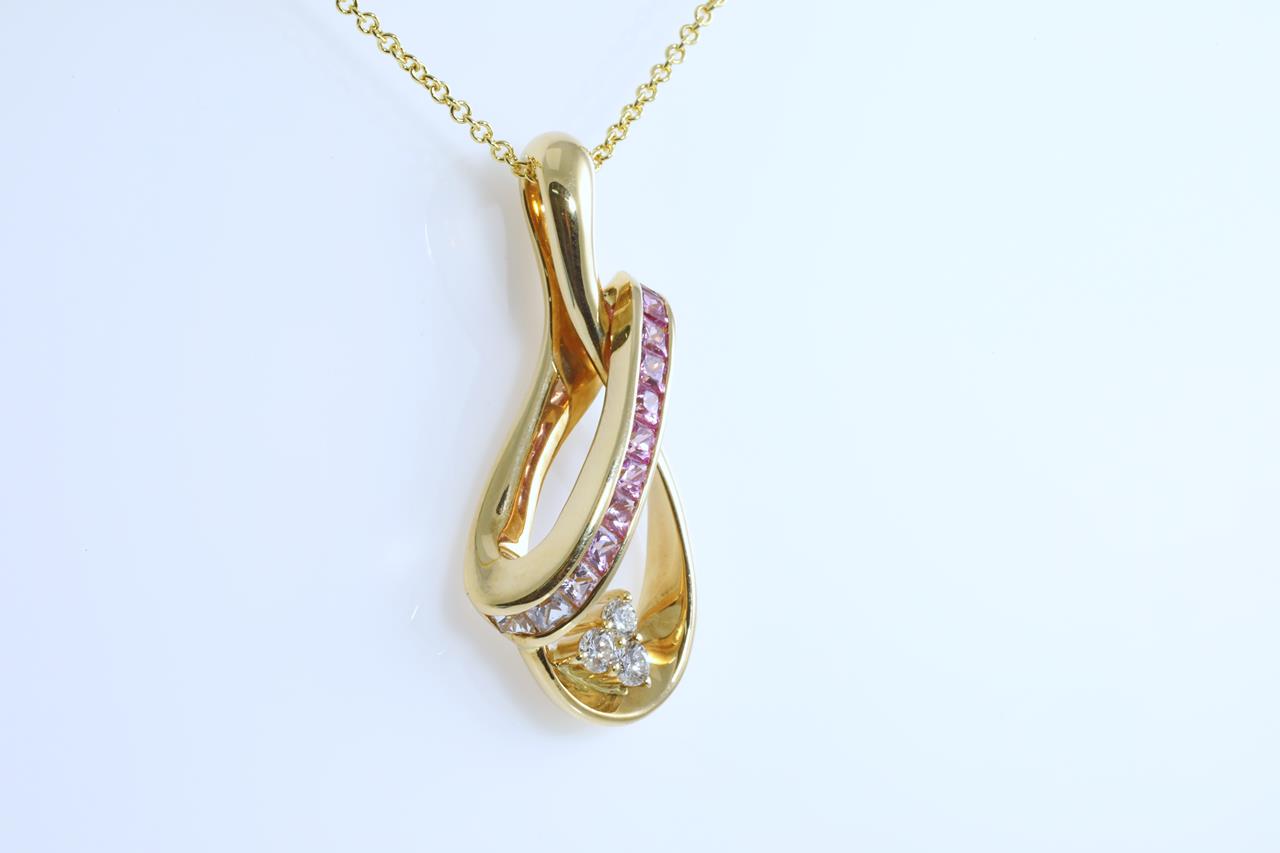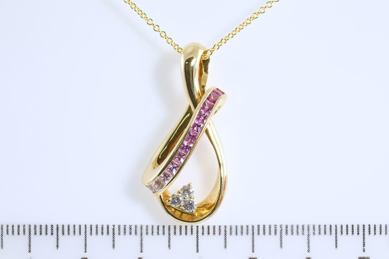 Sapphire and Diamond pendant with princess cut pink Sapphires totalling 0.85cts and 3 round Diamonds totalling 0.15cts. 18ct yellow gold with 45cm 18ct yellow gold chain. Weight: 9.6g (Pre-owned)