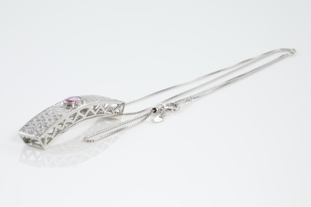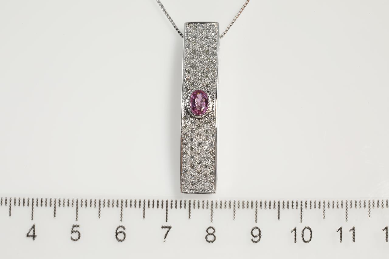 Sapphire and Diamond pendant with oval shape pink Sapphire of 0.52ct and Diamonds totalling 0.77cts (Estimated grading: H SI). 18ct white gold with 18ct gold 45cm adjustable chain. Weight: 8.7g (Pre-owned)