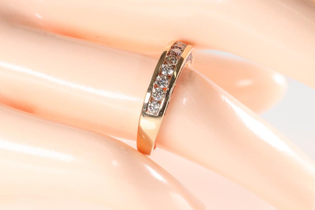 Sapphire and Diamond ring with round pink Sapphires totalling 0.50cts and round Diamonds totalling 0.60cts (Estimated grading: K-L VS-SI). 18ct rose gold. Ring size: L - ring resizing is not recommended. Weight: 5.1g (Pre-owed)