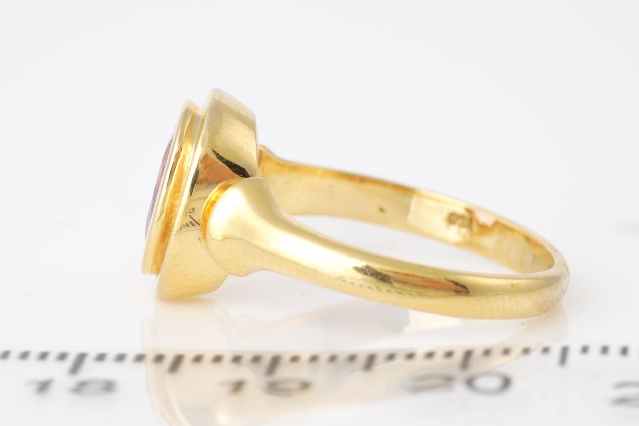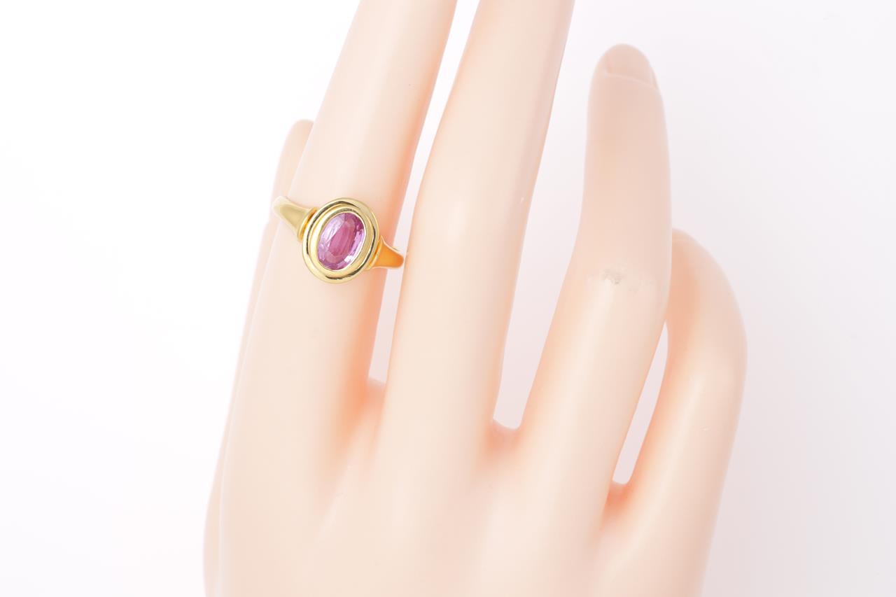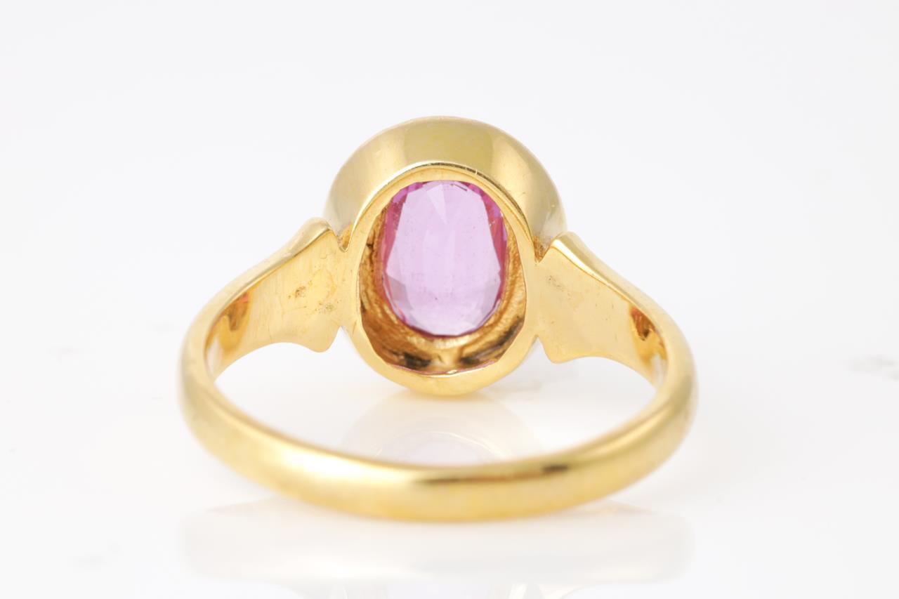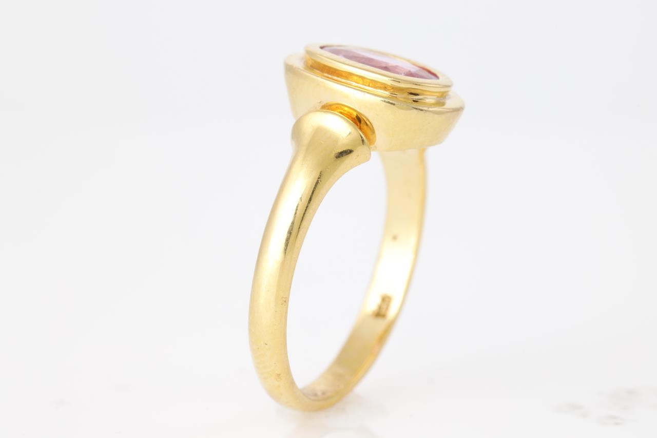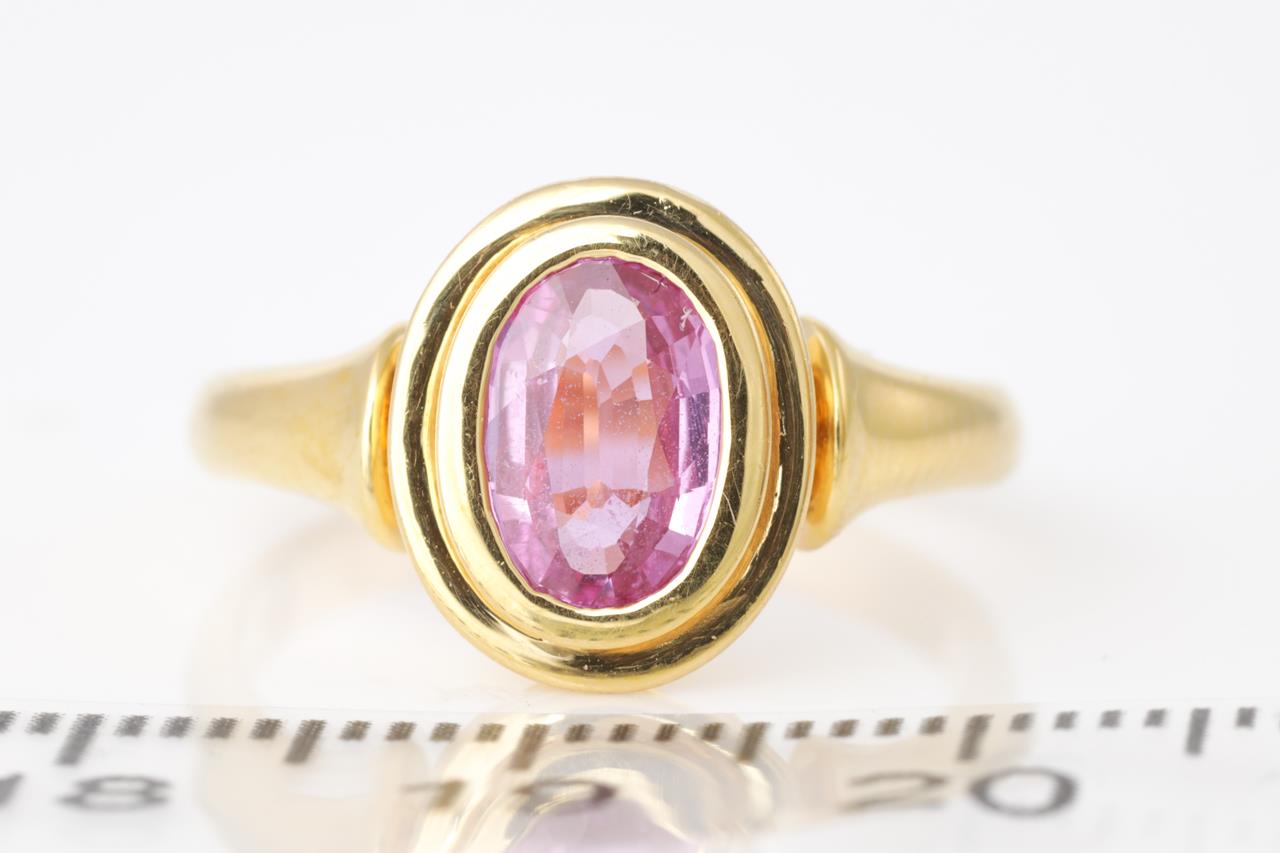 Sapphire Ring with an oval pink Sapphire of approximately 1.00ct. 18ct yellow gold. Ring size M1/2. Weight 4.7g. (As New)