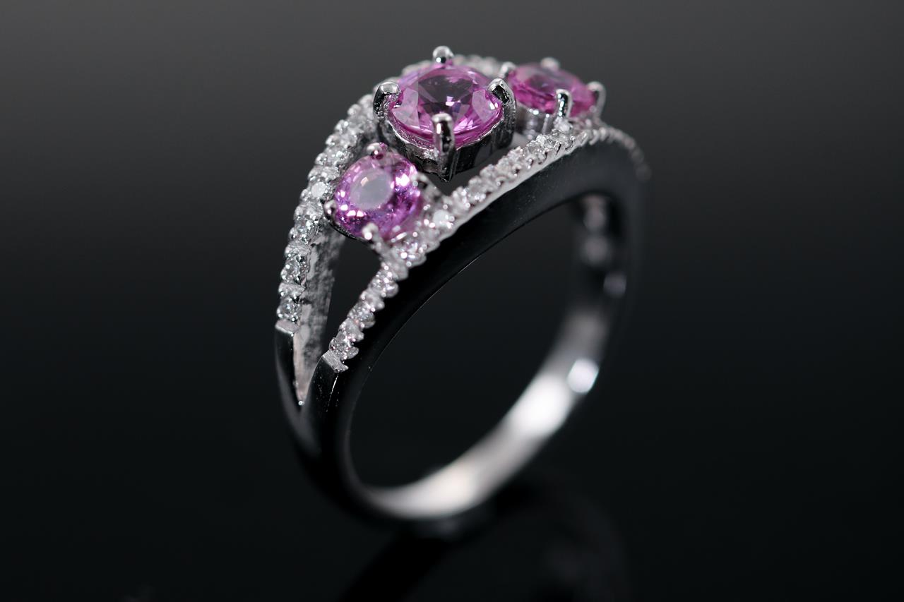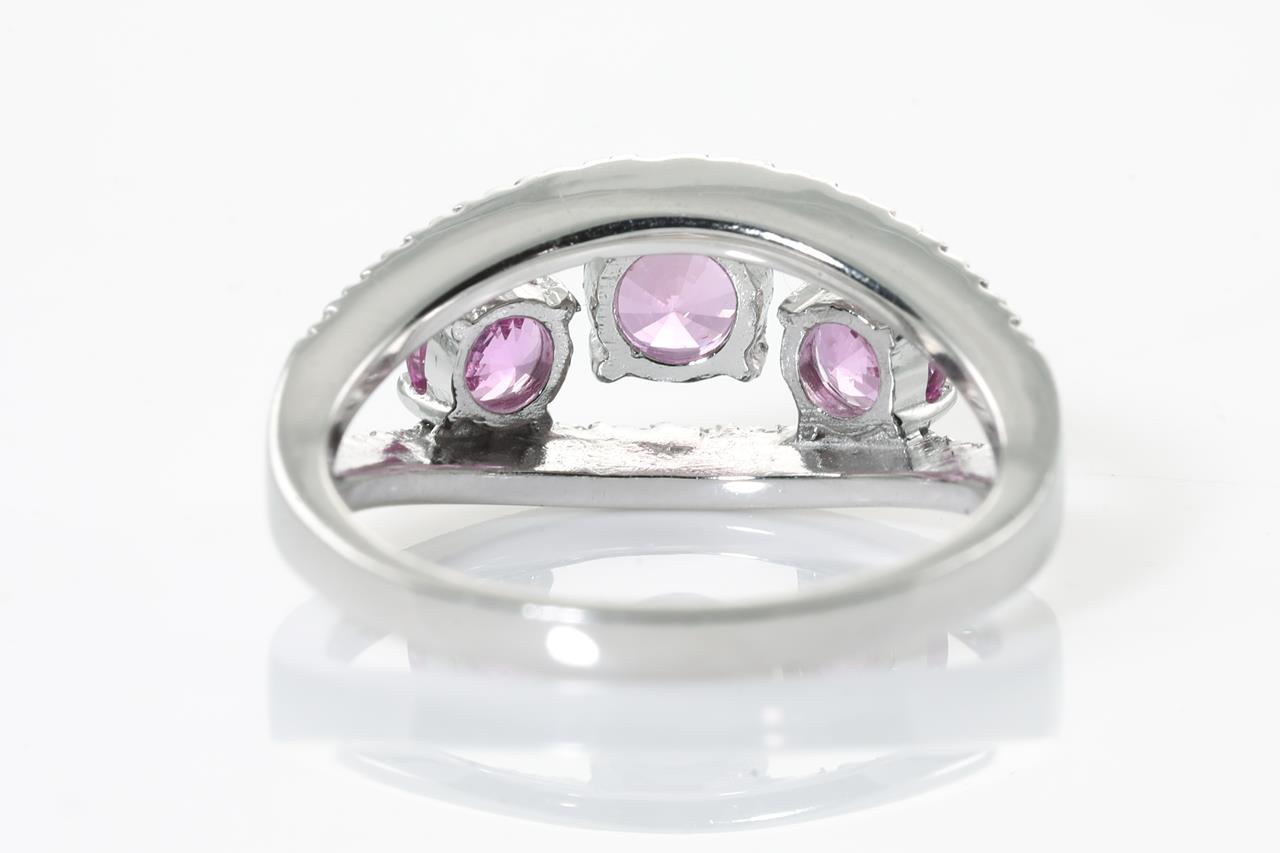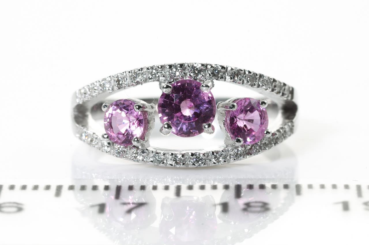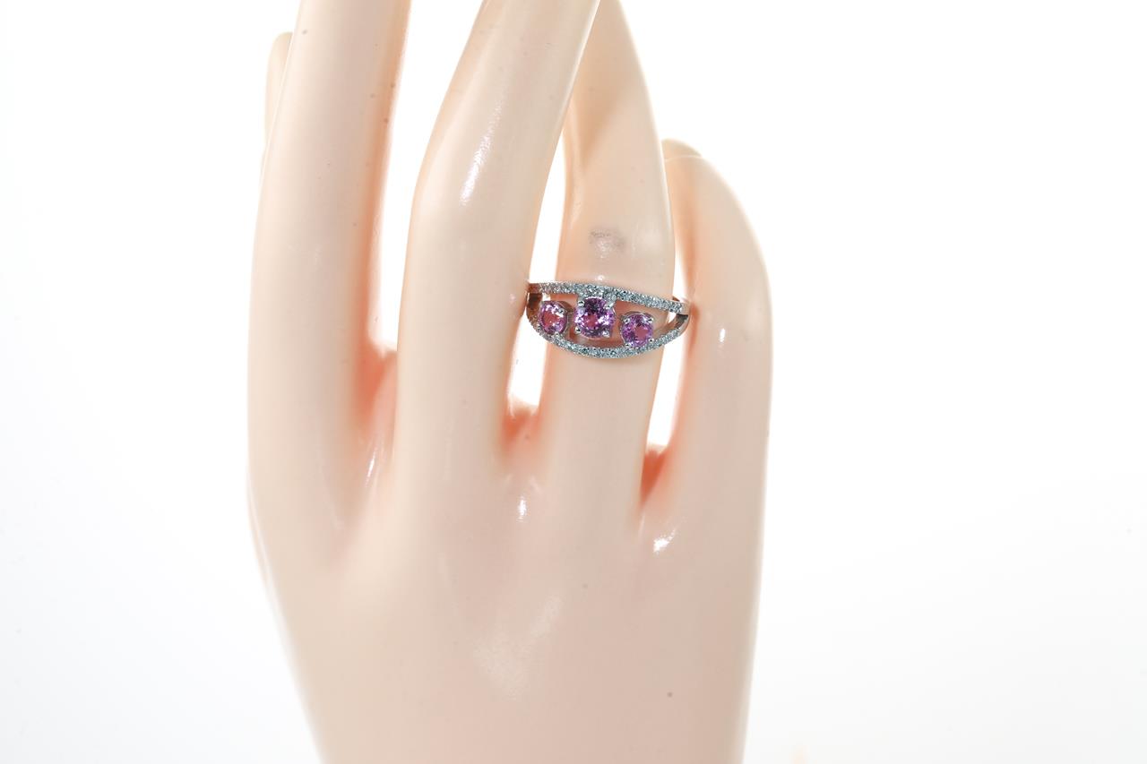 Tourmaline and Diamond ring with 3 round pink Tourmalines totalling approximately 0.90cts and surrounding round Diamonds totalling 0.14cts. 18ct white gold. Ring size: L1/2. Weight: 5.5g. (Pre-owned)