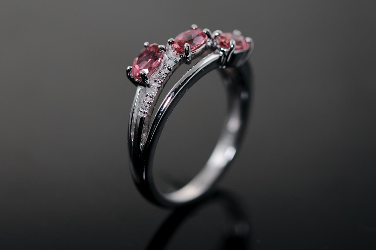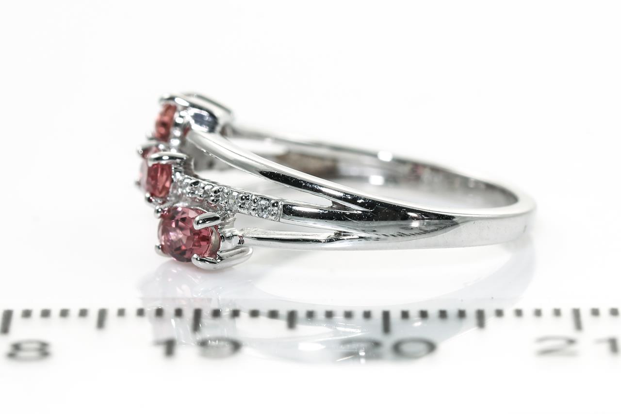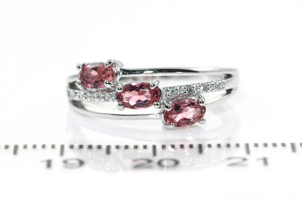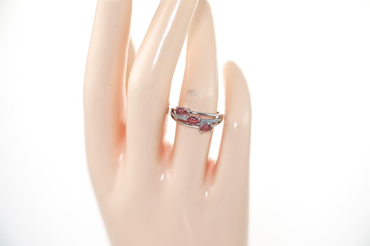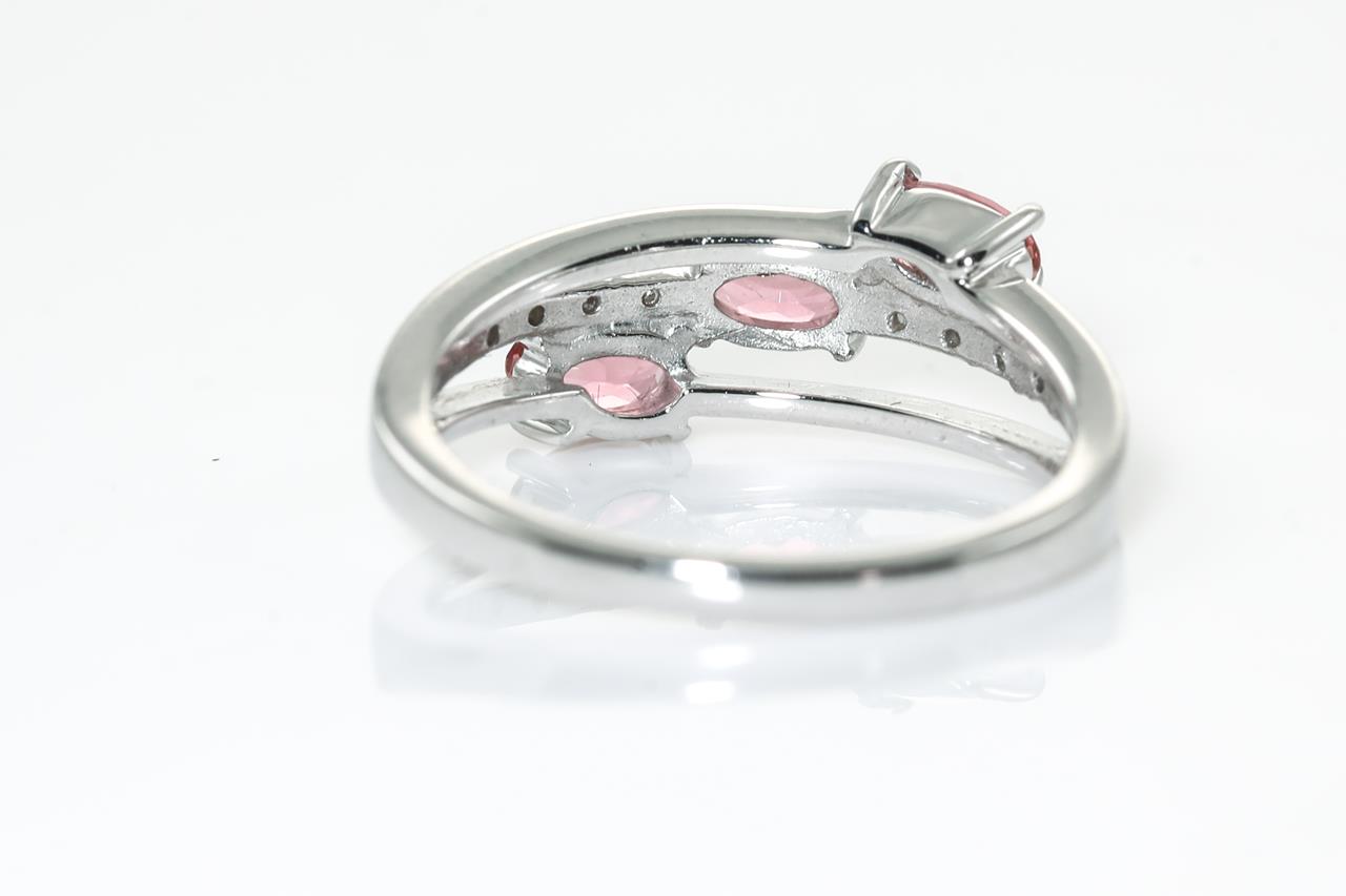 Tourmaline and Diamond ring with 3 oval pink Tourmalines totalling approximately 0.50cts and round Diamonds totalling 0.04cts. 14ct white gold. Ring size L - ring resizing is not recommended. Weight: 3.2g. (Pre-owned)