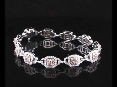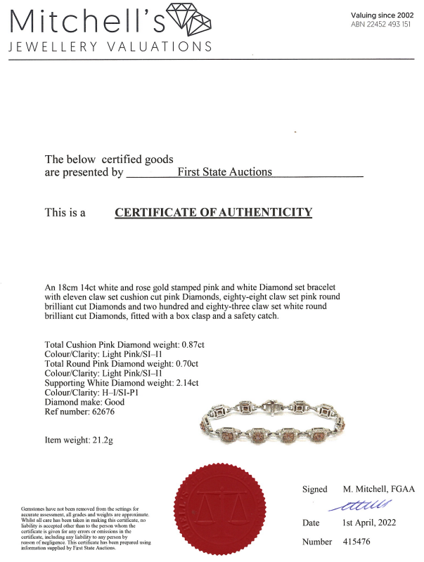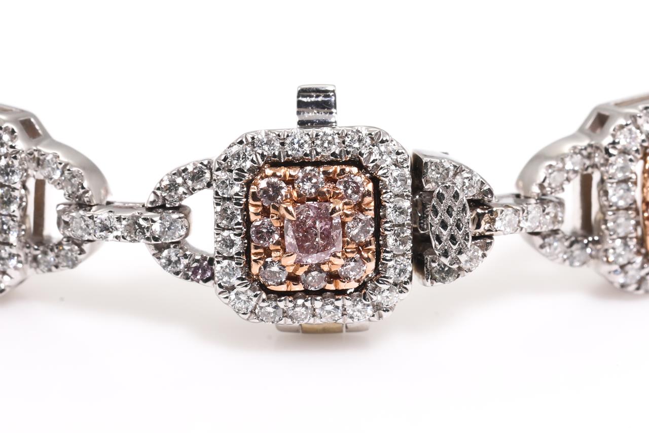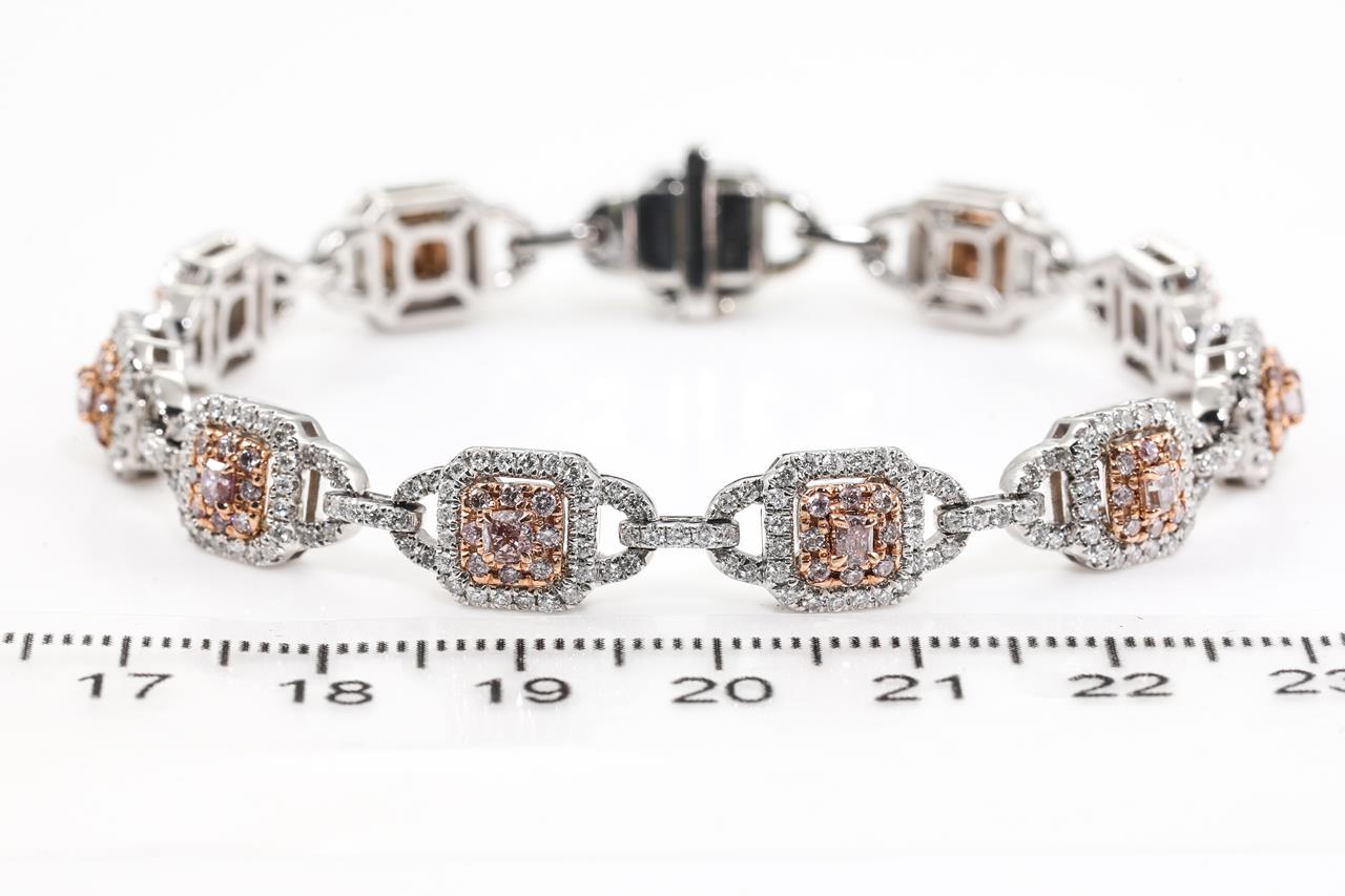 Diamond bracelet with 11 centre cushion cut Diamonds totalling 0.87cts (Estimated grading: Light Pink SI-P1) and remaining pink & white Diamonds totalling 2.84cts (Estimated grading; Light Pink-H-I SI-P1). 14ct white and rose gold. Length: 18cm. Weight: 21.2g. With certificate #415476. (As New)