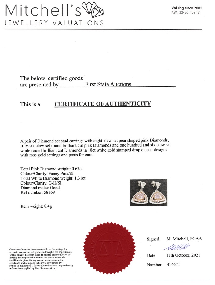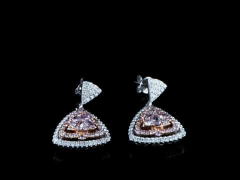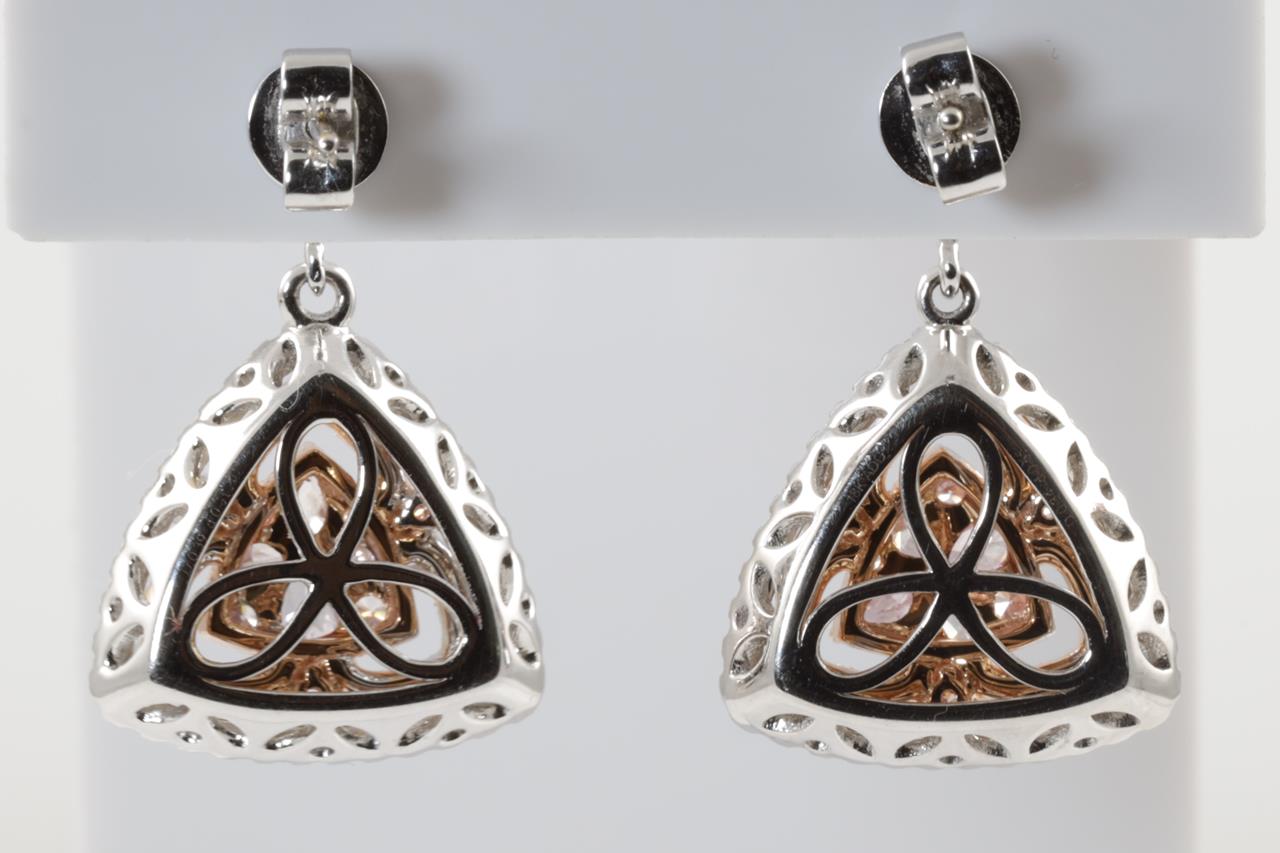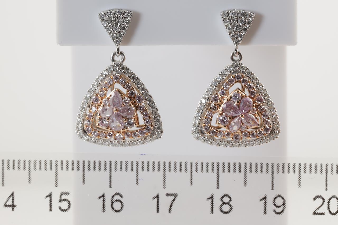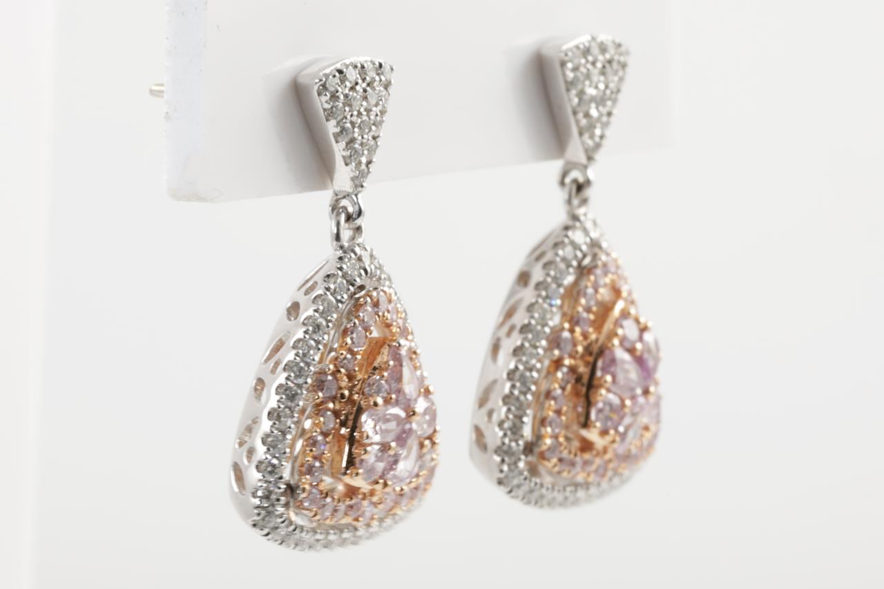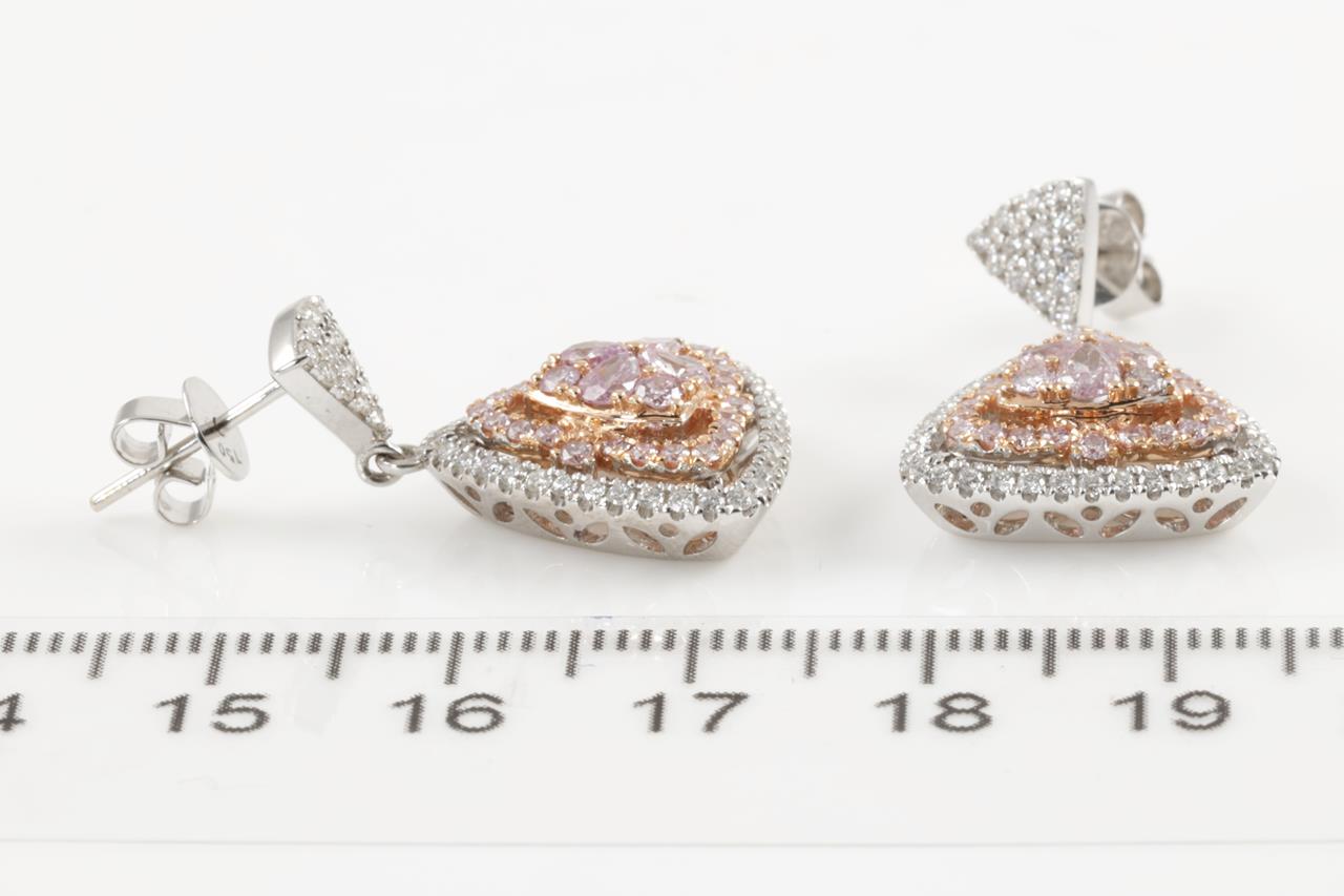 Diamond earrings with 8 centre pear shape pink & 56 round pink Diamonds totalling 0.67cts (Estimated grading: Fancy Pink SI) and remaining white Diamonds totalling 1.31cts (Estimated grading: G-H SI). 18ct white and rose gold. Weight: 8.4g With Certificate #414671. (As new)