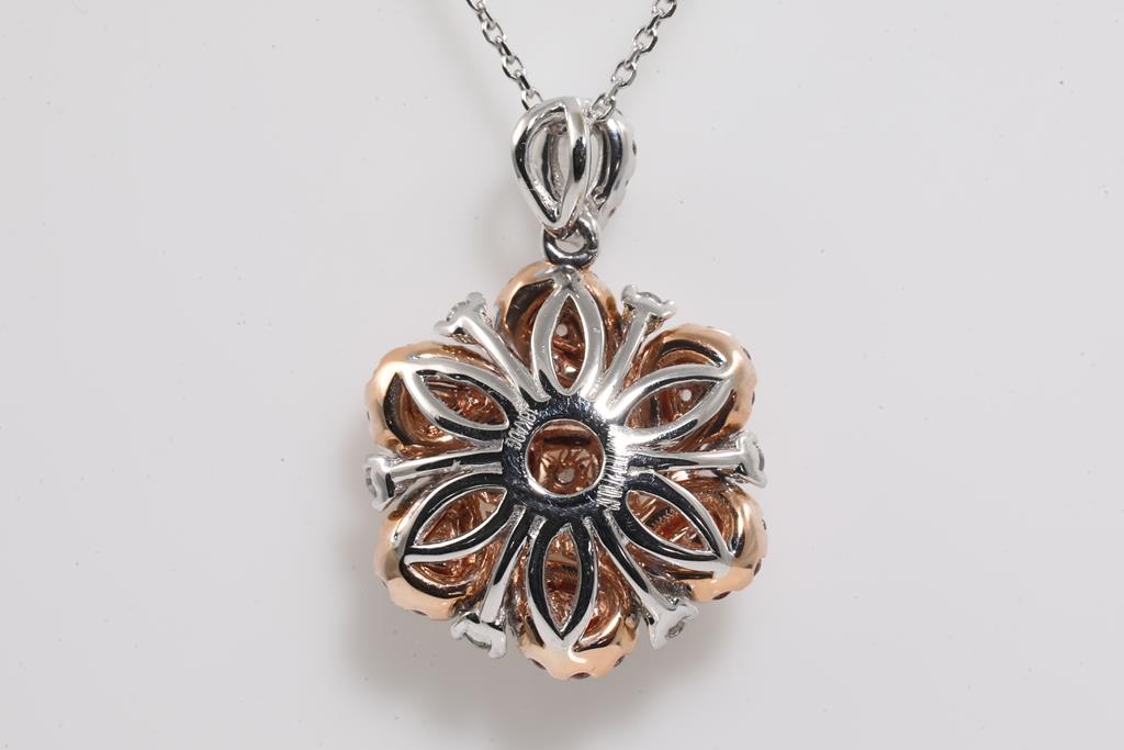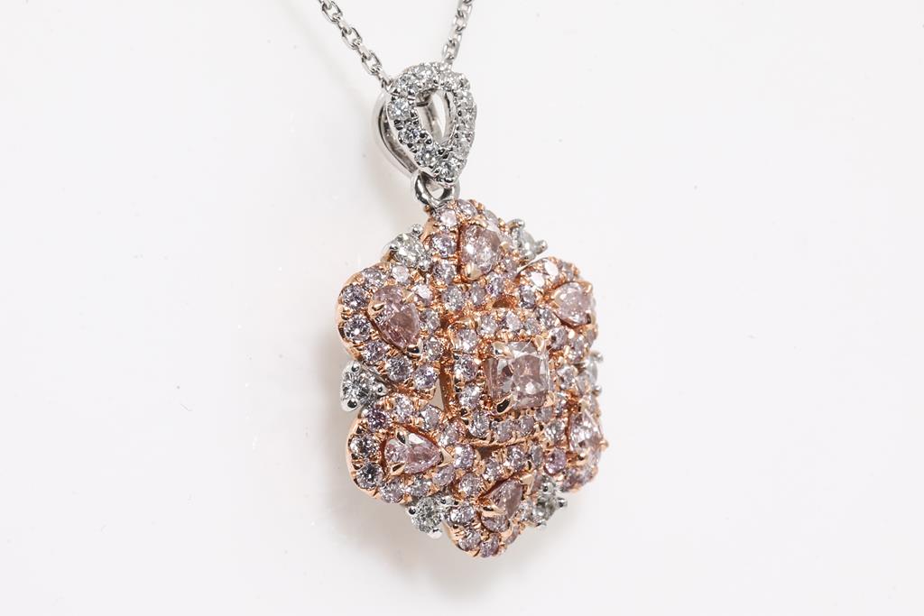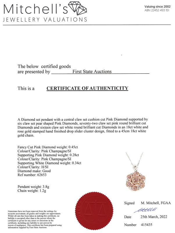 Diamond Pendant with 7 central cushion & pear shape Pink Diamonds totalling 0.45cts and remaining pink & white Diamonds totalling 0.62cts (Estimated grading: Pink Champagne SI, H SI). 18ct white & rose gold with 45cm white gold chain. Weight: 5.0g. With Certificate #415435. (As New)