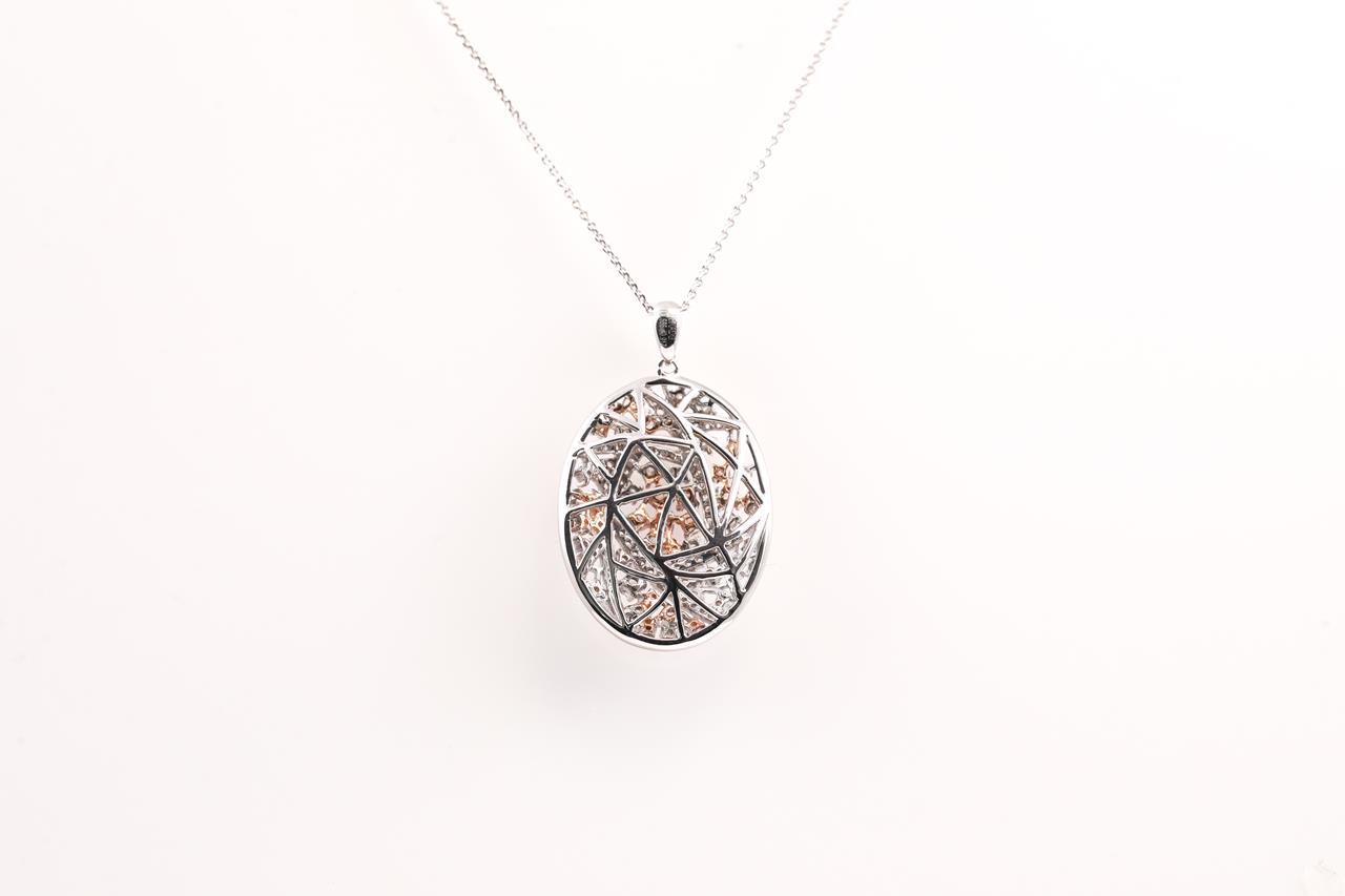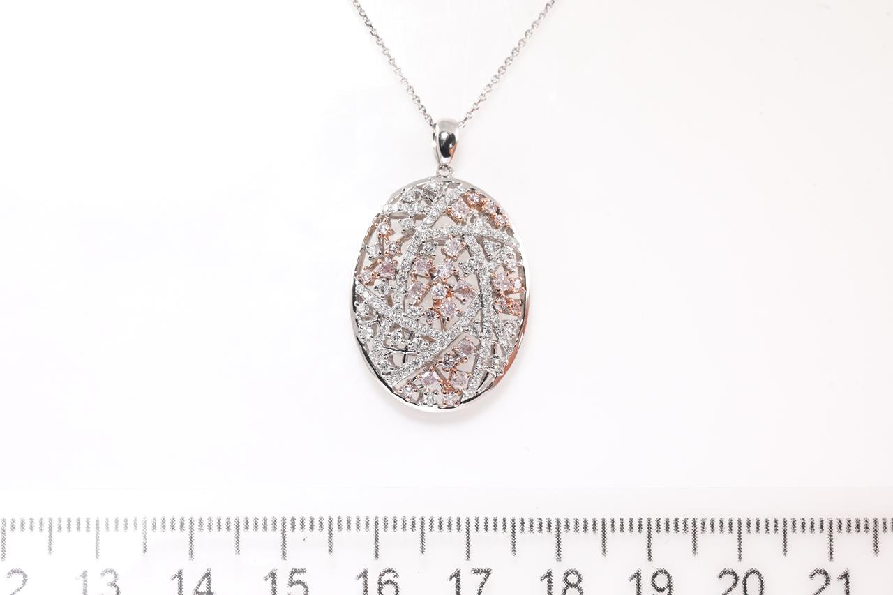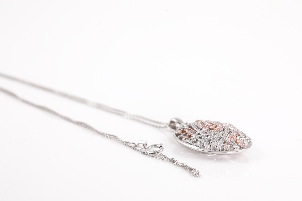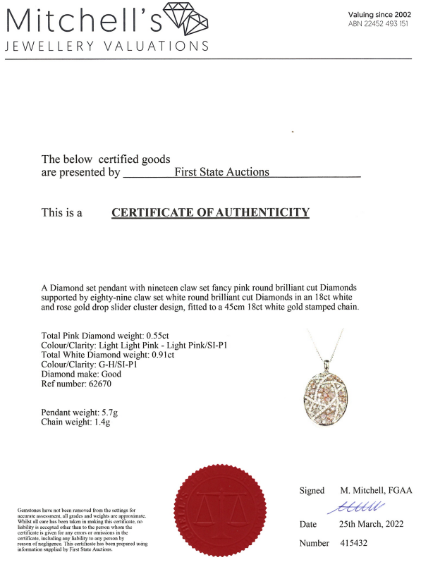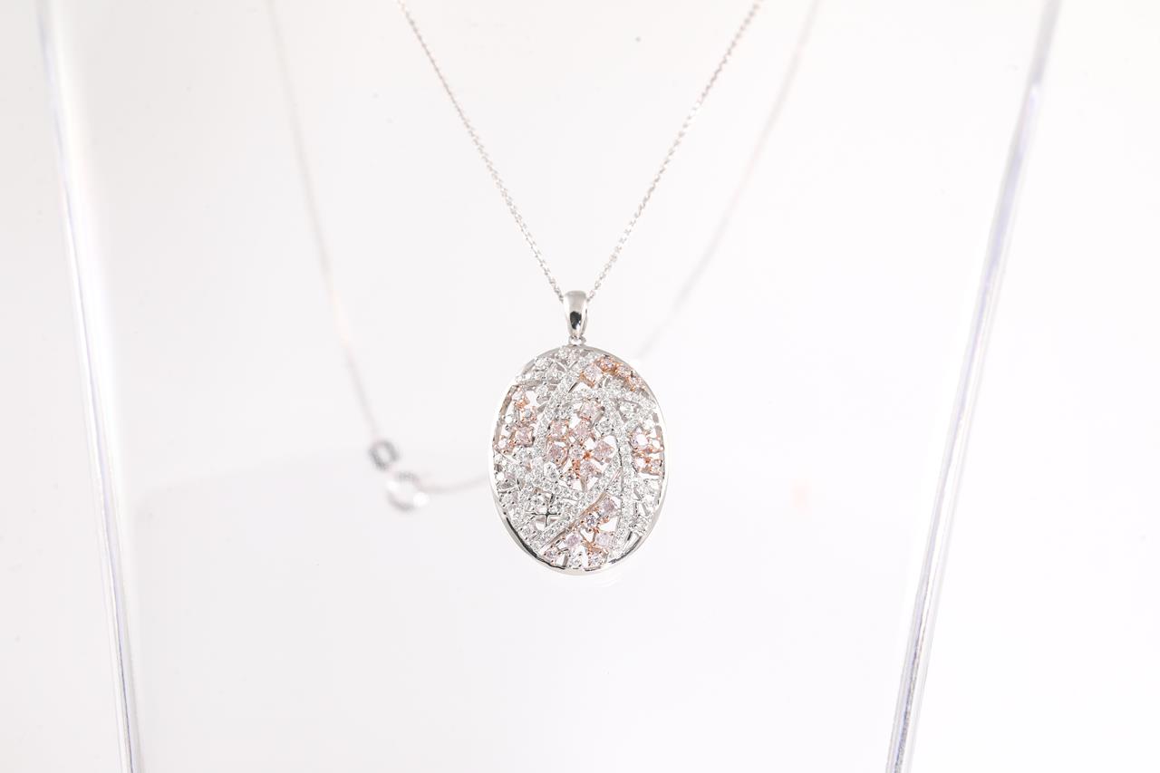 Diamond pendant with round and cushion cut pink Diamonds totalling 0.55cts (Estimated grading: Light Light Pink-Light Pink SI-P1) and white round Diamonds totalling 0.91cts (Estimated grading: G-H SI-P1). 18ct white and rose gold with 45cm white gold chain. Weight: 7.1g With Certificate #415432. (As new)