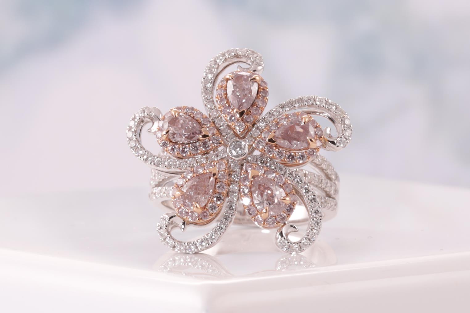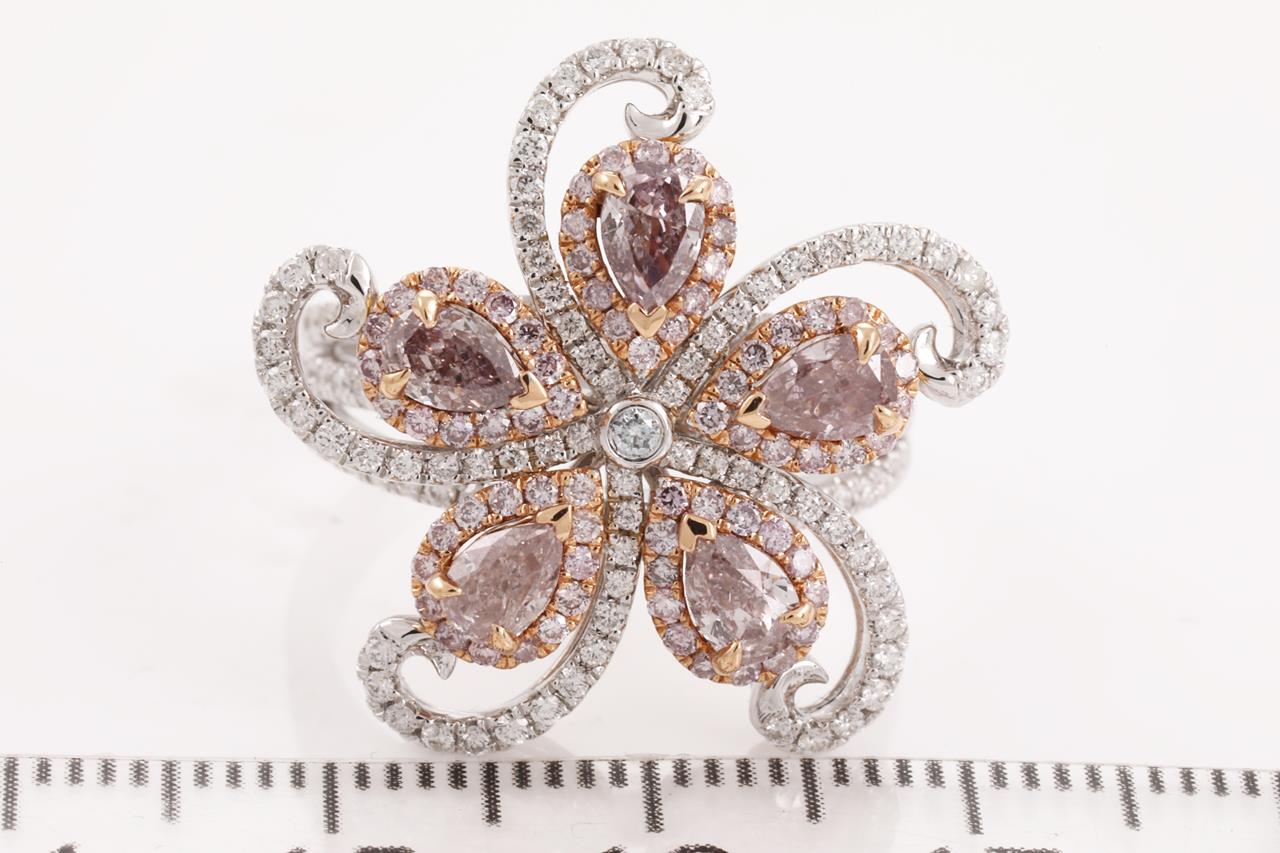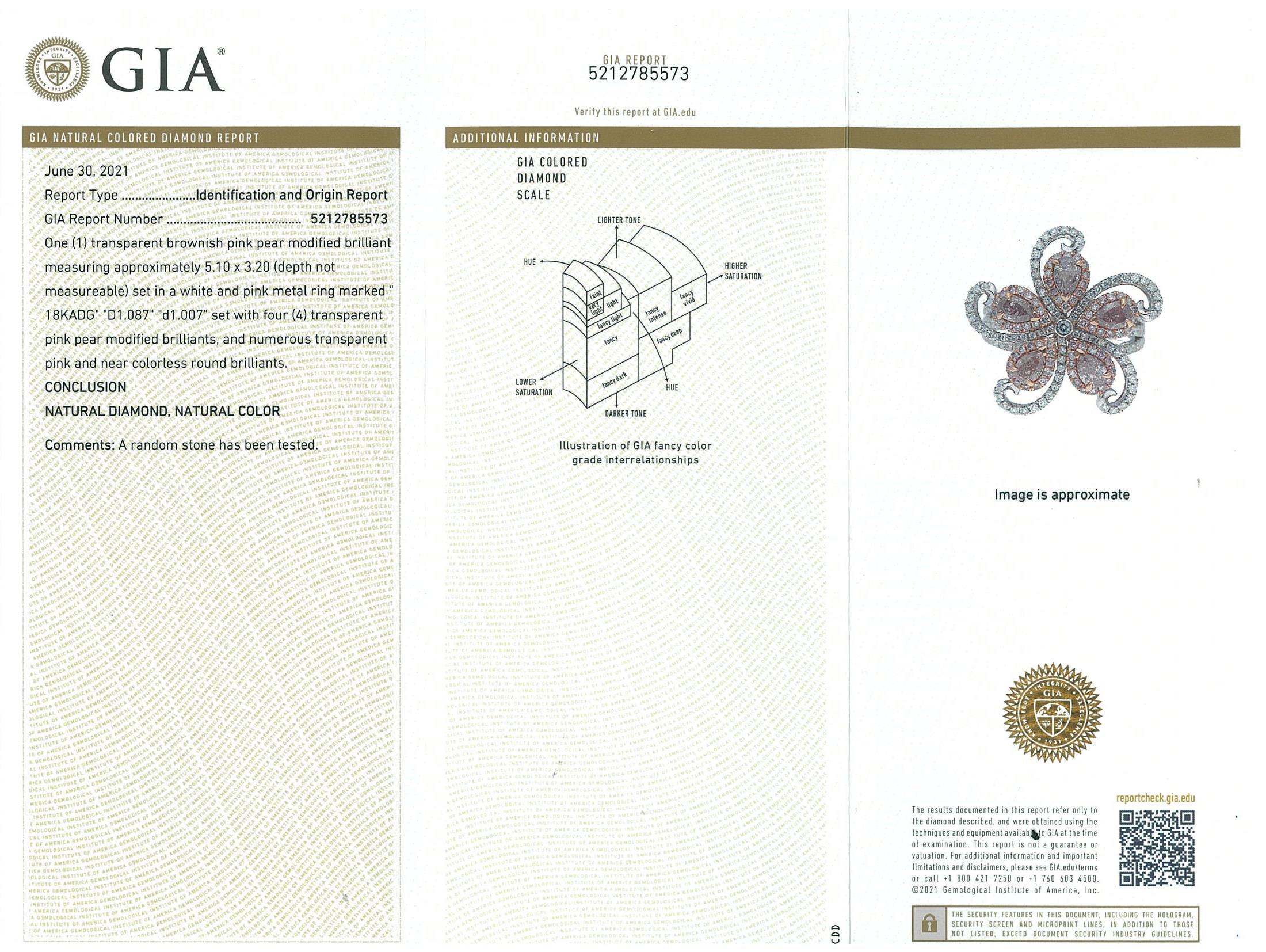 Diamond ring with 5 centre pear shape natural brownish pink Diamonds totalling 1.08cts (Estimated grading: Brownish Pink P1) and remaining pink & white Diamonds totalling 1.00cts (Estimated grading: H-I SI-P2, Pink SI-P1). 18ct rose & white gold. Ring size N - ring resizing is not recommended. Weight: 9.8g. With GIA report #5212785573. (As new)