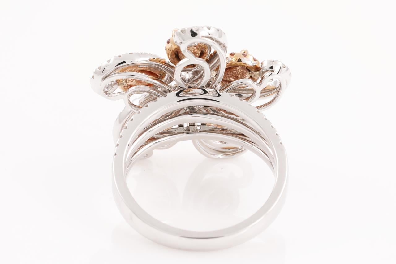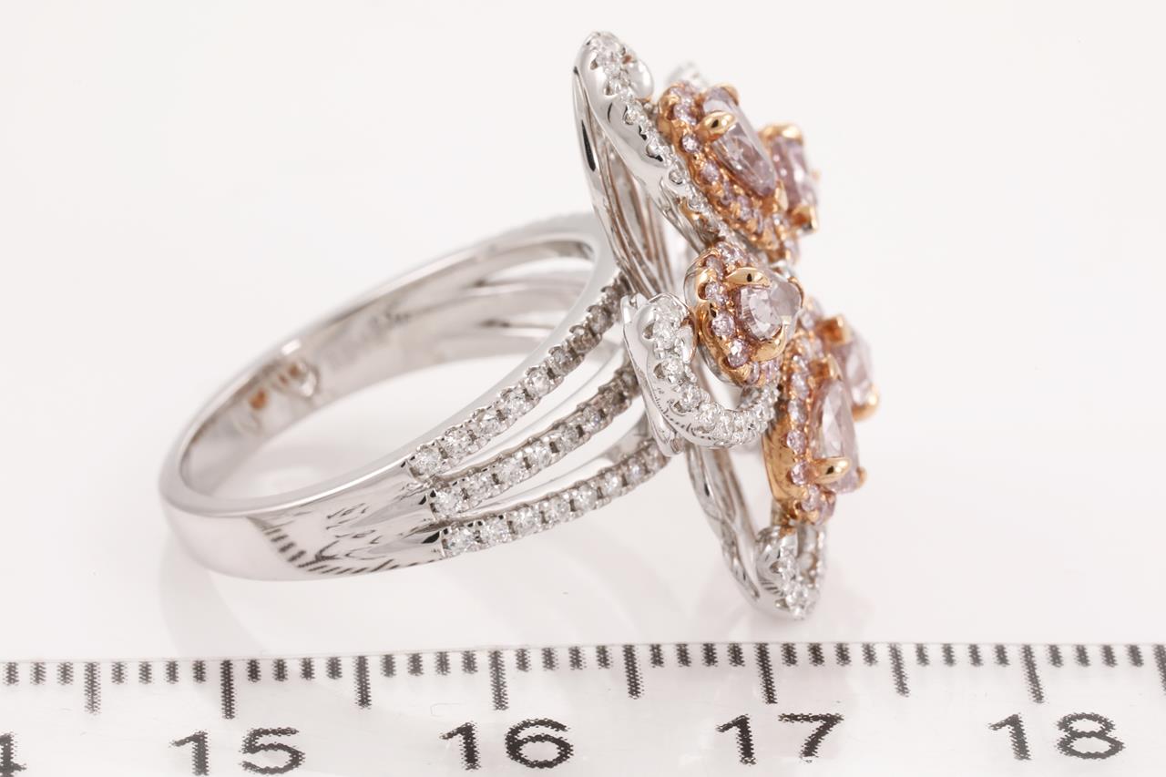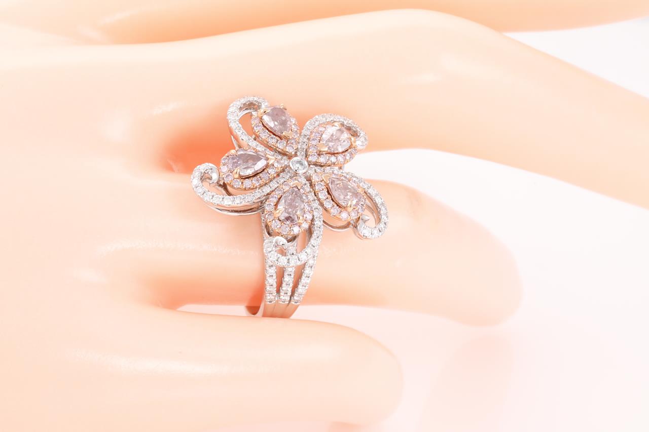 Diamond ring with 5 centre pear shape natural brownish pink Diamonds totalling 1.08cts (Estimated grading: Brownish Pink P1) and remaining pink & white Diamonds totalling 1.00cts (Estimated grading: H-I SI-P2, Pink SI-P1). 18ct rose & white gold. Ring size N - ring resizing is not recommended. Weight: 9.8g. With GIA report #5212785573. (As new)