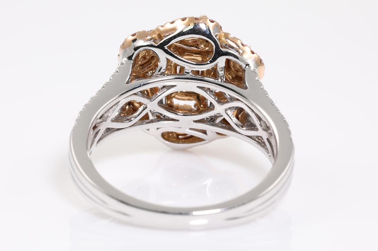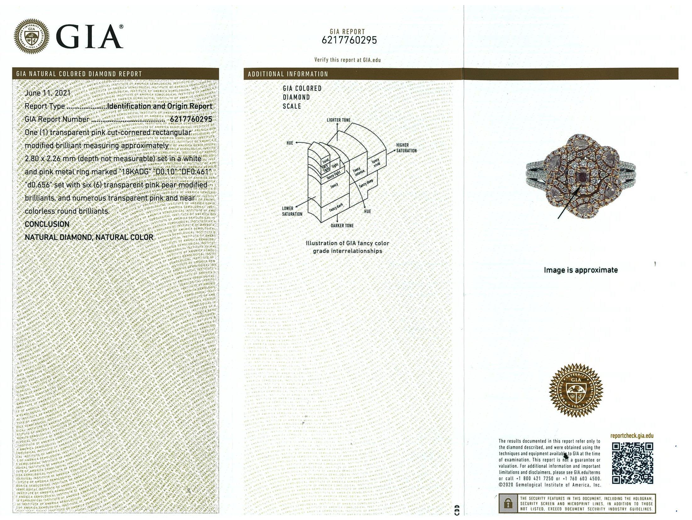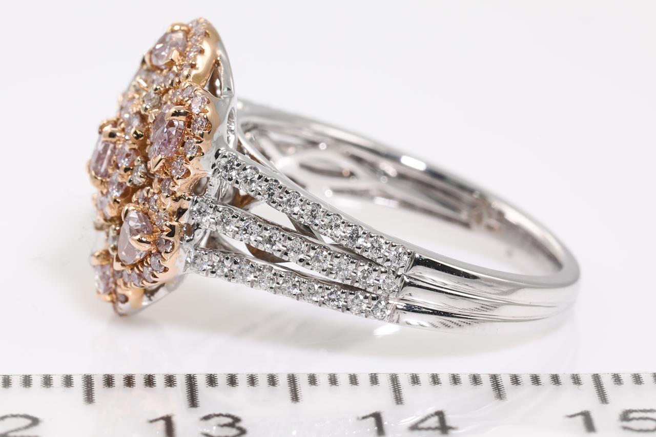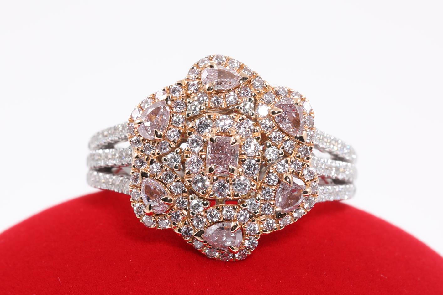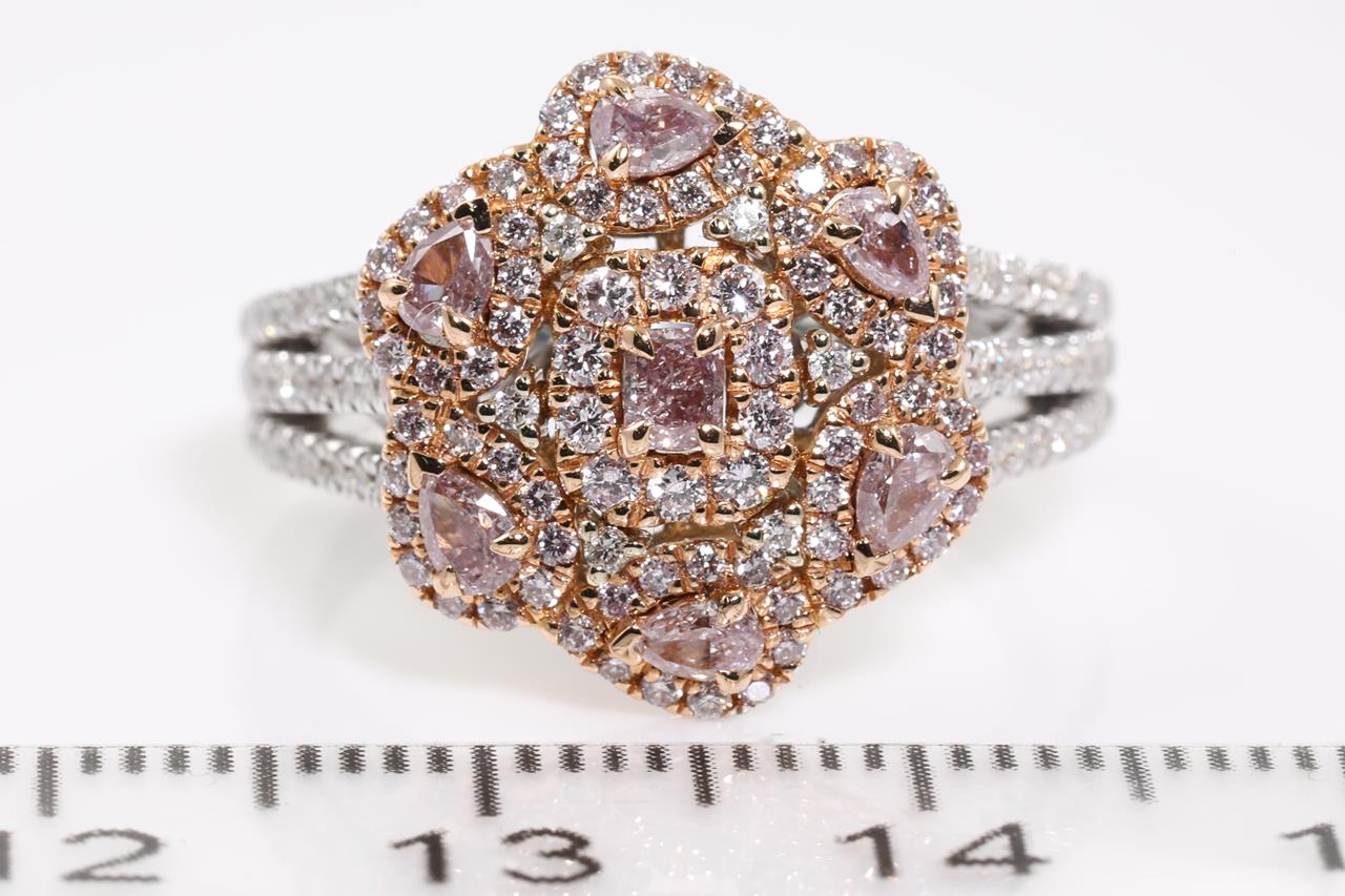 Diamond ring with 7 centre natural pink Diamonds totalling 0.56cts and remaining pink & white Diamonds totalling 0.65cts. 18ct rose & white gold. Ring size N - ring resizing is not recommended. Weight: 7.4g. With GIA report #6217760295. (As new)