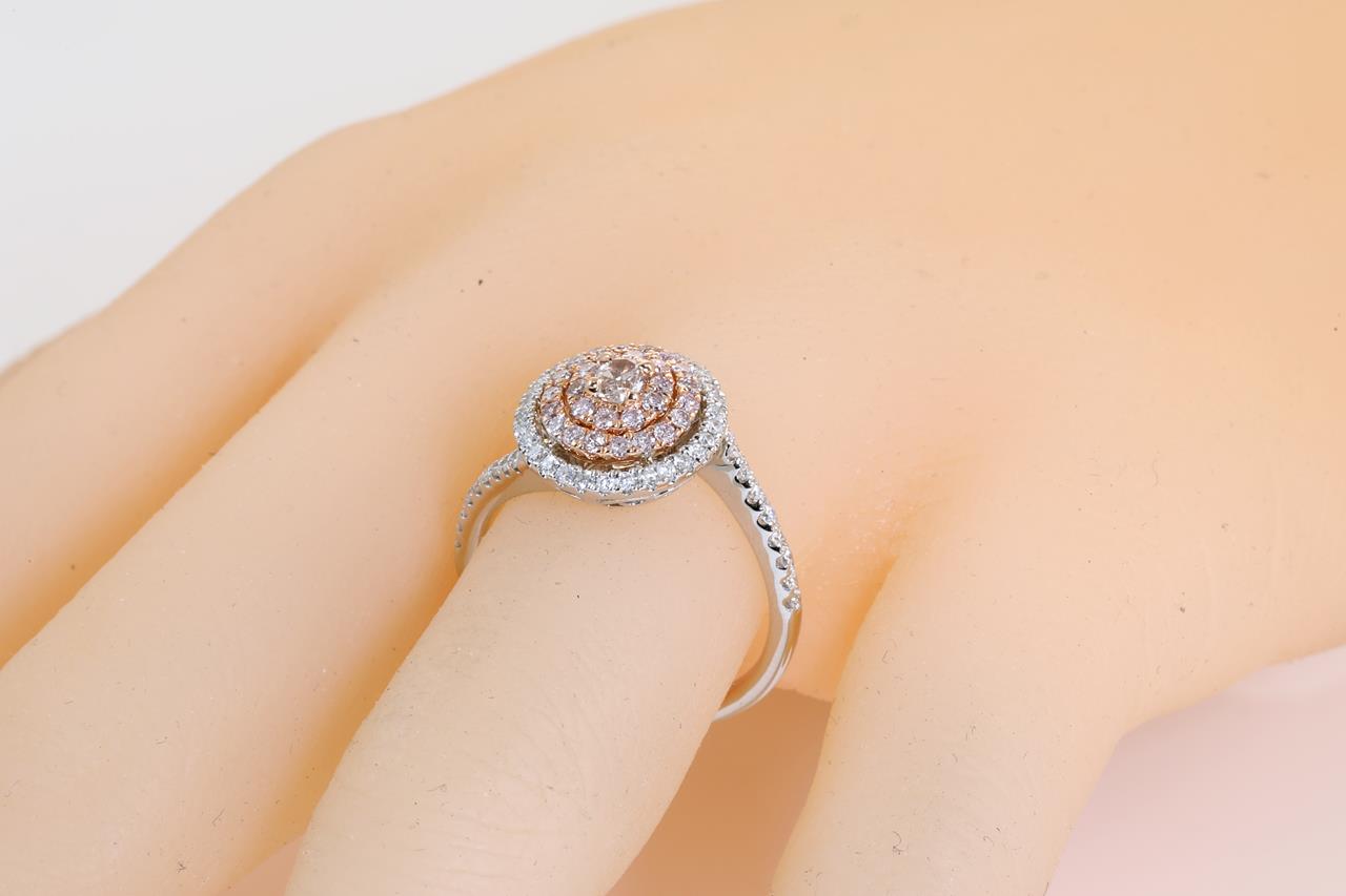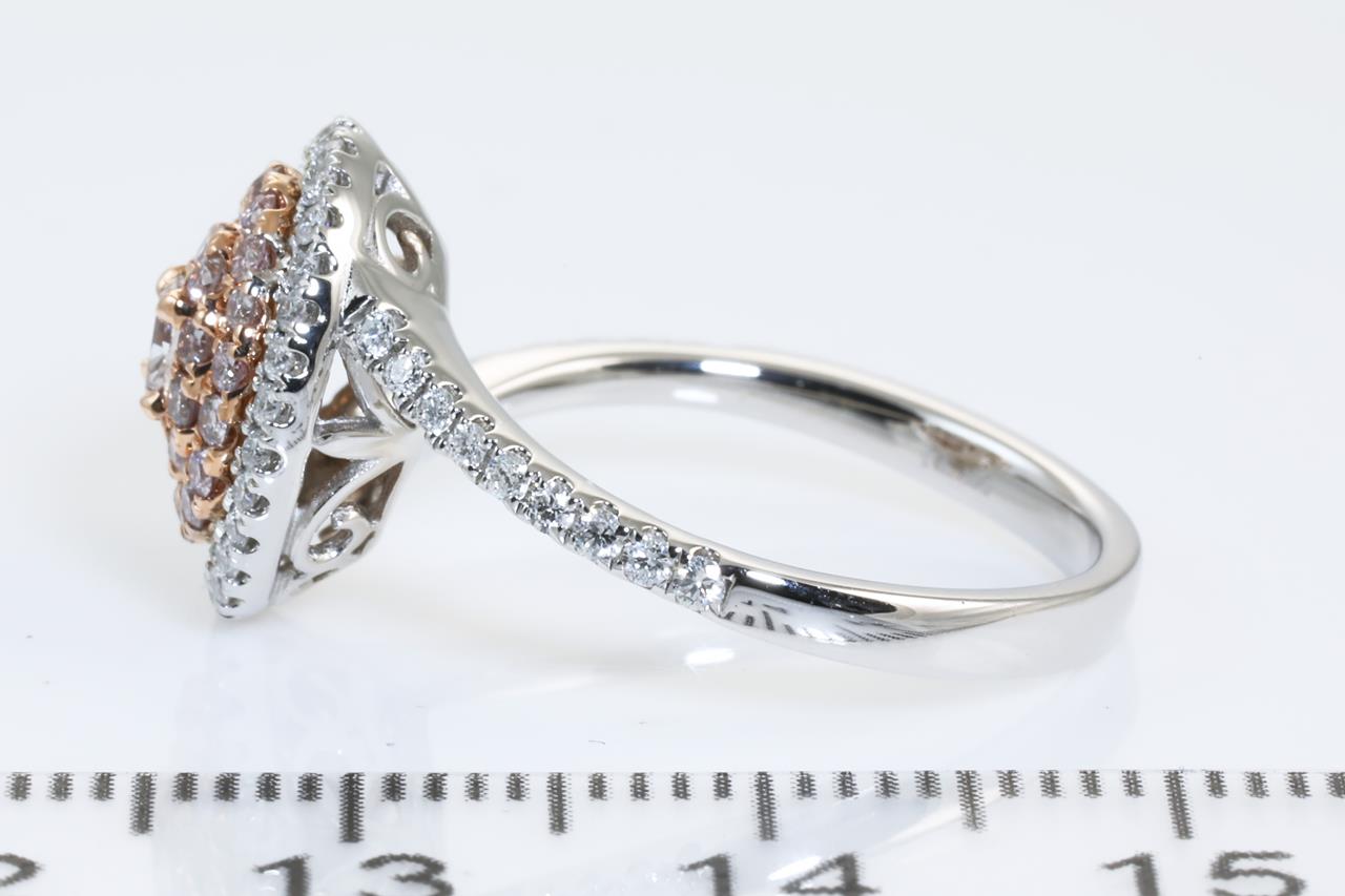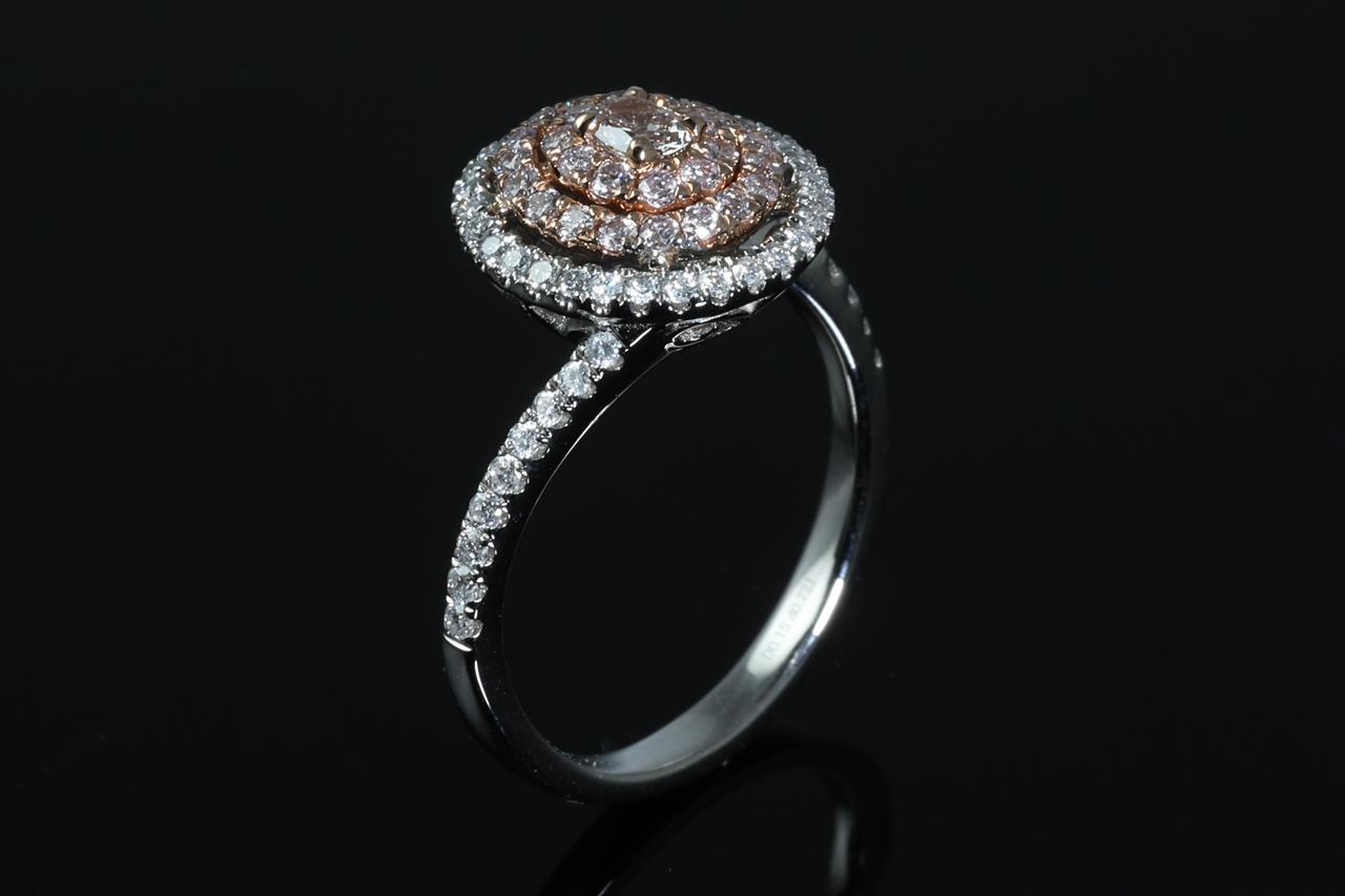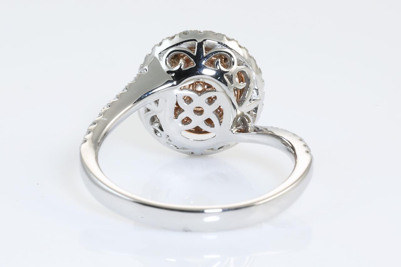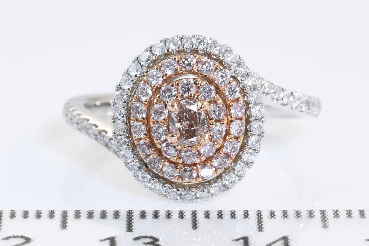 Diamond halo ring with a centre oval shape Diamond of 0.15ct and remaining Diamonds totalling 0.72cts (Estimated grading: Light Pink SI; G SI). 14ct rose & white gold. Ring size N. Weight: 4.1g. (As new)