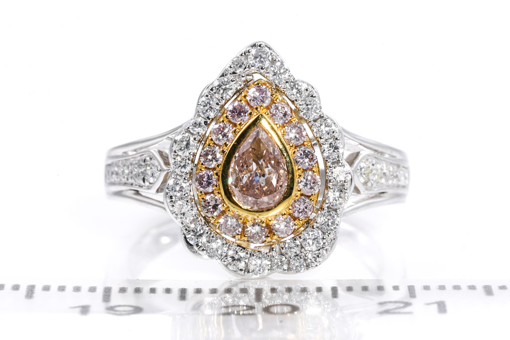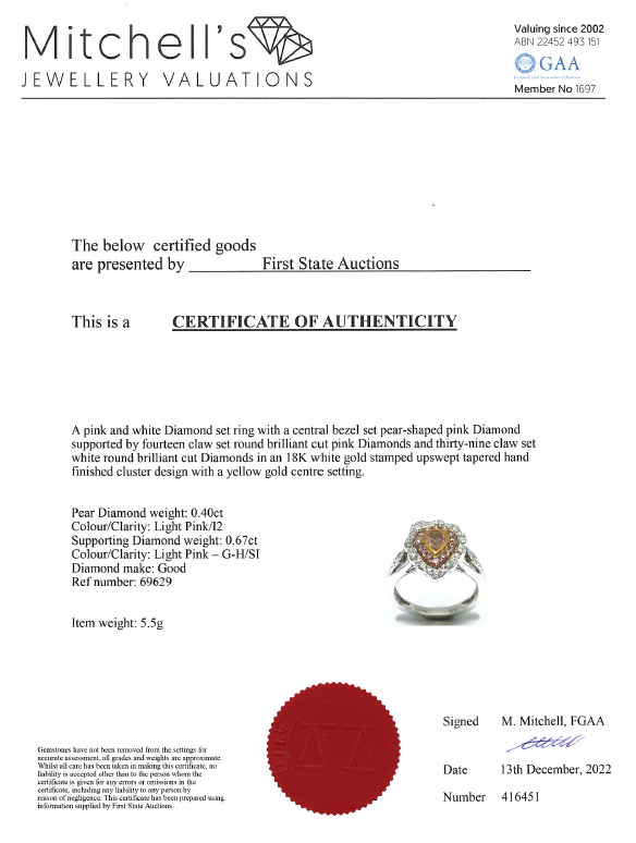Diamond dress ring with pear shape light Pink Diamond of 0.40ct (Estimated grading: Light Pink P2) and surrounding round Diamonds totalling 0.67cts (Estimated grading: Light Pink & G-H SI). 18ct white and yellow gold. Ring size N - ring resizing is not recommended. Weight: 5.5g. With certificate #416451. (As new)