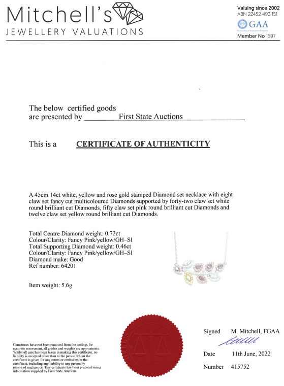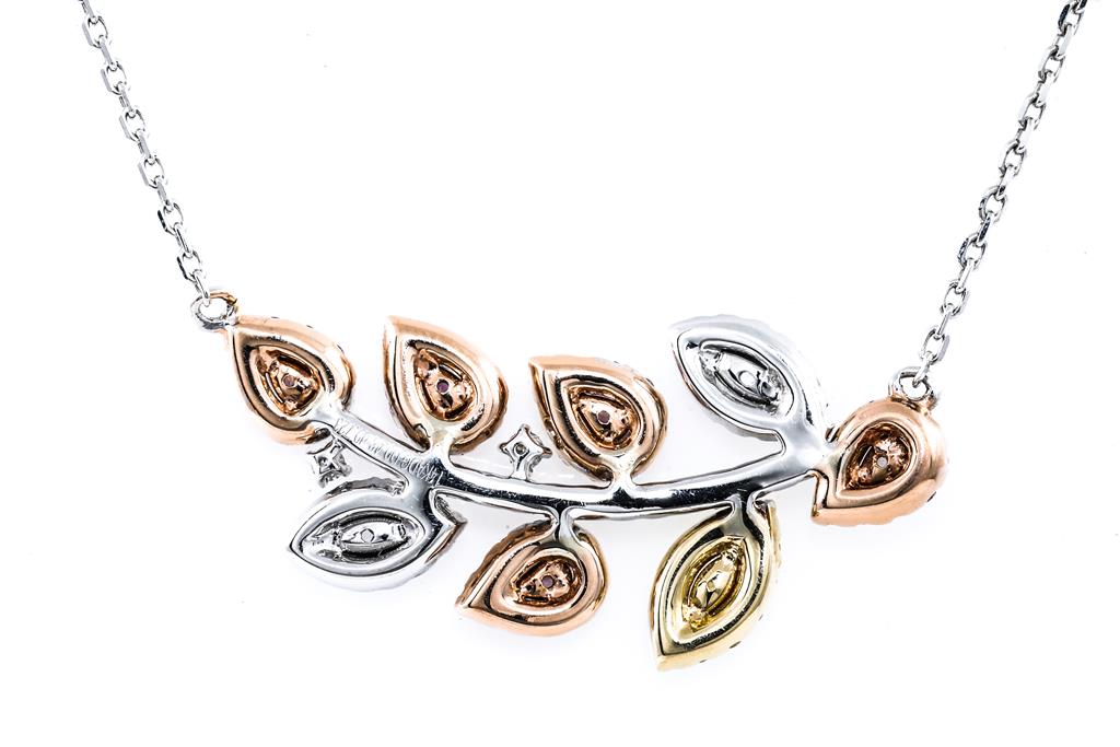Diamond necklace with marquise & pear shape Diamonds totalling 0.72cts (Estimated grading: Fancy Pink-Yellow-GH SI) and remaining round Diamonds totalling 0.46cts (Estimated grading: Fancy Pink-Yellow-GH SI). 14ct yellow, white and rose gold with 14ct white gold attached chain. Adjusatble max length: 45cm. Weight: 5.6g. With Certificate #415752. (As new)