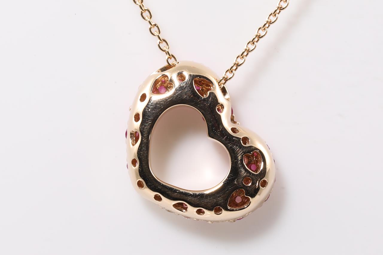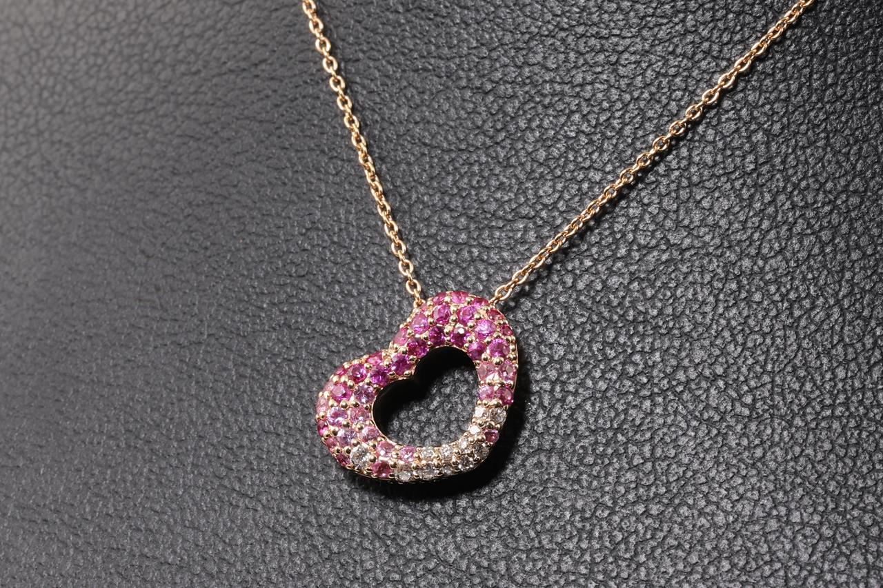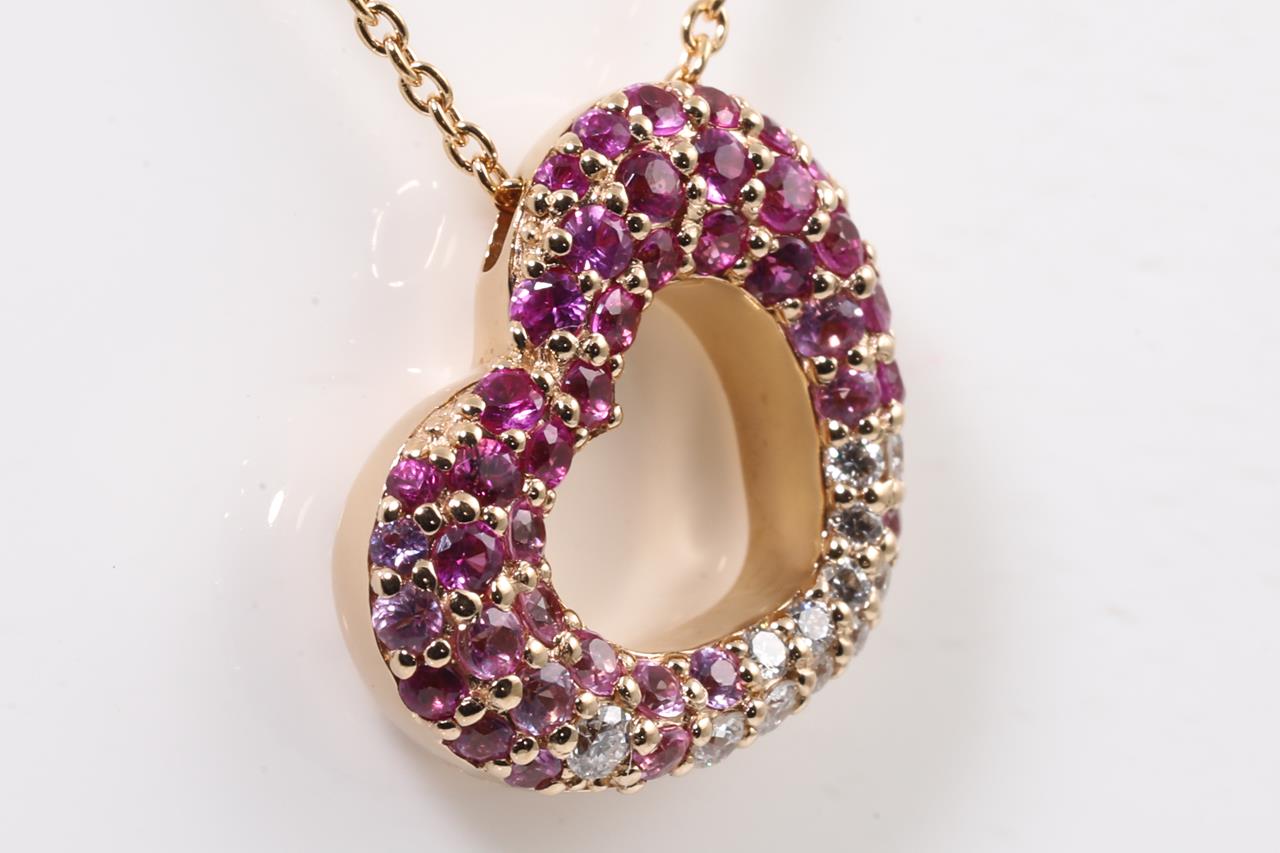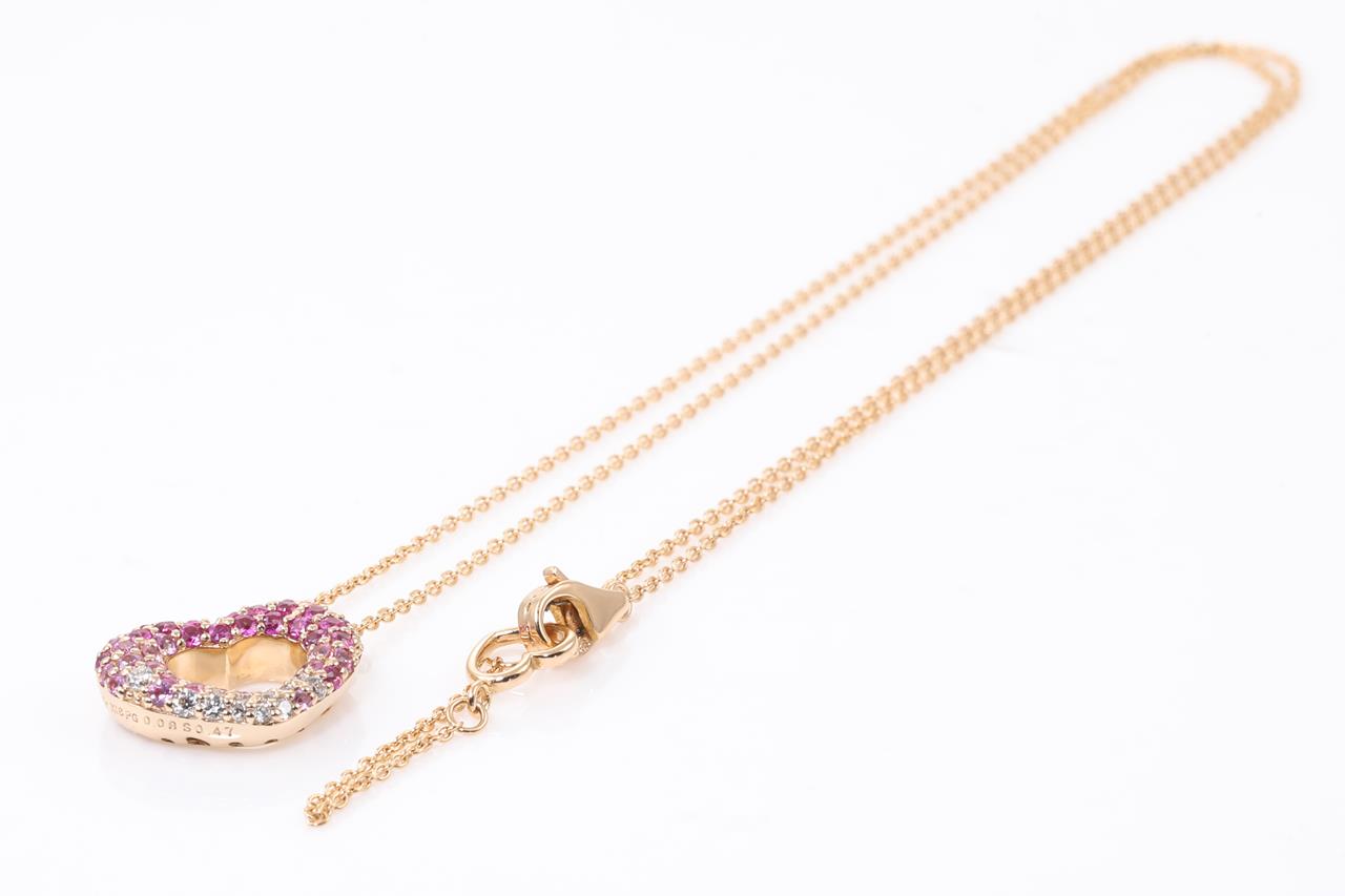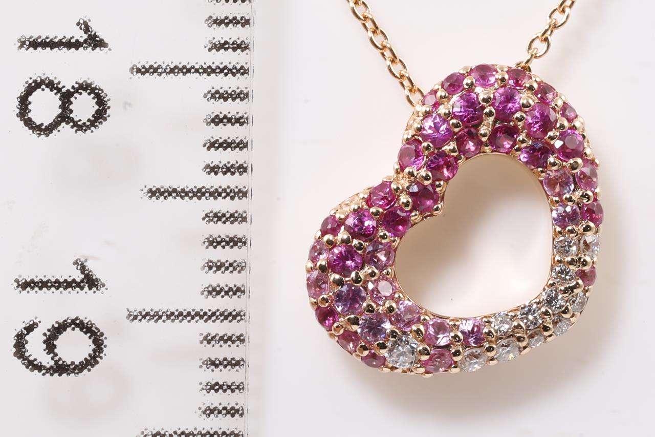 Ponte Vecchio heart pendant with pink Sapphires totalling 0.47cts and Diamonds totalling 0.08cts. 18ct rose gold with adjustable 40cm chain. Weight: 3.5g (Pre-owned)
