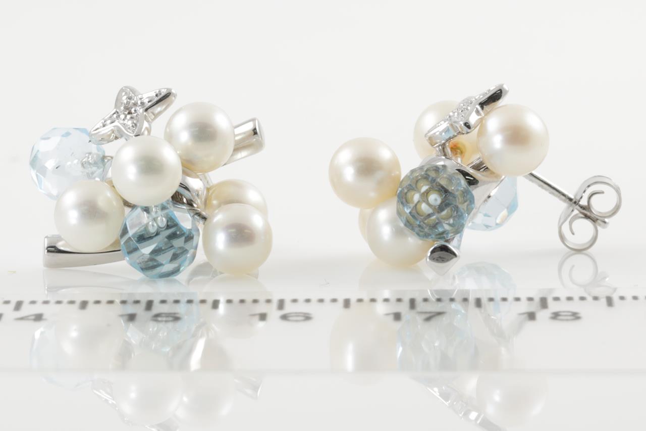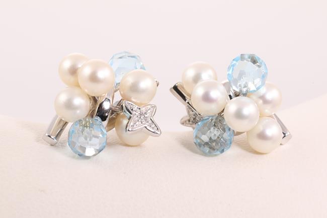 Ponte Vecchio earrings with cultured Pearls of 5.5mm, Topaz beads and Diamonds totalling 0.02cts. 18ct white gold with unbranded backs. Weight: 10.5g. (Pre-owned)