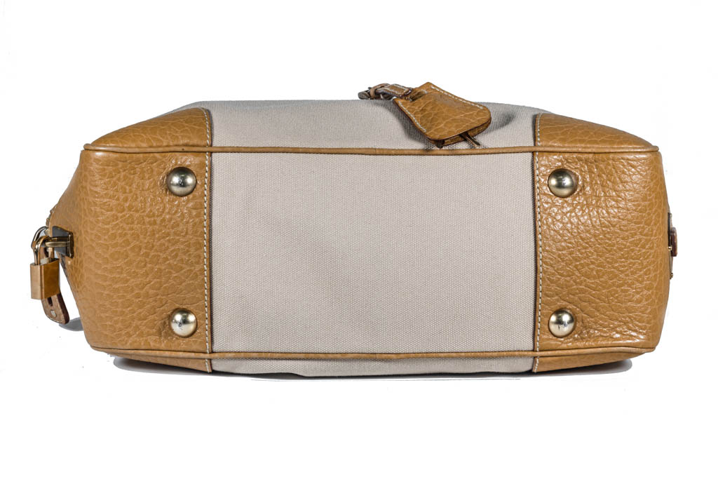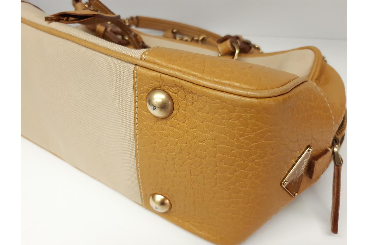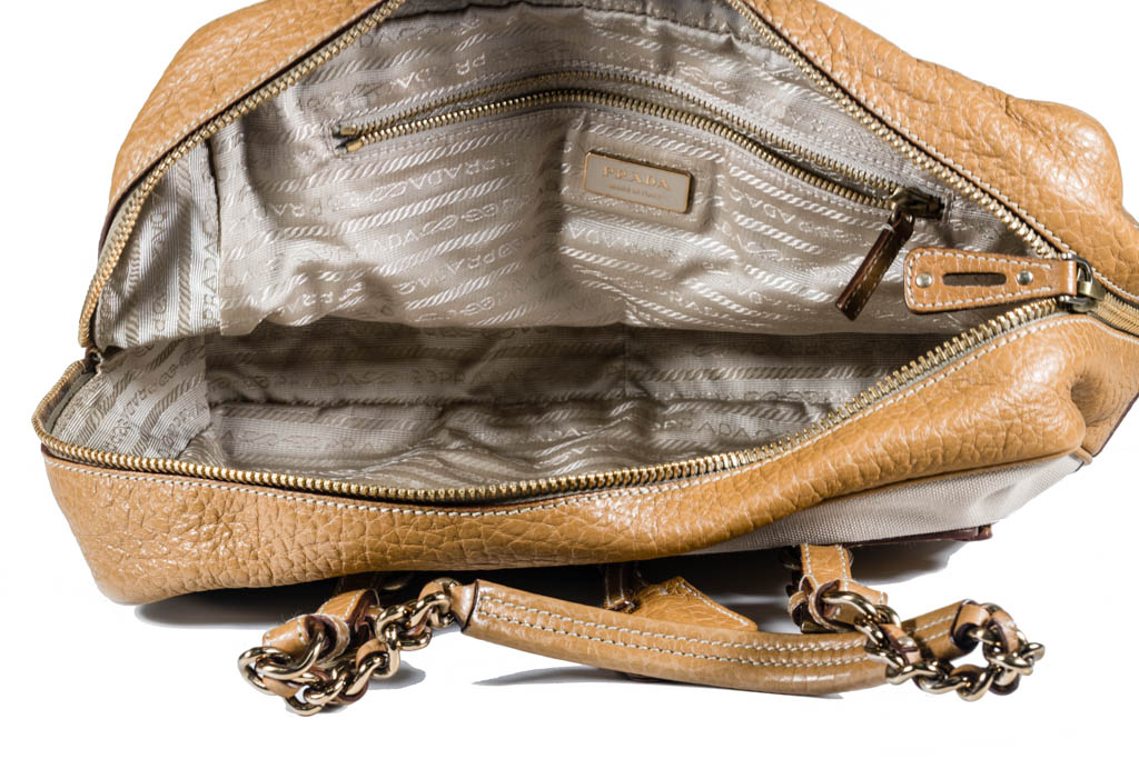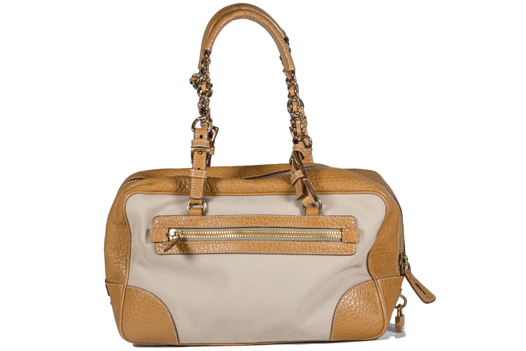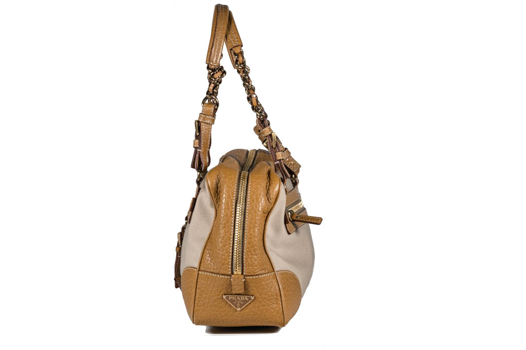 Prada shoulder bag in beige canvas and light brown full-grain leather. Featuring gold-tone hardware, two zipped pocekts exterior, lockable top zip closure opens to Prada jacquard beige fabric-lined interior with single zipped pocket. Approximate dimensions: 32cm(W) x 17cm(H) x 11cm(D), 23cm chain-leather handle drop height. Accompanied by padlock, clochette, keys and Prada dust bag. With Entrupy Certificate of Authenticity. (Pre-owned)