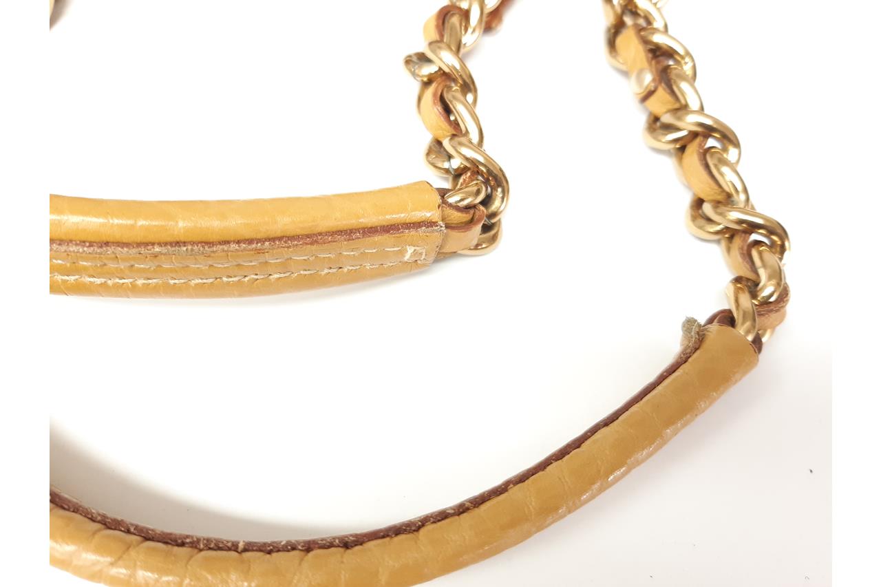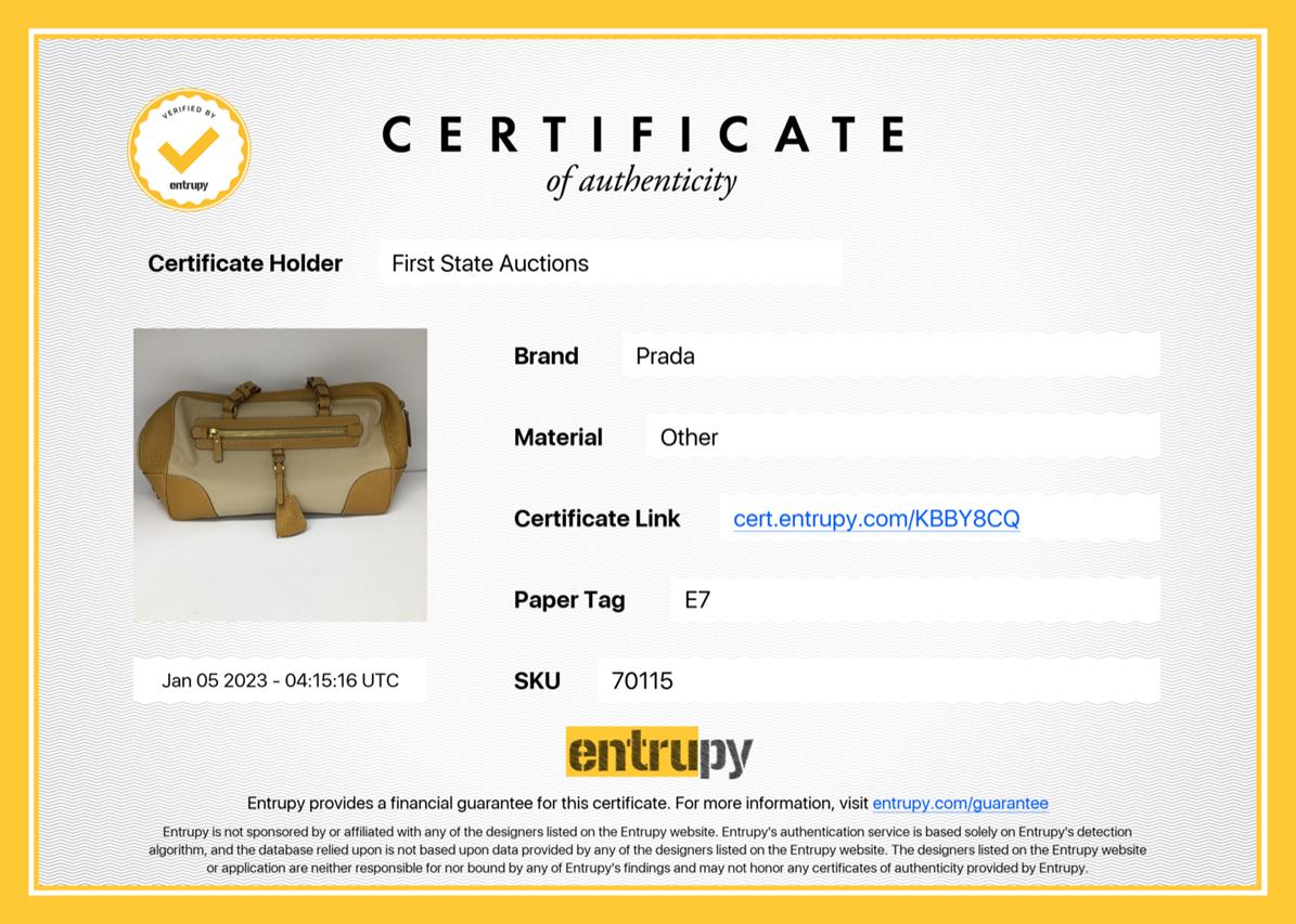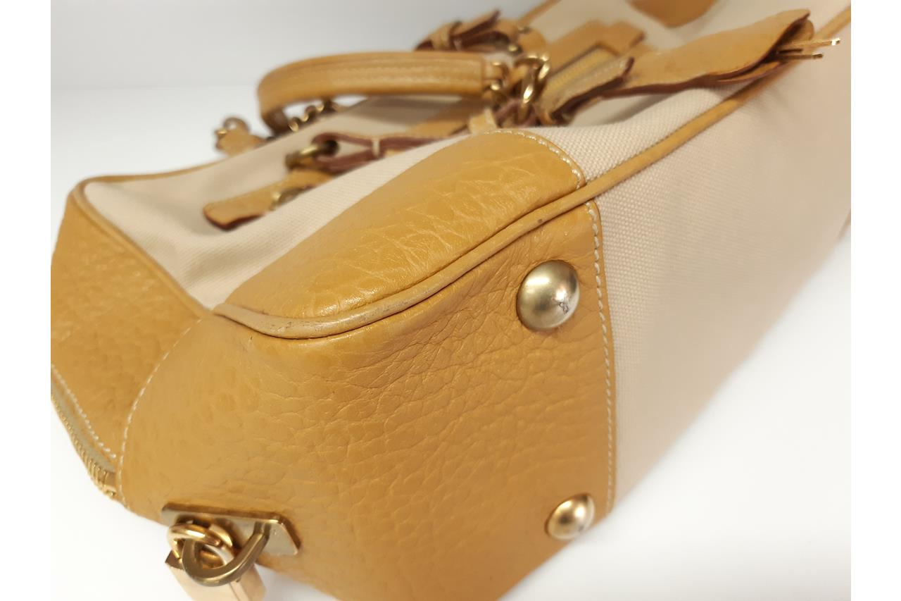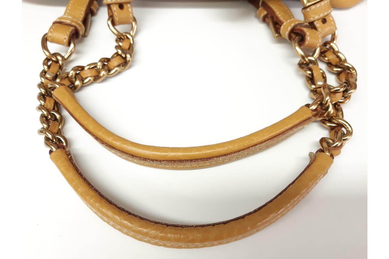 Prada shoulder bag in beige canvas and light brown full-grain leather. Featuring gold-tone hardware, two zipped pocekts exterior, lockable top zip closure opens to Prada jacquard beige fabric-lined interior with single zipped pocket. Approximate dimensions: 32cm(W) x 17cm(H) x 11cm(D), 23cm chain-leather handle drop height. Accompanied by padlock, clochette, keys and Prada dust bag. With Entrupy Certificate of Authenticity. (Pre-owned)