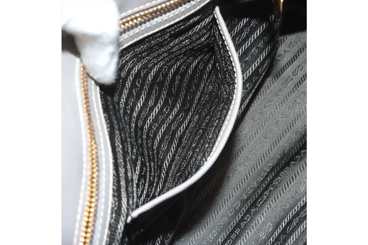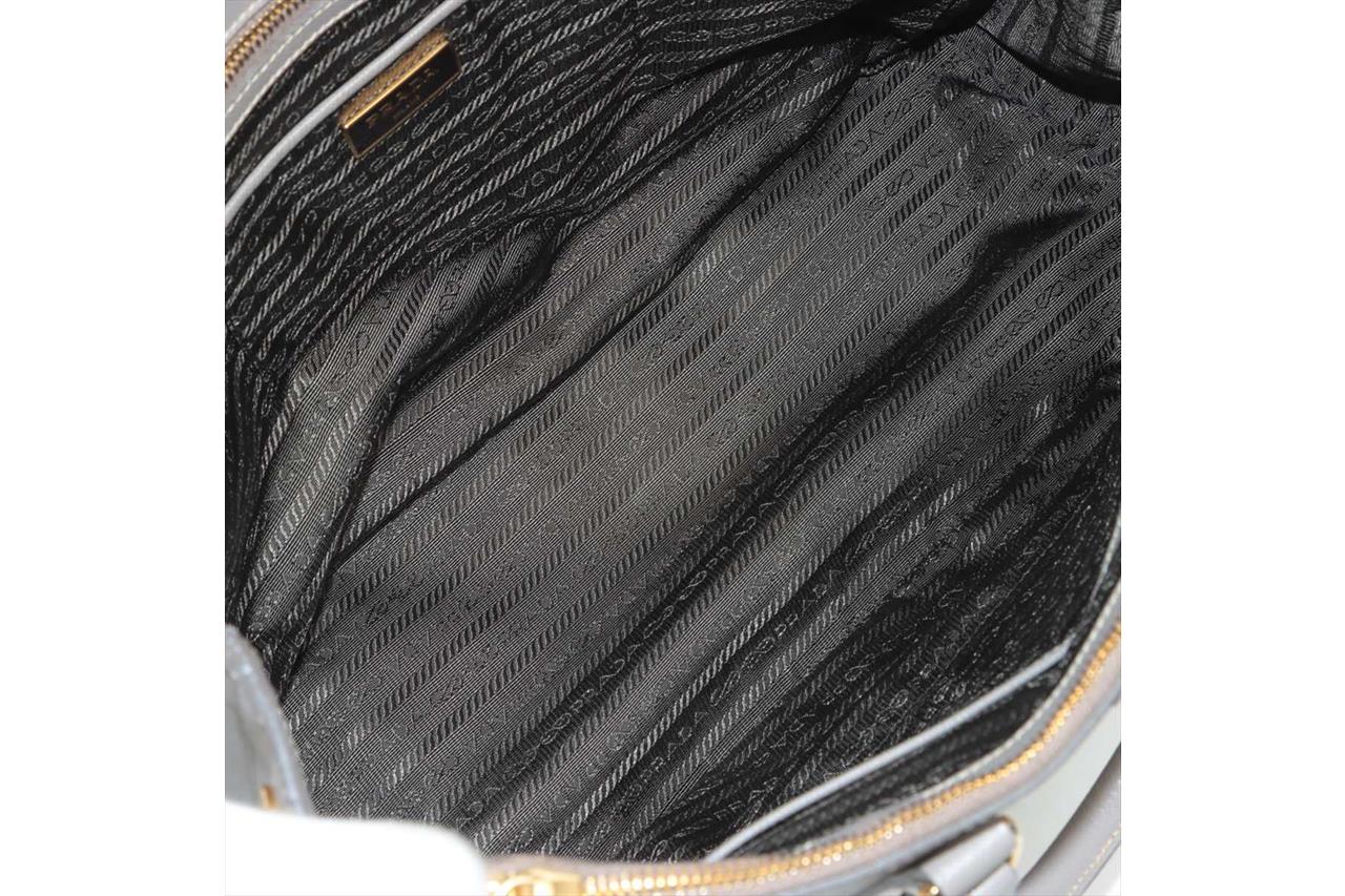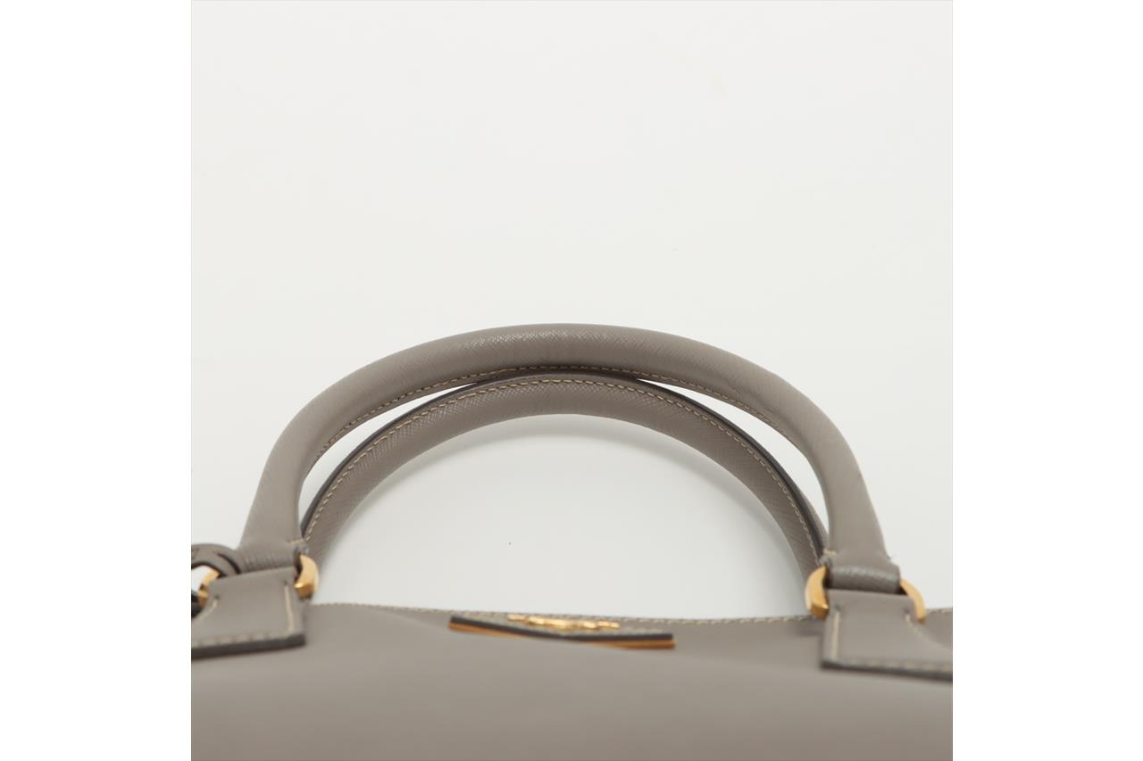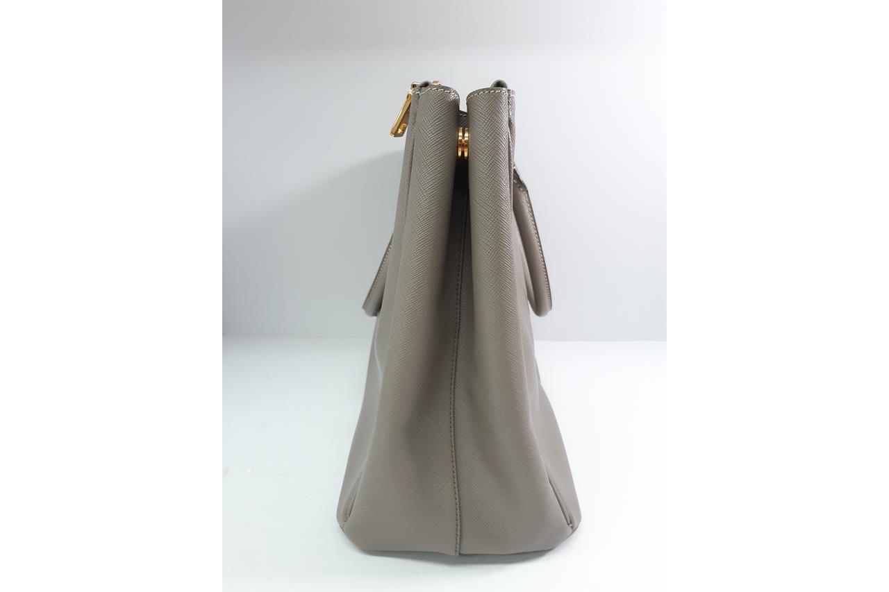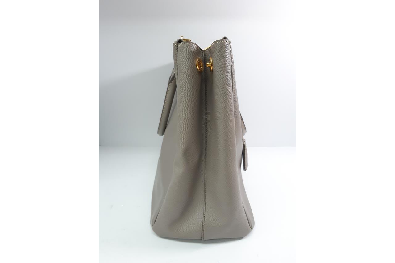 Prada Galleria large bag in grey Saffiano leather. Featuring two external zipper pockets, gold-toned hardware, snap closure on the sides. The top opens to a logo-print nylon lining interior with pockets. Approximate dimensions: 35.5cm(W) x 26cm(H) x 15.5cm(D), 12cm handle drop and 53cm adjustable and removable strap drop. Accompanied by leather key ring and Prada dust bag. With Entrupy Certificate of Authenticity. (Pre-owned)