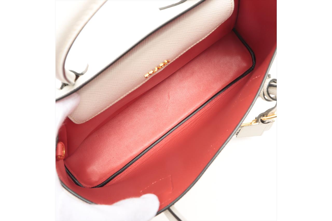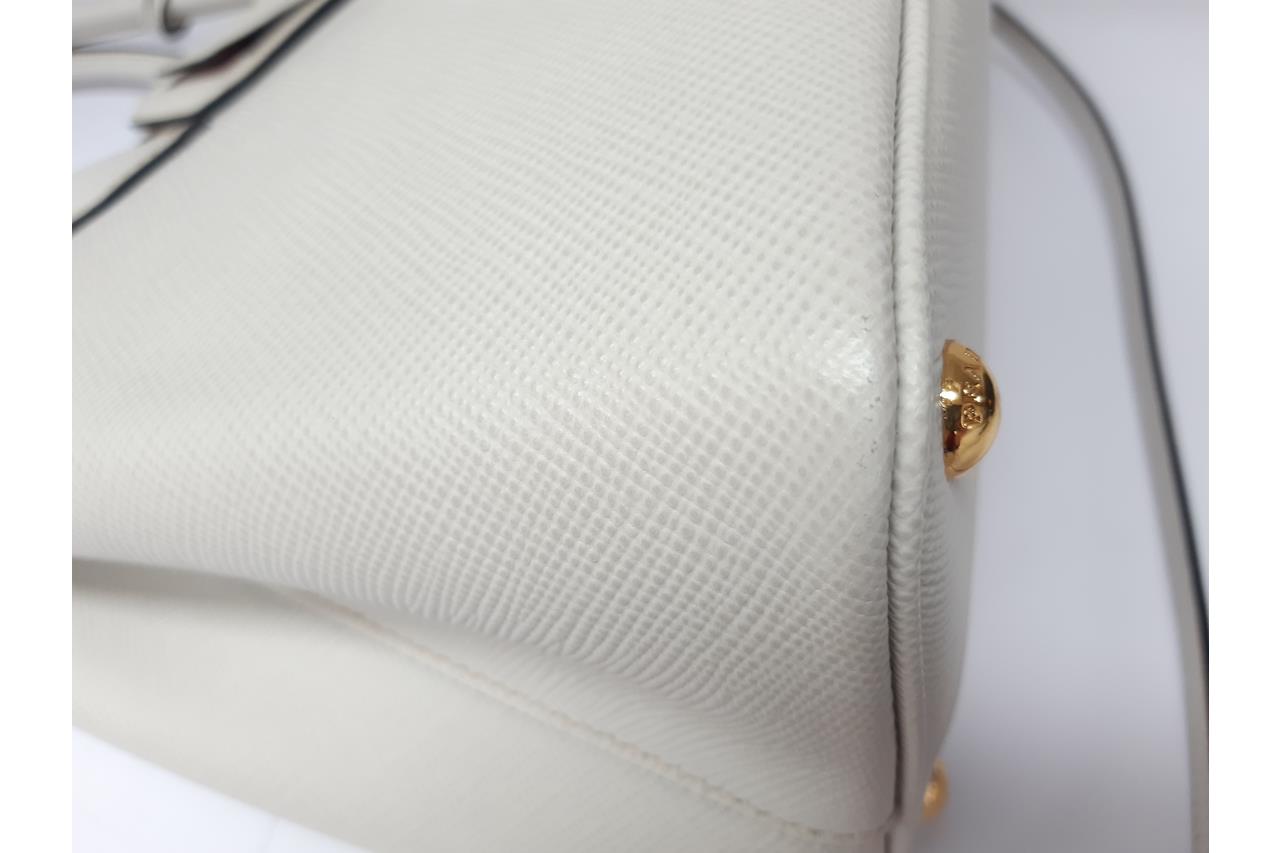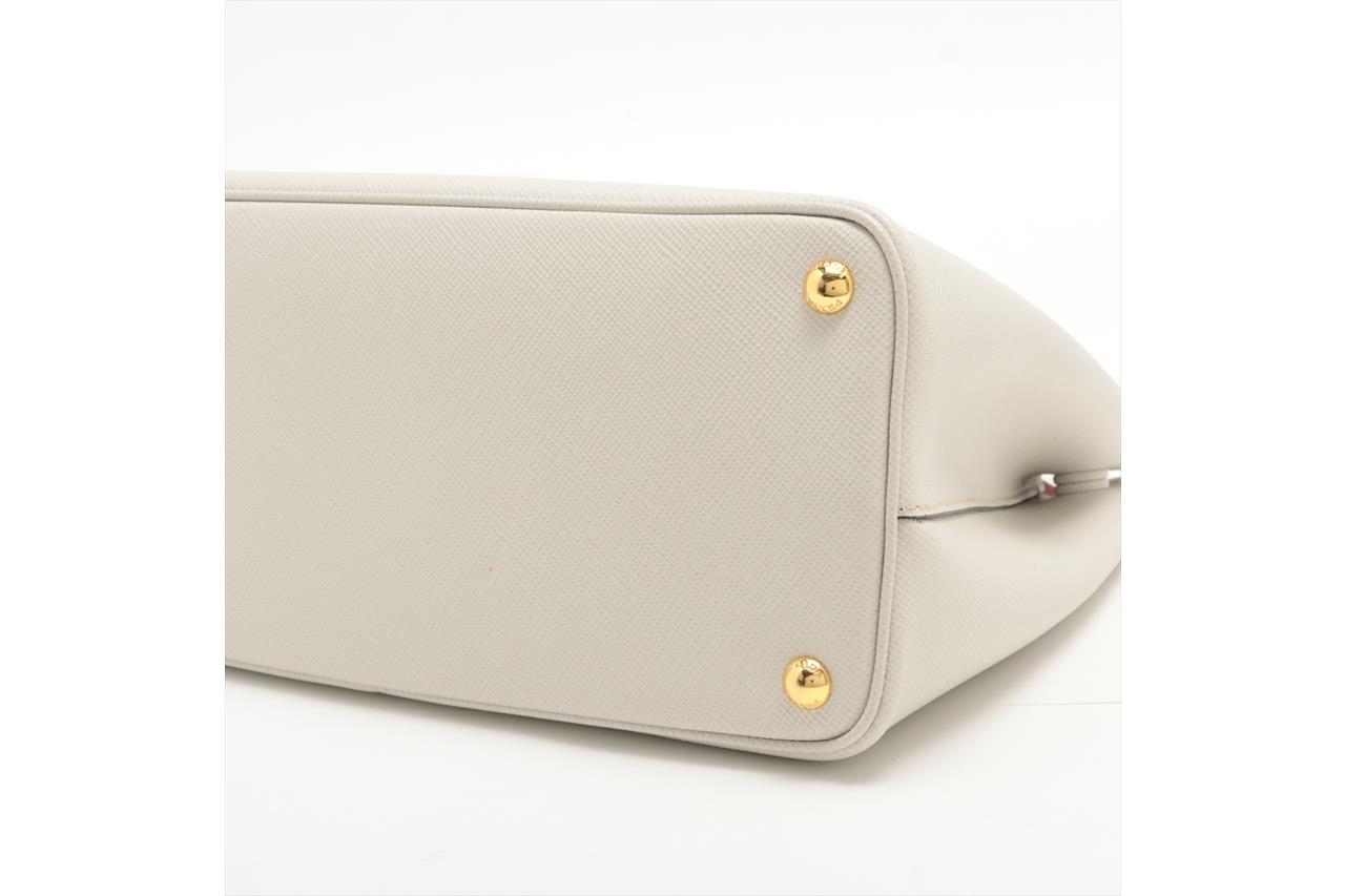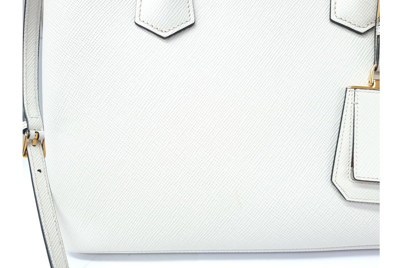 Prada Medium Saffiano Leather Double Bag in light grey/white. Featuring gold-tone hardware, red nappa leather lining, snap closure on the sides, and metal lettering logo on a leather triangle at the front. Approximate dimensions: 33cm (L) x 25cm (H) x 14.5cm (D), 13cm double leather handle drop, and a 115cm detachable and adjustable leather strap. Accompanied by Prada leather name tag with metal details and dust bags. With Entrupy Certificate of Authenticity. (Pre-owned)