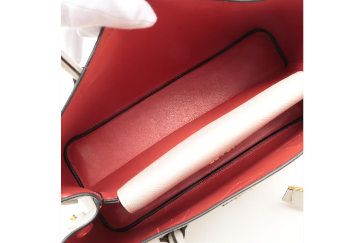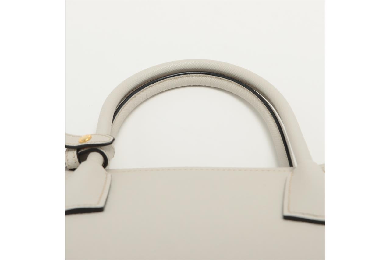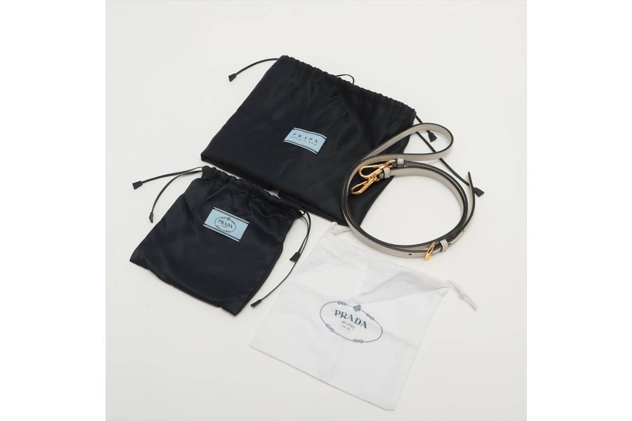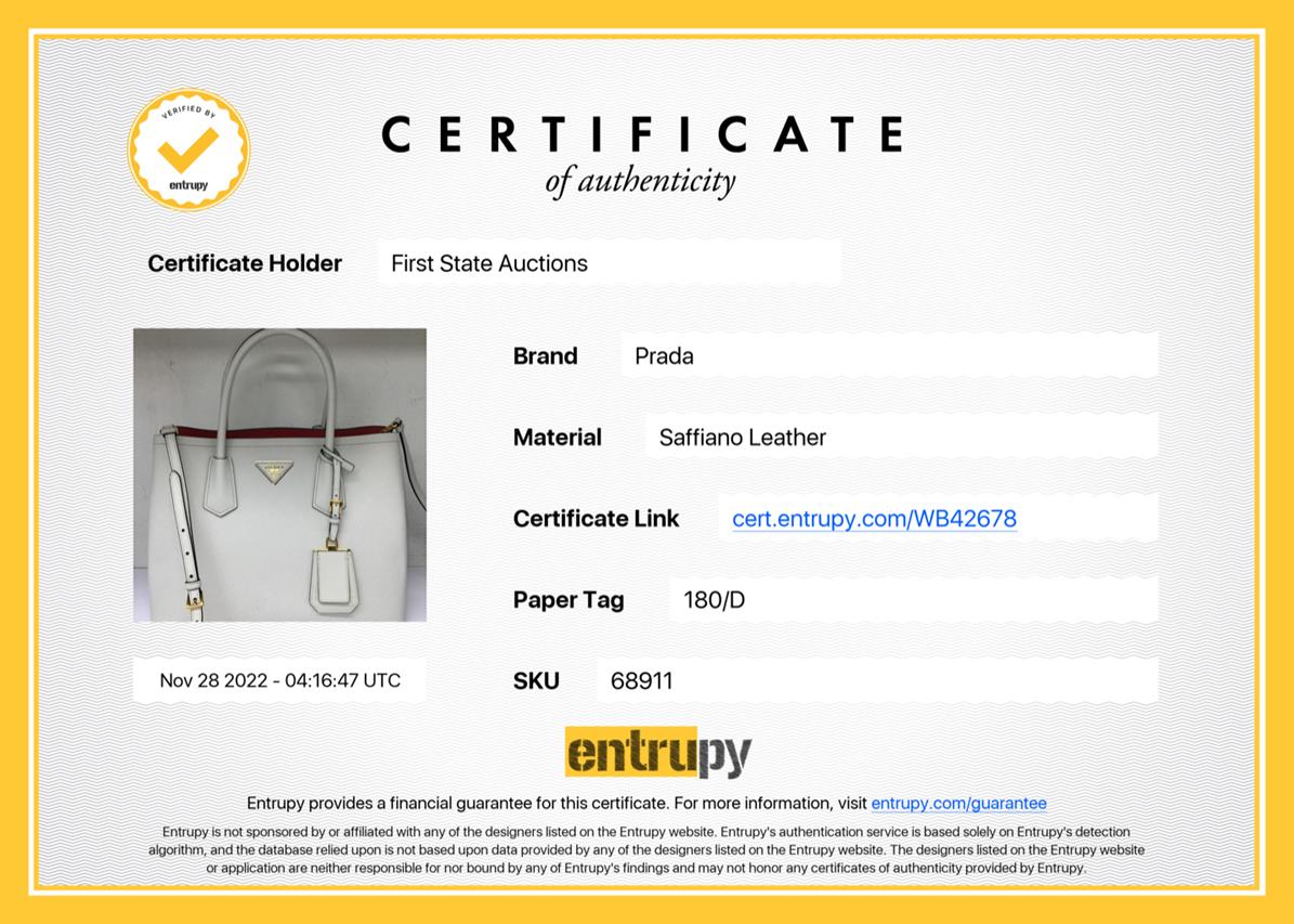 Prada Medium Saffiano Leather Double Bag in light grey/white. Featuring gold-tone hardware, red nappa leather lining, snap closure on the sides, and metal lettering logo on a leather triangle at the front. Approximate dimensions: 33cm (L) x 25cm (H) x 14.5cm (D), 13cm double leather handle drop, and a 115cm detachable and adjustable leather strap. Accompanied by Prada leather name tag with metal details and dust bags. With Entrupy Certificate of Authenticity. (Pre-owned)
