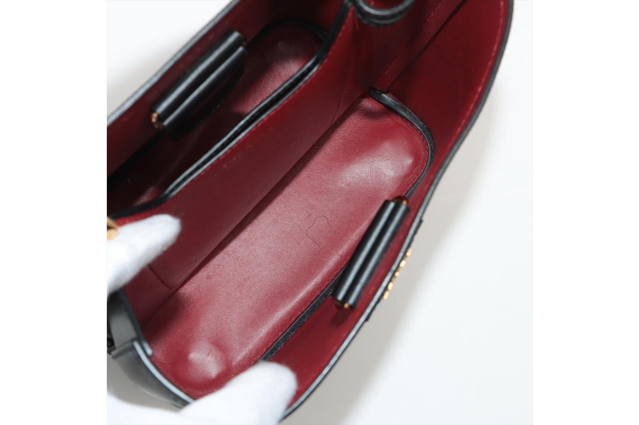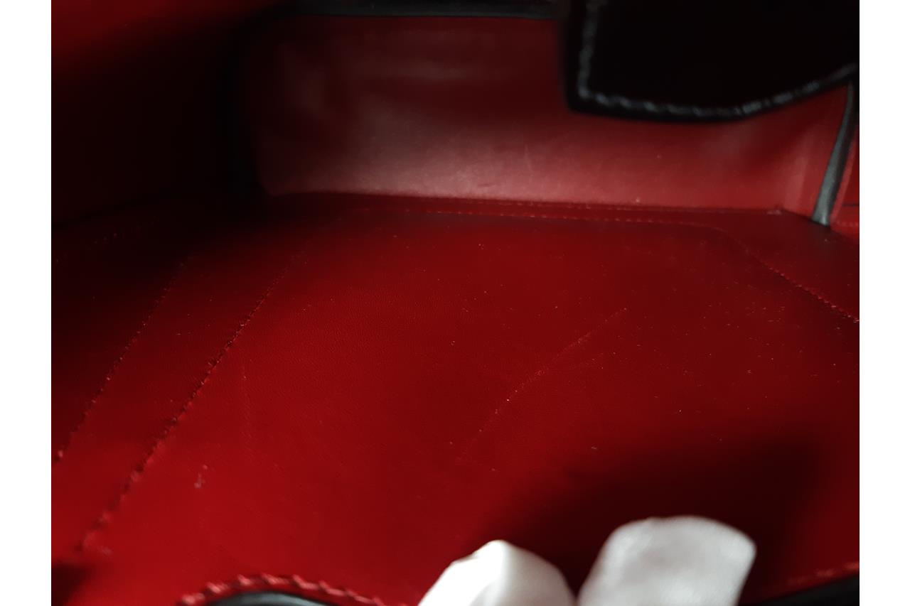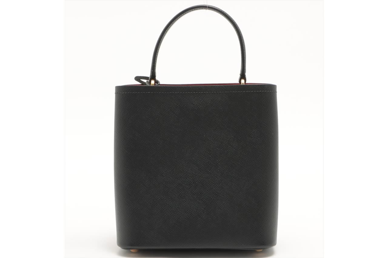 Prada medium Panier bag in black Saffiano leather. Featuring gold-toned hardware, leather handle, metal lettering logo on a leather triangle at the front, magnet closure on top, red Nappa leather lining interior with a centre pocket. Approximate dimensions: 21.5cm(W) x 22.5cm(H) x 13cm (D), 11 handle drop, 54.5cm removable shoulder strap height. Accompanied by leather name tag, Prada certificate card and dust bags. With Entrupy certificate of authenticity. (Pre-owned)