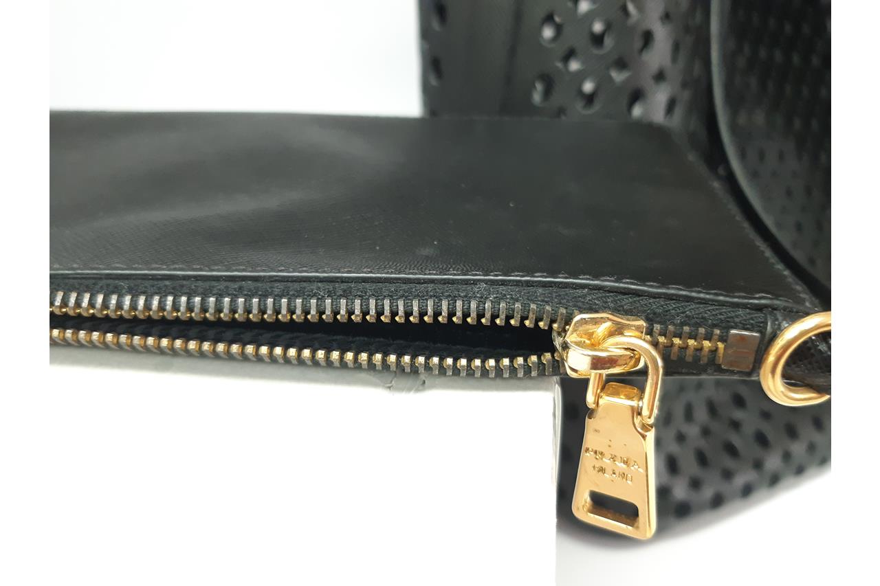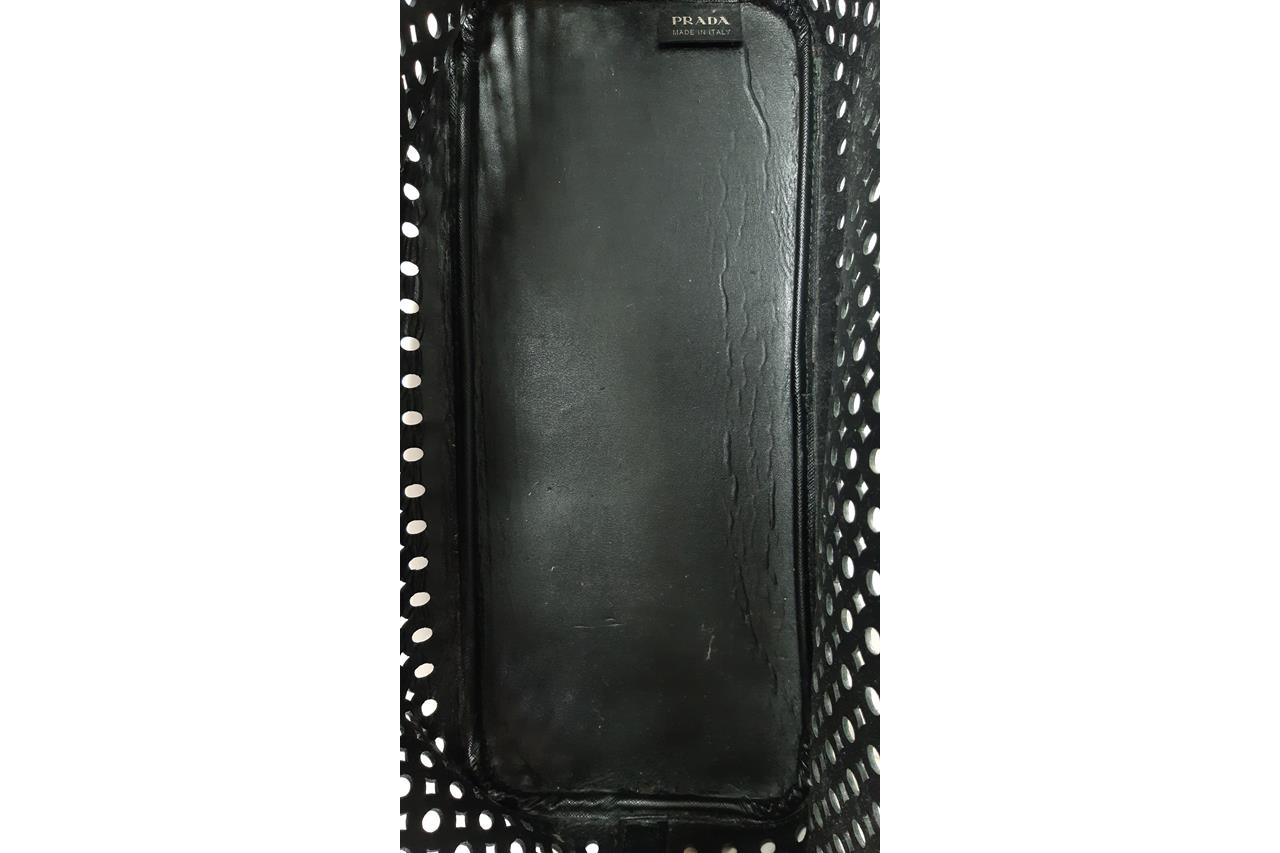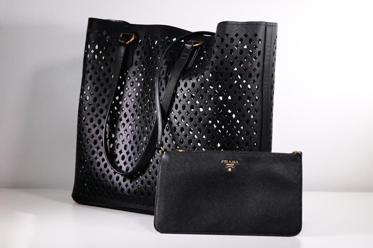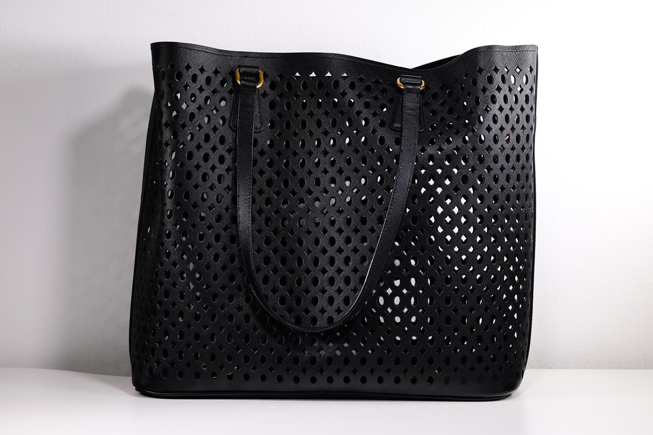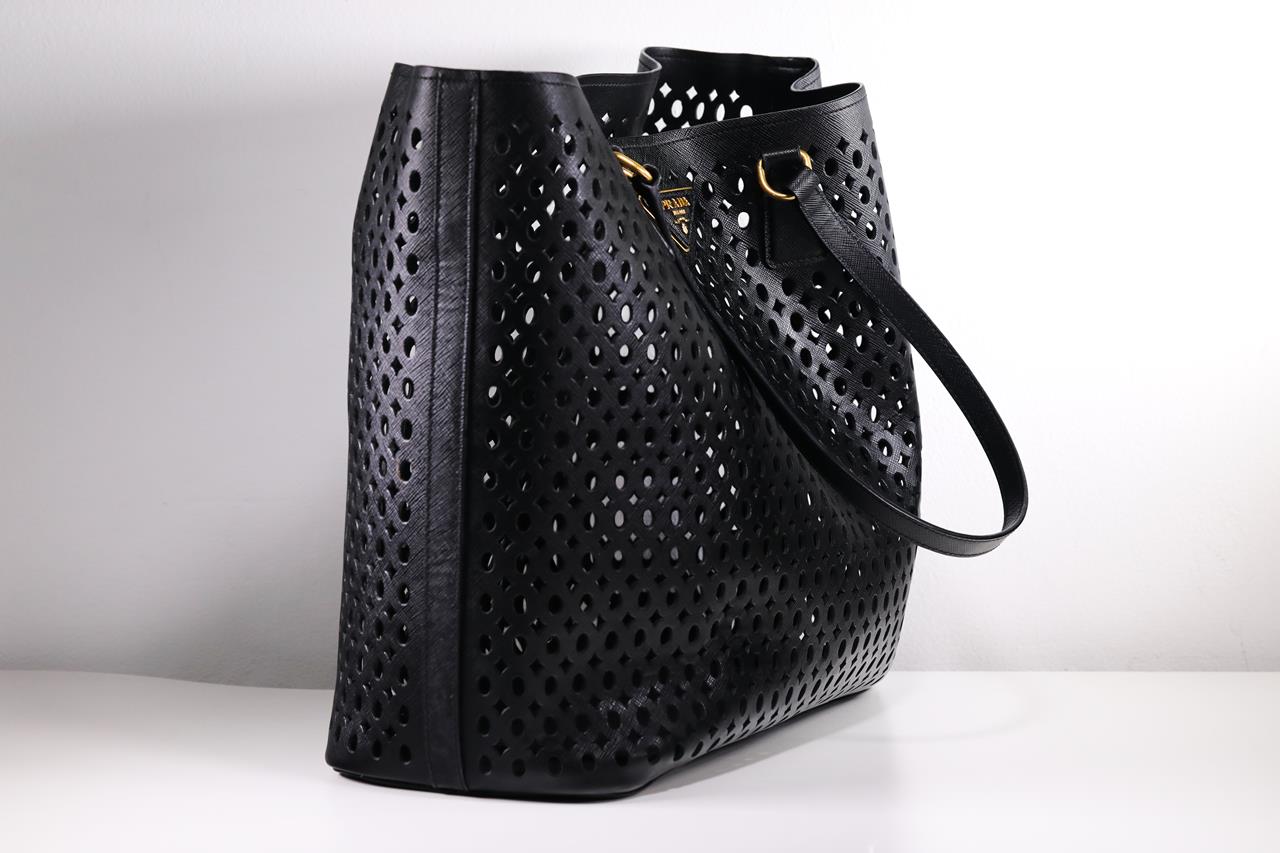 Prada Perforated Saffiano Open Shopping Tote. Featuring black Saffiano leather, features dual rolled leather handles, raised Prada logo at the centre and gold-tone hardware. Approximate dimensions: 38cm (L) x 34cm (H) x 15cm (D). Accompanied by Prada dust bag and pouch. With Entrupy certificate of authenticity. (Pre-owned)