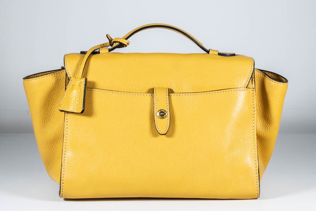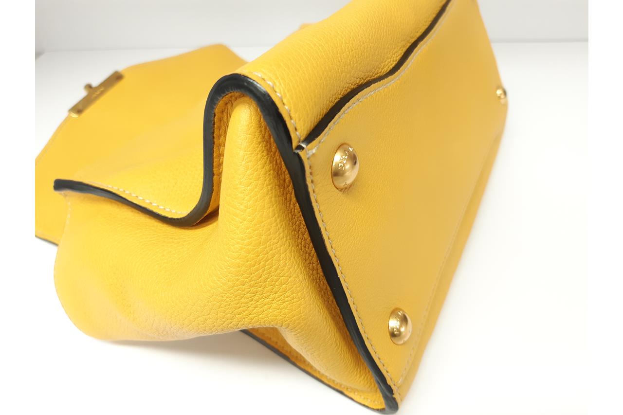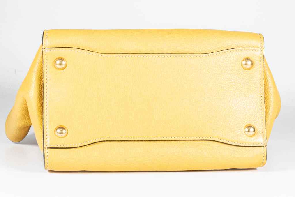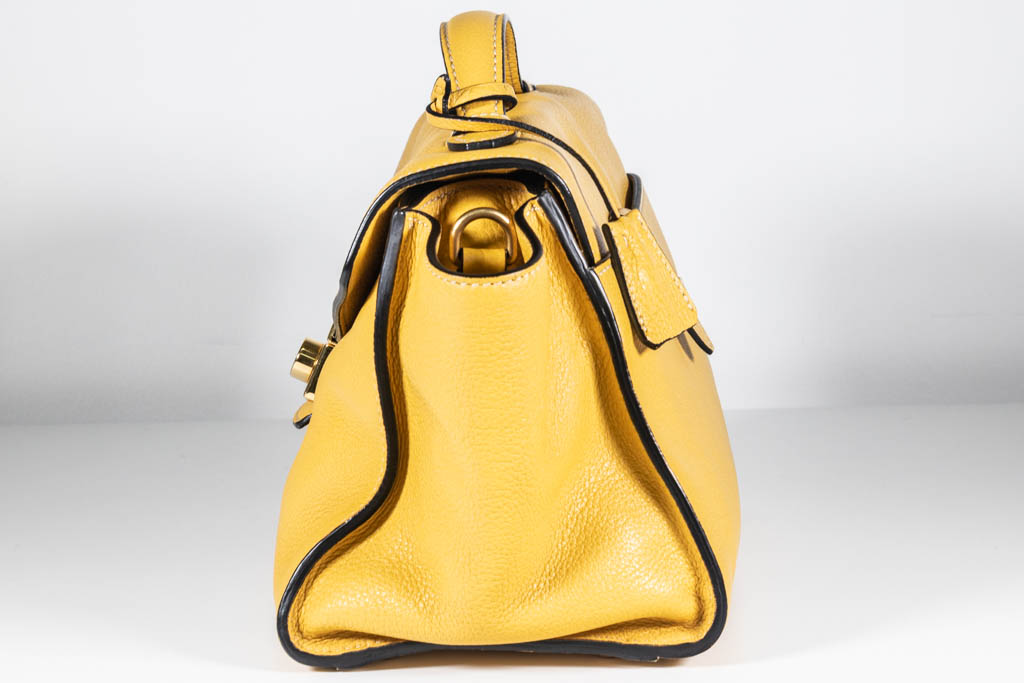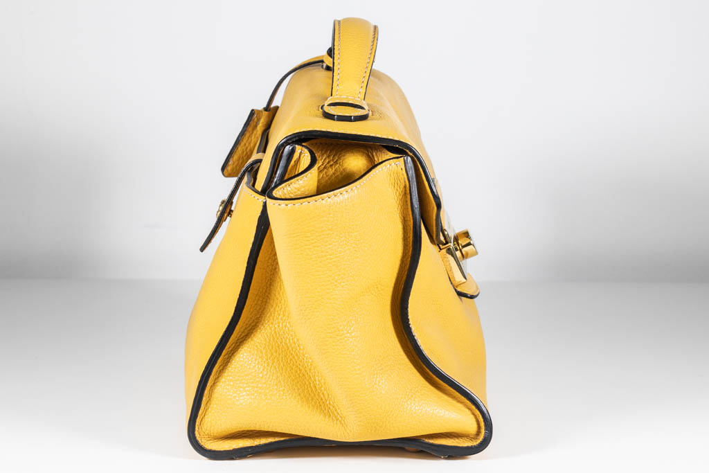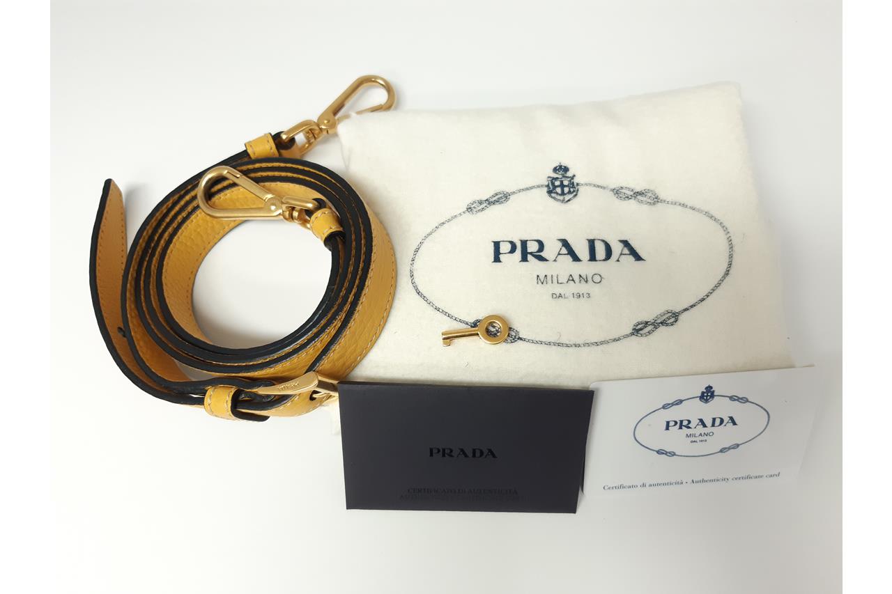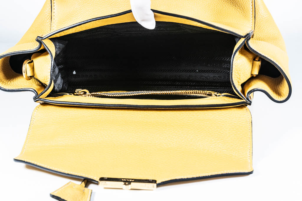 Prada Pattina shoulder bag in Vitello Daino leather, mimosa colour. Featuring gold-toned hardware, side pockets and a flat pocket at back, flap with press lock closure on front, black Prada jacquard fabirc interior with zipper and patch pockets. Approximate dimensions: 25cm(W) x 18cm(H) x 15cm(D), 4cm handle height and 56cm strap height. Accompanied by clochette, keys, certificate card and dust bag. With Entrupy cetificate of authenticity. (Pre-owned)