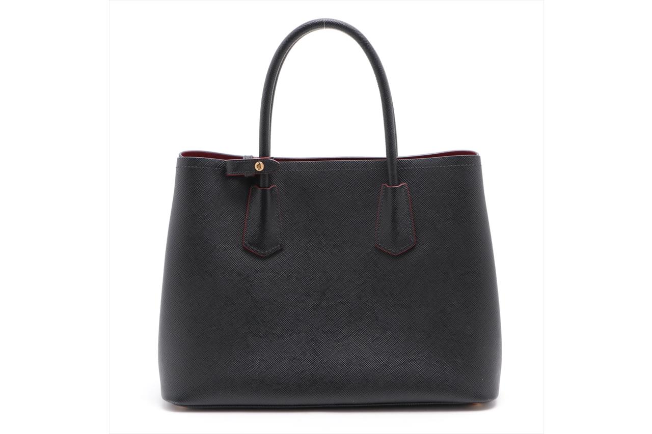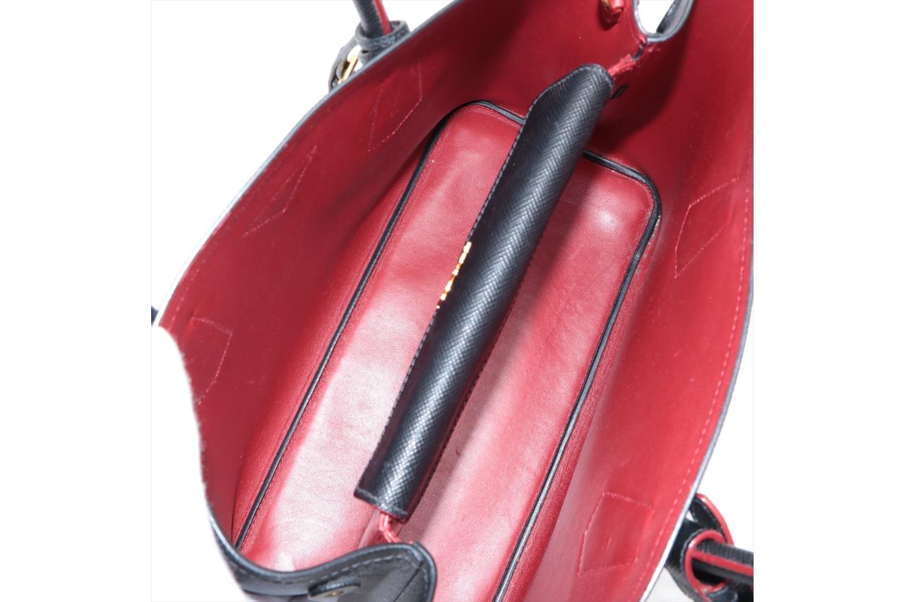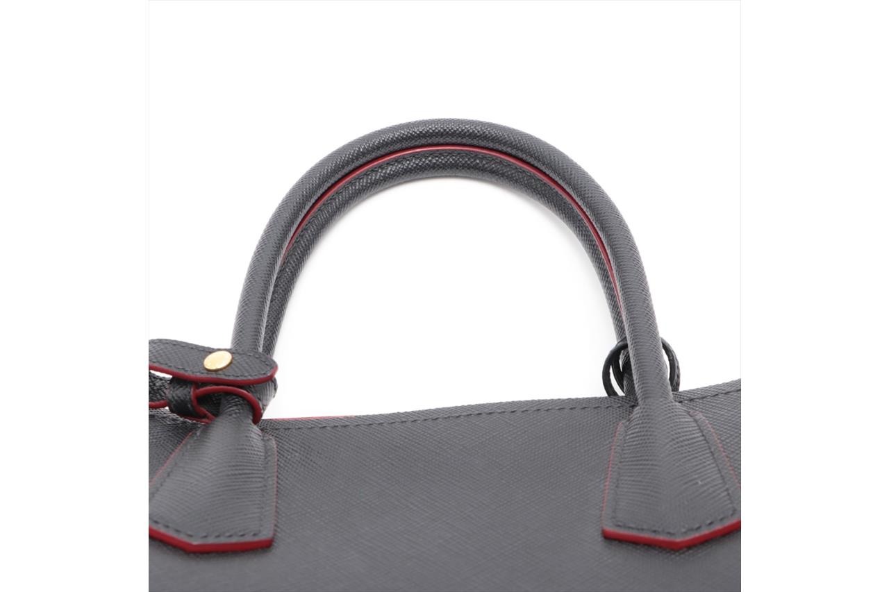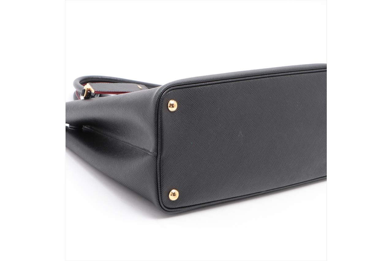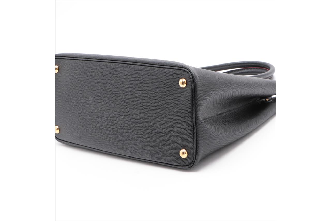 Prada Black Saffiano Leather Cuir Handbag. Gold-tone hardware. Red leather interior. Approximate dimensions: 34cm (L) x 25cm (H) x 15cm (D) and 13cm handle height. Accompanied by Prada detachable and adjustable shoulder strap, and tag. With Entrupy Certificate of Authenticity. (Pre-owned)