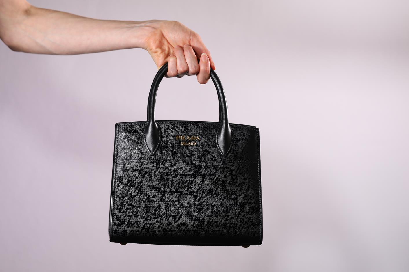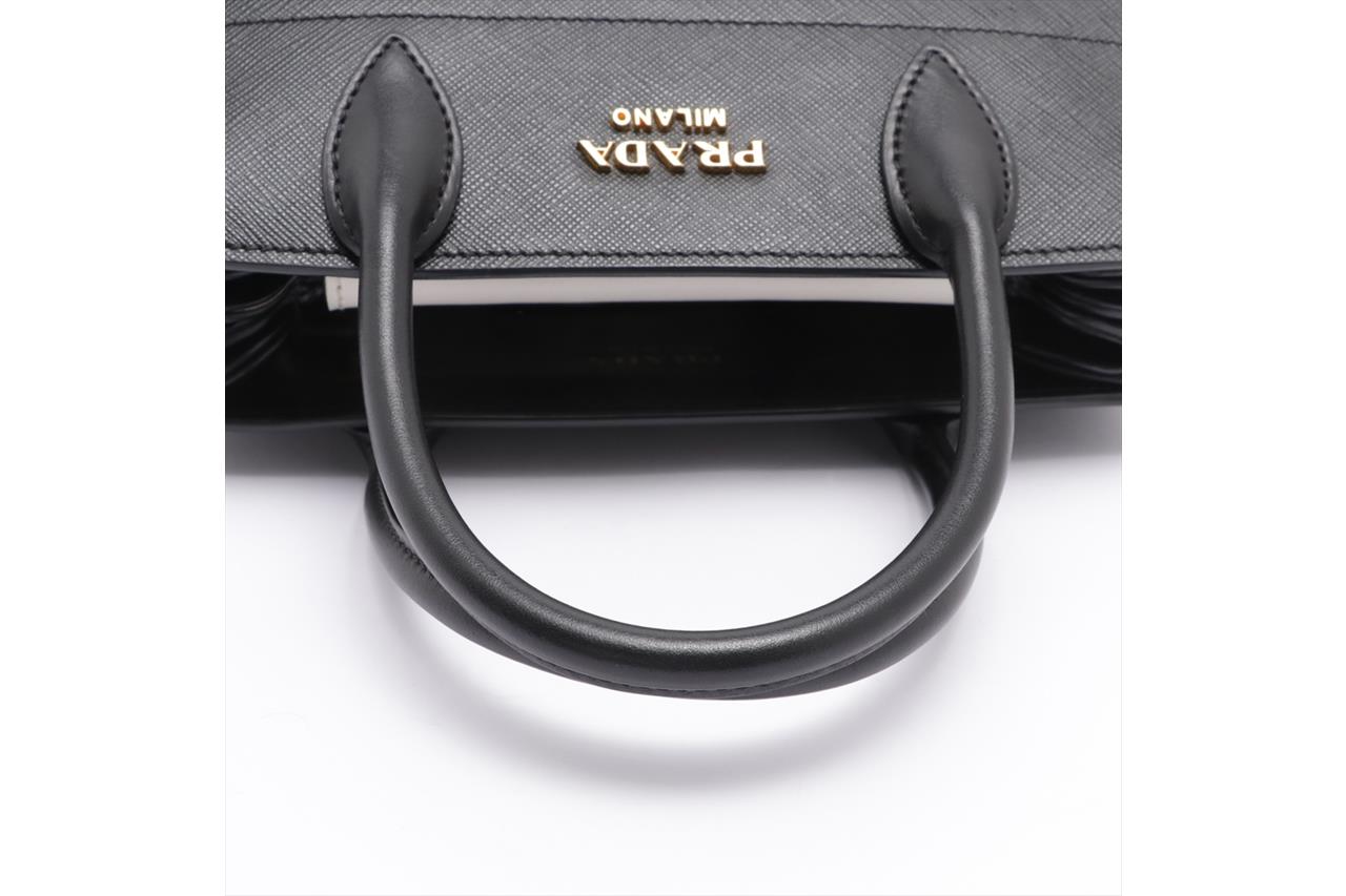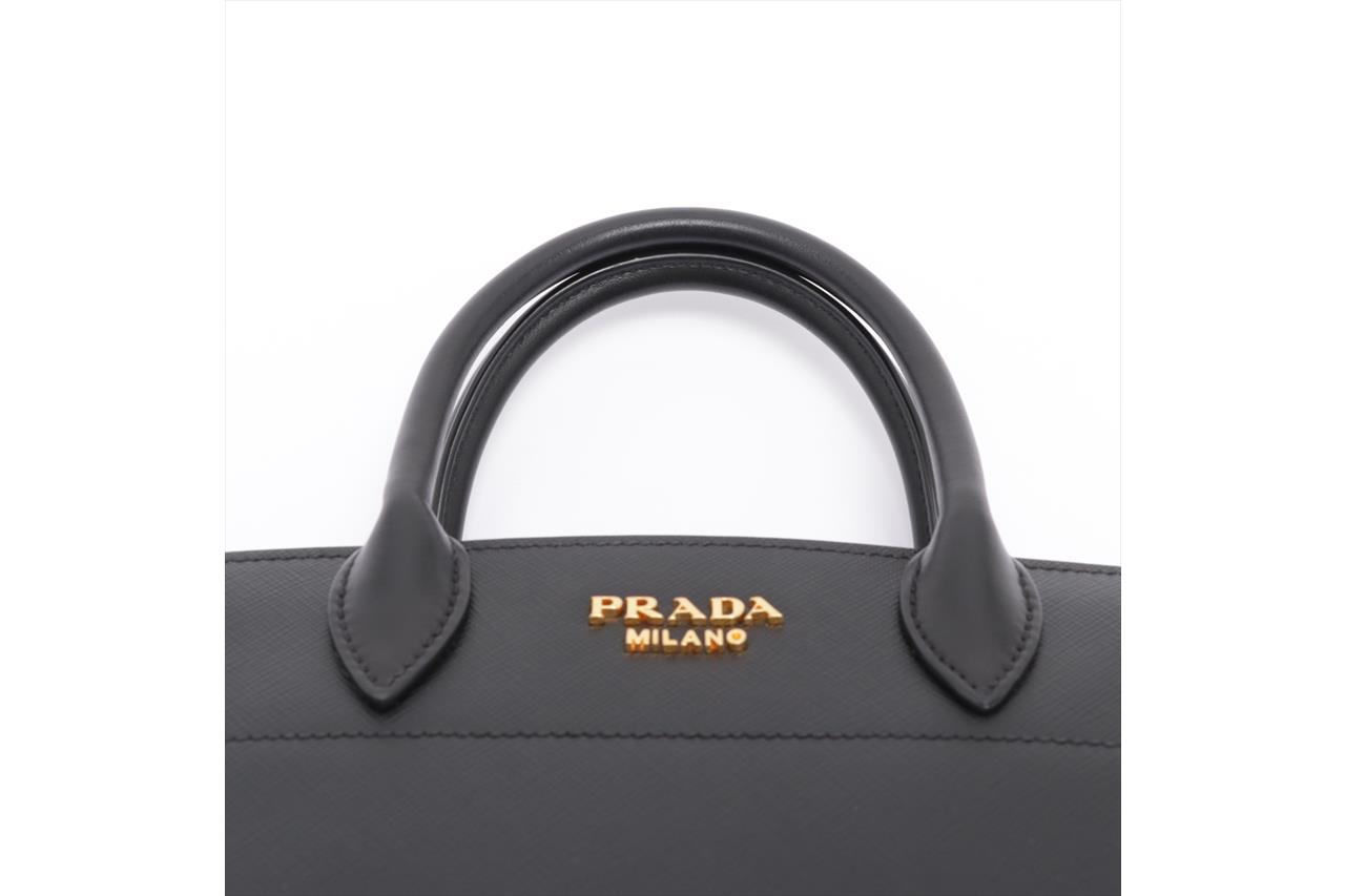 Prada Saffiano Black Leather Handbag. Approximate dimensions: 22cm (L) x 18cm (H) x 12cm (D) and 9cm handle height. Accompanied by Prada detachable shoulder strap and dust bag. With Entrupy Certificate of Authenticity. (Pre-owned)