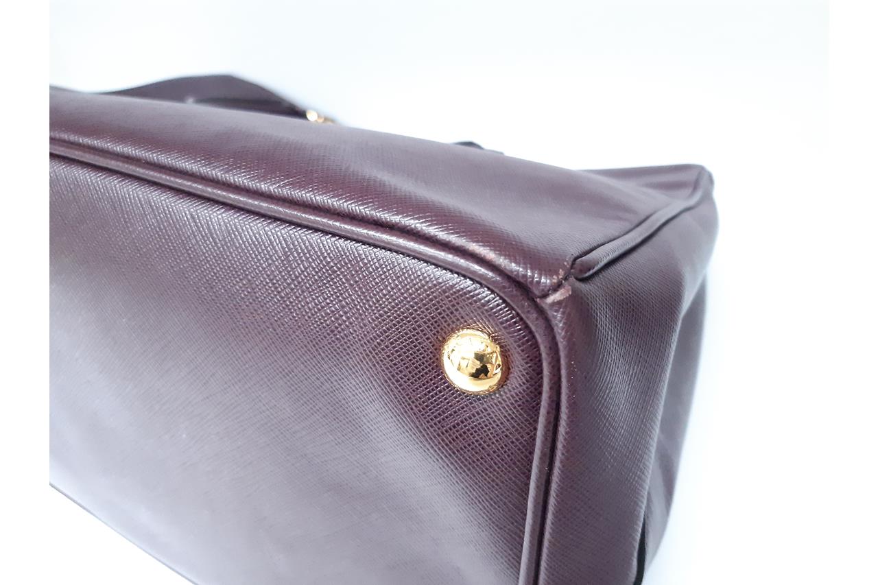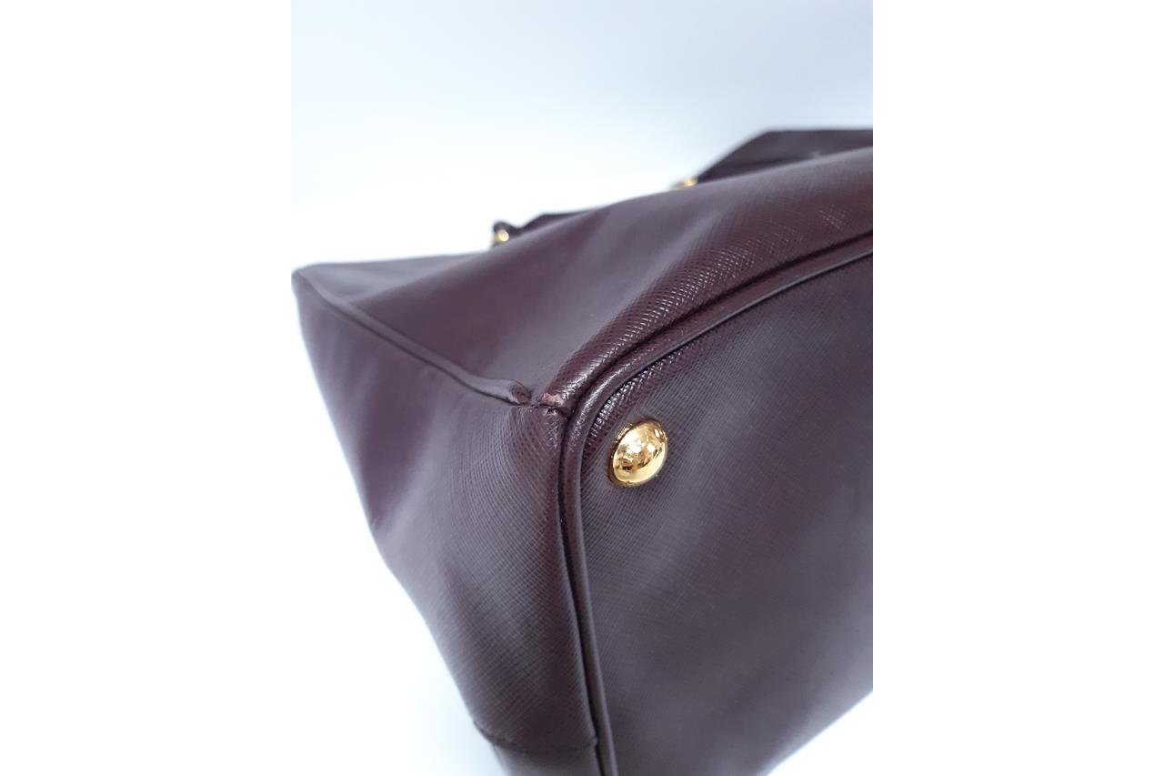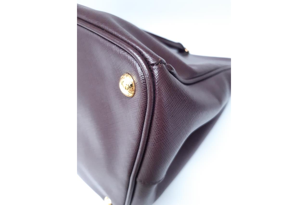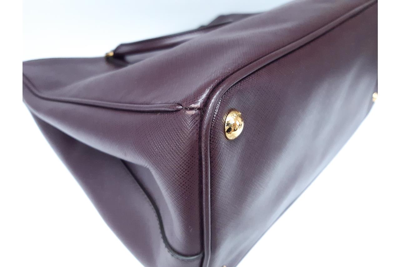 Prada large Galleria tote bag in mulberry saffiano leather. Featuring dual rolled leather handles, triangular brand logo at front, gold-toned hardware, zip and side snap button closures on top. The top opens to the nylon-lined interior with 3 compartments and interior pockets. Approximate dimensions: 41cm(W) x 29cm(H) x 17cm(D), 12.5cm handle drop. With Entrupy Certificate of Authenticity. (Pre-owned)