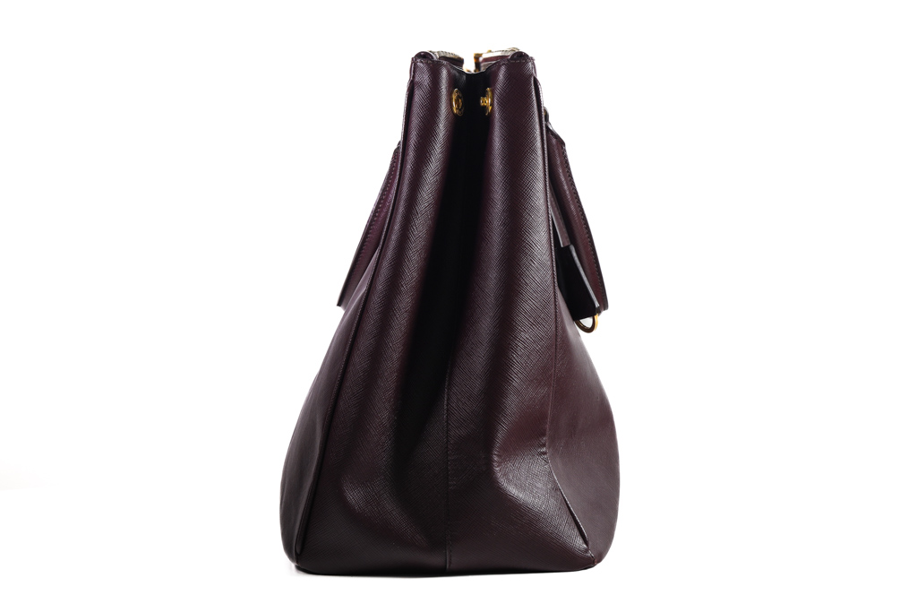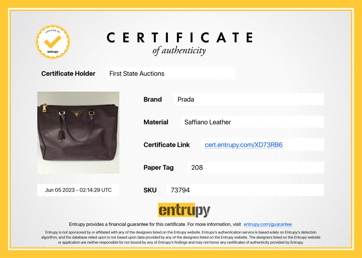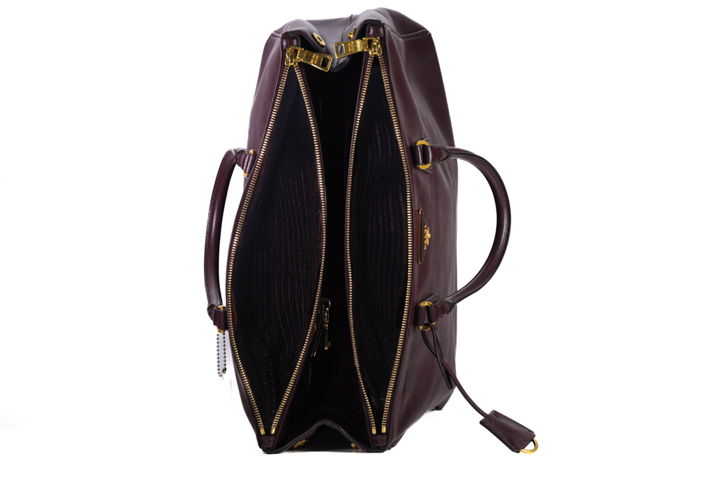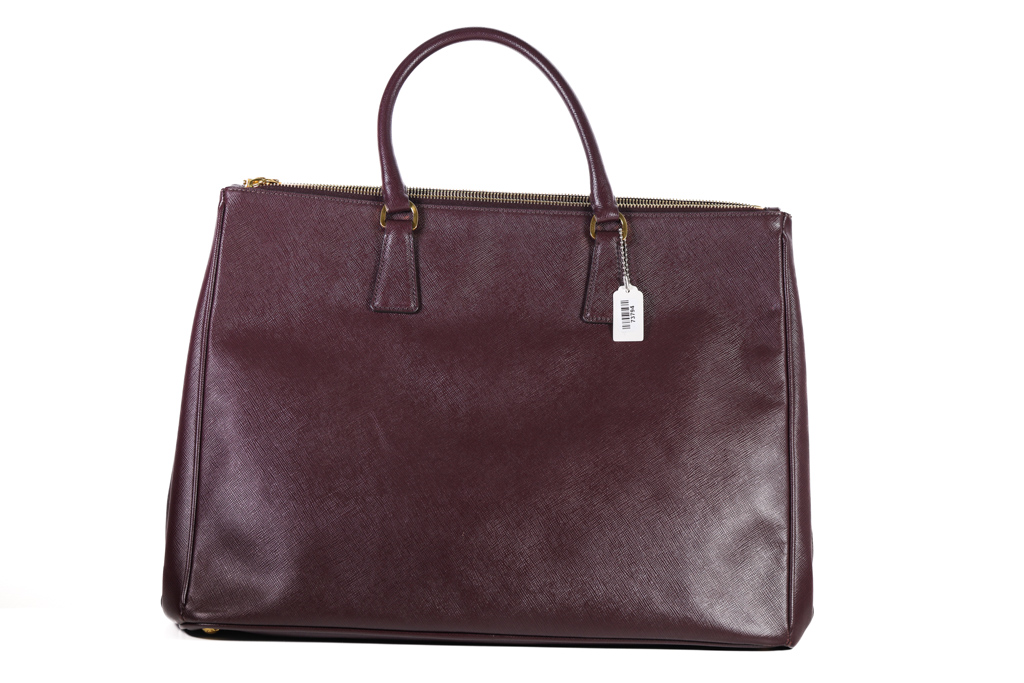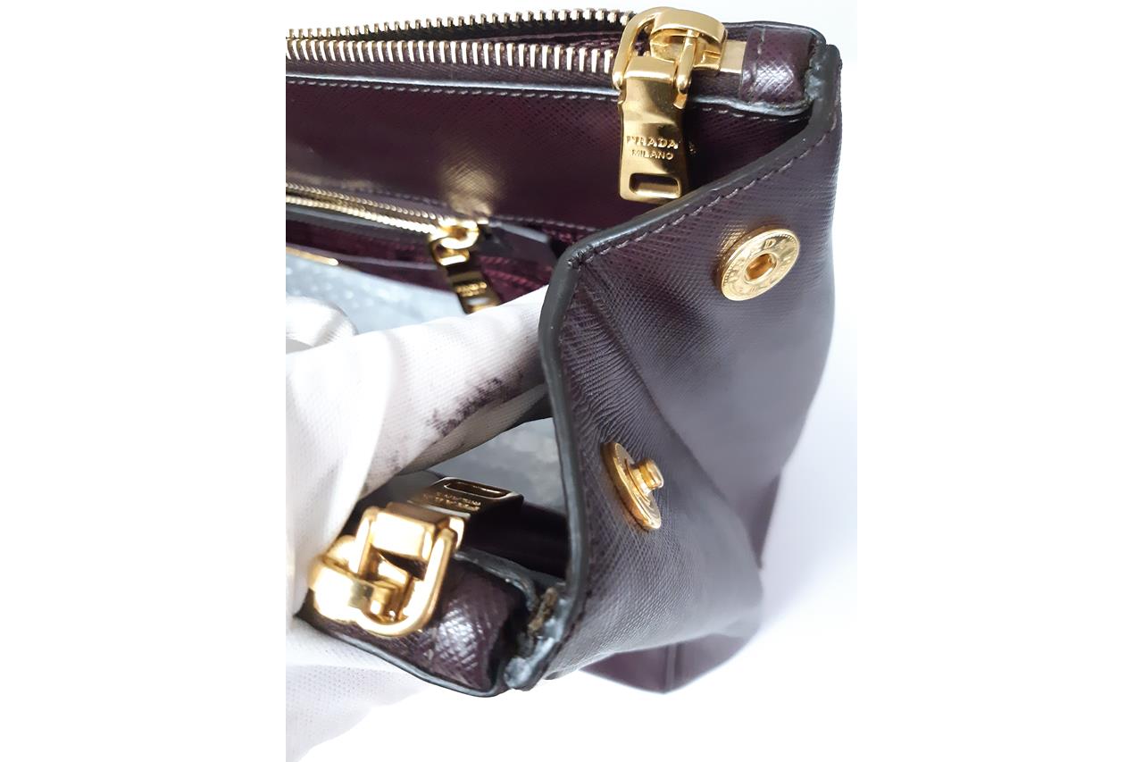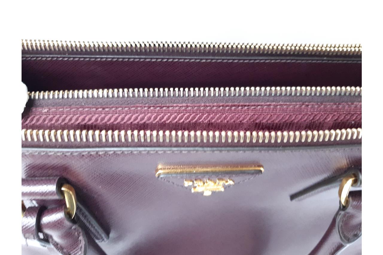 Prada large Galleria tote bag in mulberry saffiano leather. Featuring dual rolled leather handles, triangular brand logo at front, gold-toned hardware, zip and side snap button closures on top. The top opens to the nylon-lined interior with 3 compartments and interior pockets. Approximate dimensions: 41cm(W) x 29cm(H) x 17cm(D), 12.5cm handle drop. With Entrupy Certificate of Authenticity. (Pre-owned)