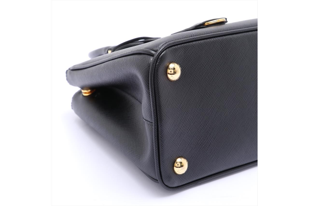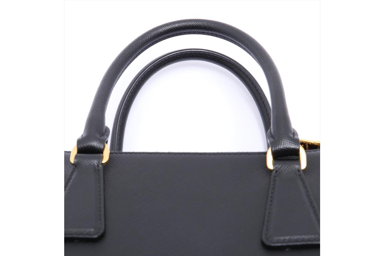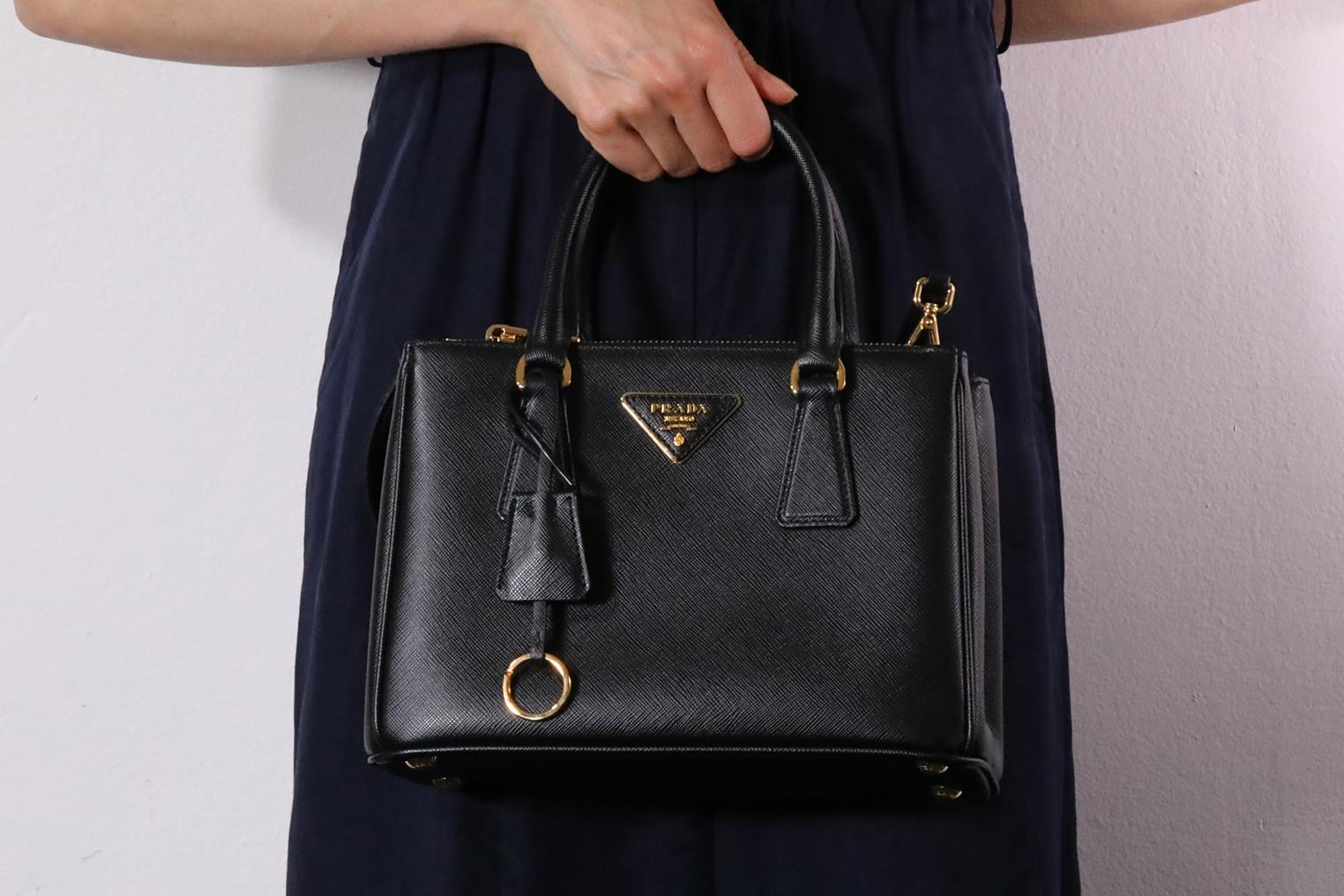 Prada Saffiano Lux 2 Way Black Handbag. Black Saffiano leather and gold-tone hardware. Approximate dimensions: 25cm (L) x 17cm (H) x 11.5cm (D) and 11cm handle height. With Entrupy Certificate of Authenticity, Prada shoulder strap and dust bag. (Pre-owned)