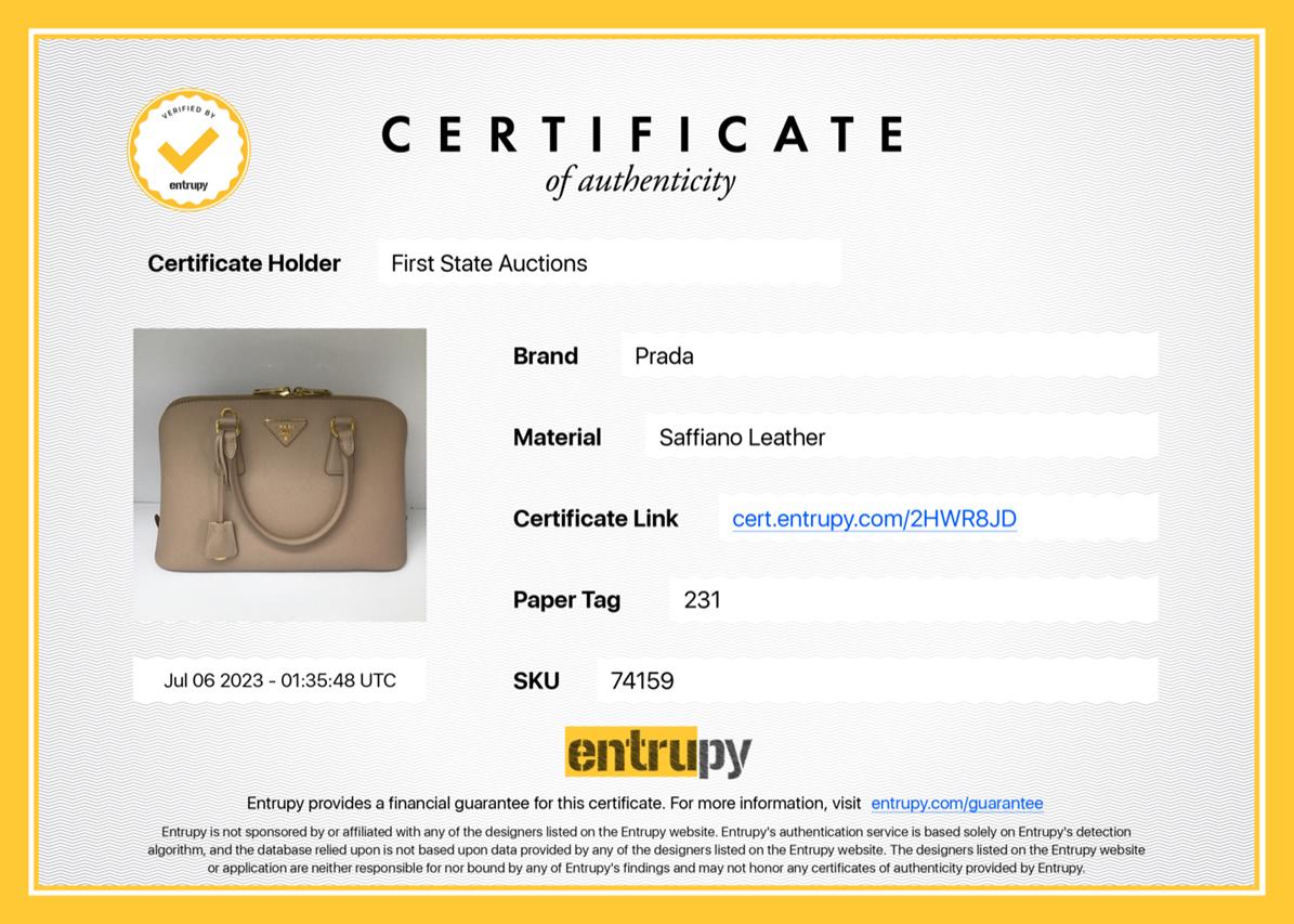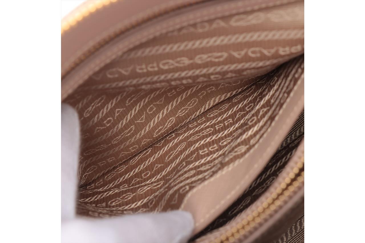 Prada Promenade satchel in beige Saffiano Lux leather. Featuring dual rolled leather top handles, gold-toned hardware and a top zipper closure. This opens to a Prada logo jacquard fabric lining interior with two compartments and a middle zipped pocket. Approximate dimensions:32cm(L) x 20cm(H) x 13cm(D), 12cm handle drop and 61cm adjustable and detachable strap drop height. Accompanied by Prada dust bags. With Entrupy Certificate of Authenticity. (Pre-owned)