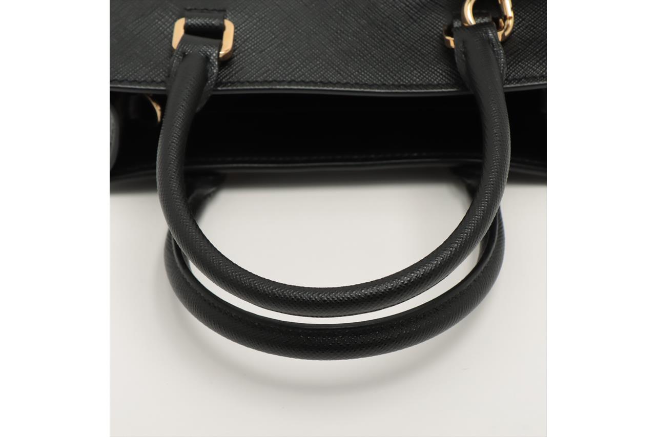 Prada Small Saffiano Leather Handbag. Featuring black Saffiano leather, embossed lettering logo on the front, gold-tone hardware, nylon logo-print lining with patch pocket, and an open top. A removable leather pouch with zipped closure. Approximate dimensions: 17cm (L) x 19cm (H) x 6cm (D),8.5cm handle height, and 64cm adjustable shoulder strap. Accompanied by Prada certificate card and dust bag. With Entrupy Certificate of Authenticity. (Pre-owned)