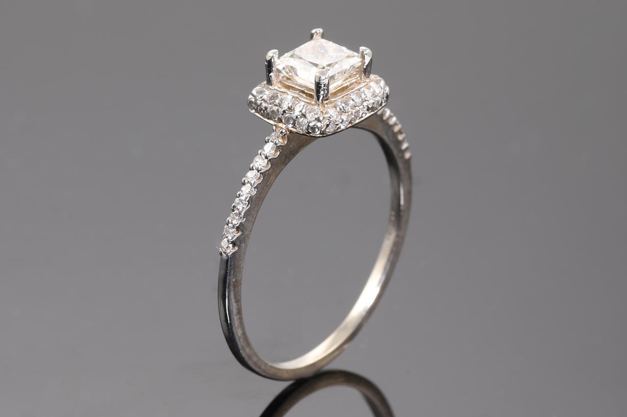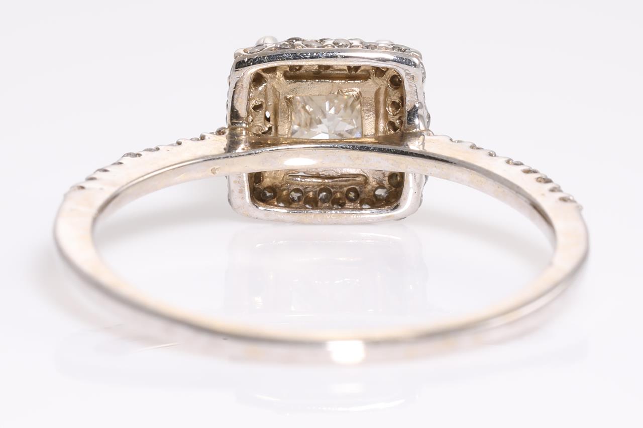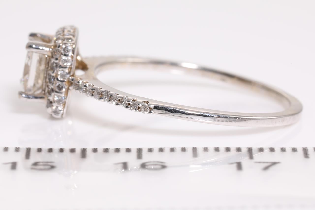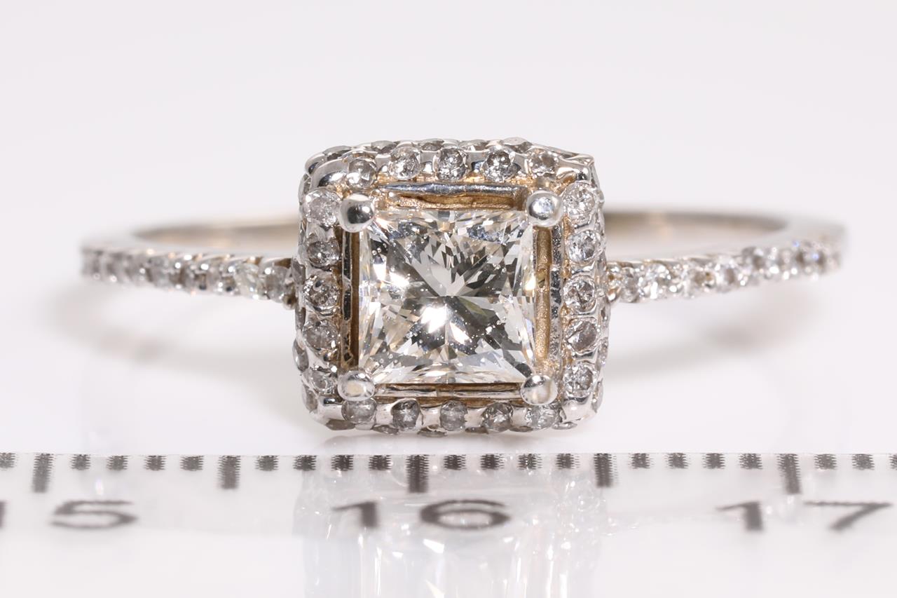 Diamond halo ring with a princess cut Diamond of approximately 0.60ct (Estimated grading: I SI2) and remaining Diamonds totalling approximately 0.30cts. 18ct white gold. Ring size Q - cannot be resized up, down with ring clip. Weight: 2.6g. (Pre-owned)