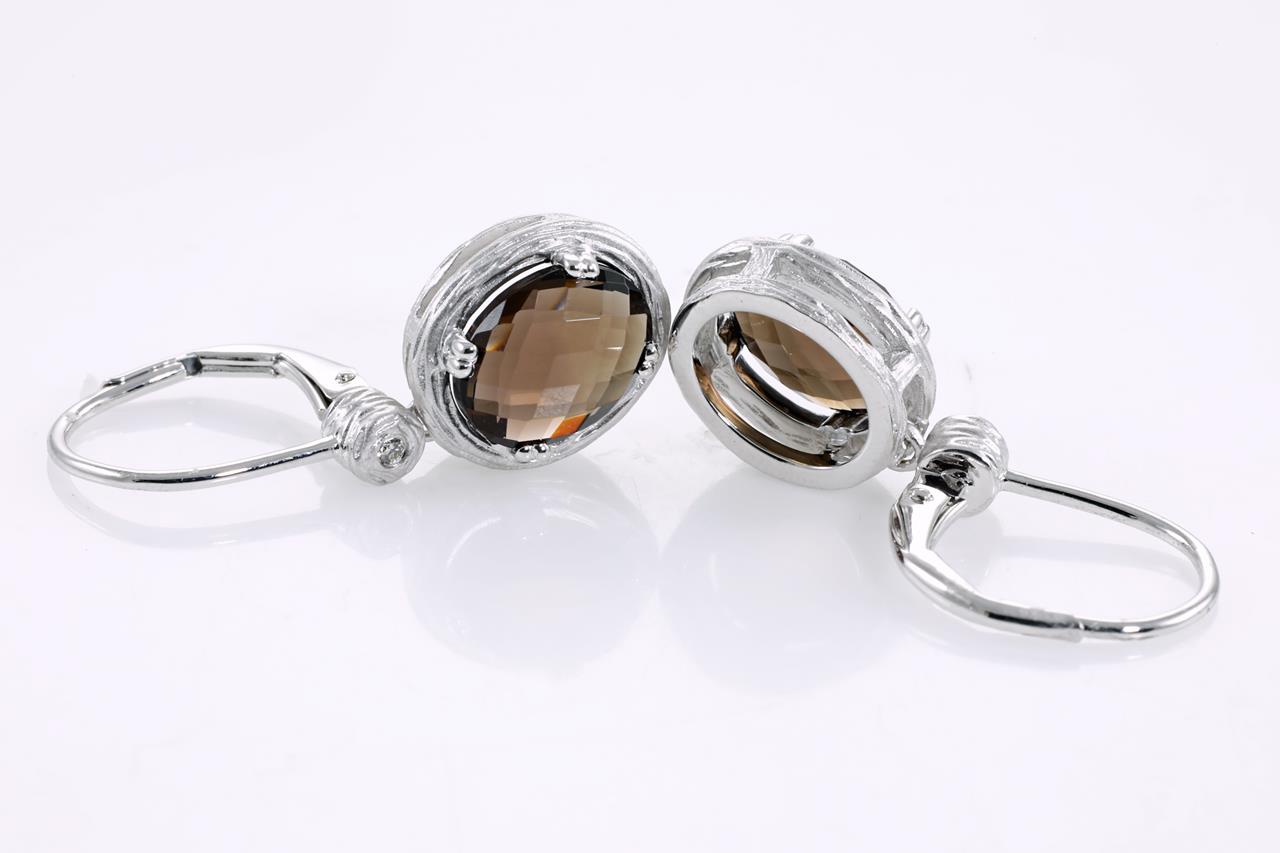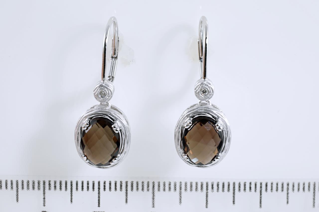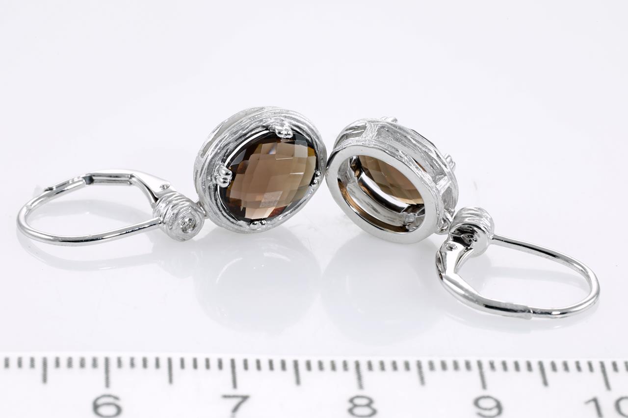 Quartz and Diamond earrings with oval checkerboard cut Smokey Quartz totalling 3.97cts and Diamonds totalling 0.03cts. 14ct white gold. Weight: 5.4g (New)