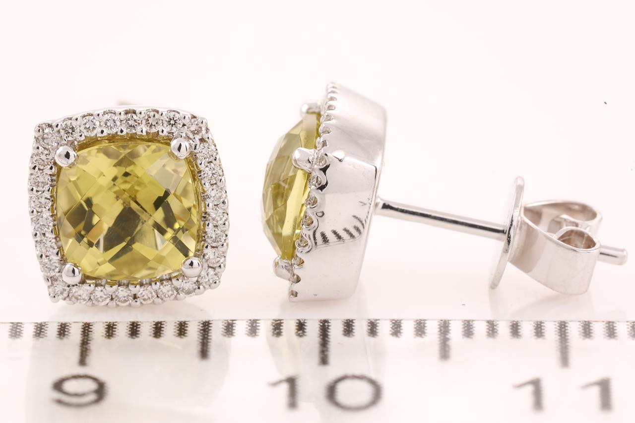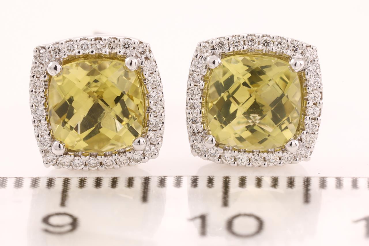 Quartz and Diamond earrings with cushion cut Lemon Quartz totalling 1.79cts and Diamonds totalling 0.16cts. 14ct white gold. Weight: 2.8g. (New)