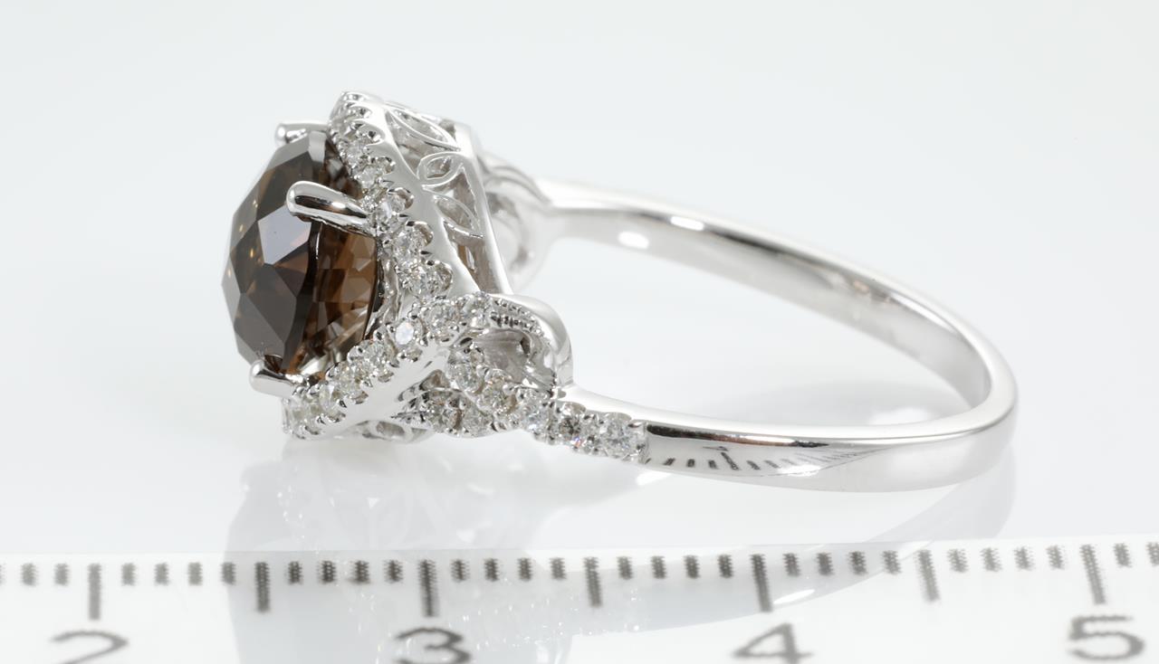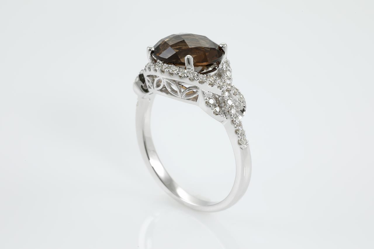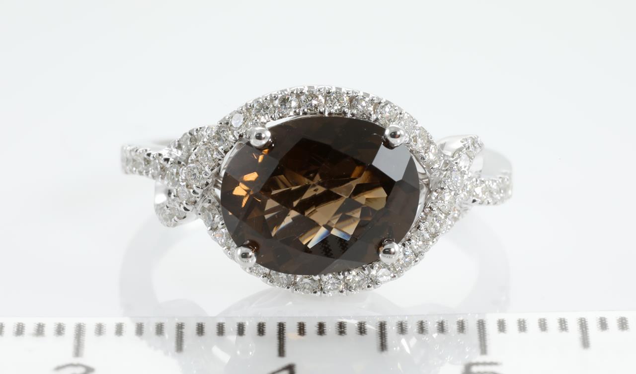 Quartz and Diamond ring with an oval checkerboard cut Smokey Quartz of 2.43ct and Diamonds totalling 0.34cts (Estimated grading: H SI). 14ct white gold. Ring size N. Weight: 4g (New)