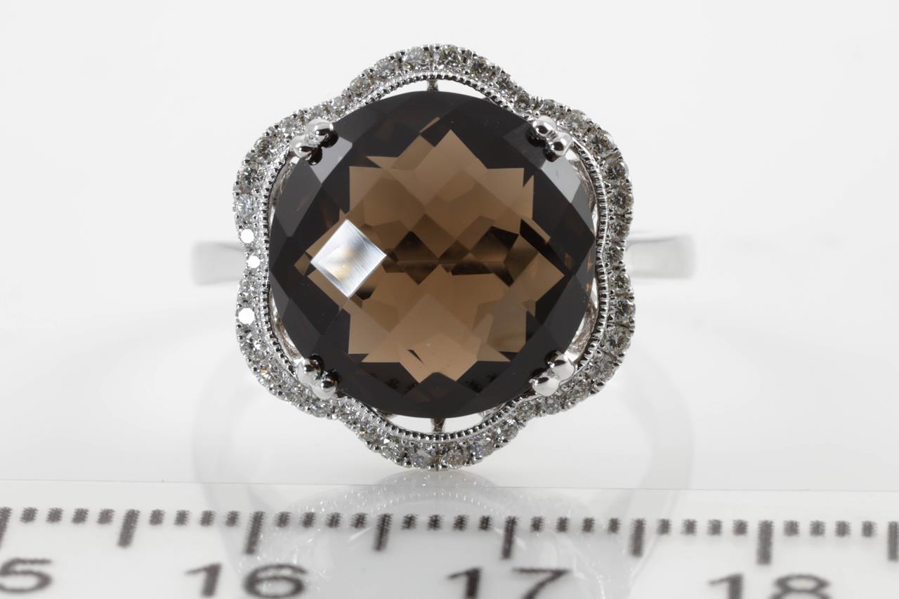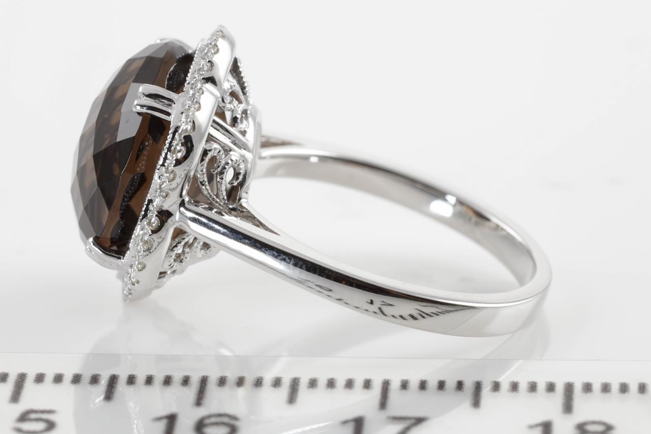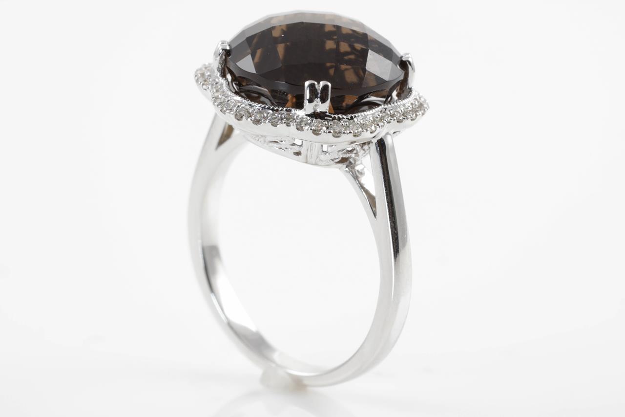 Quartz and Diamond ring with a round Smokey Quartz of 8.68ct and Diamonds totalling 0.22cts. 14ct white gold. Ring size N. Weight: 5.7g. (New)