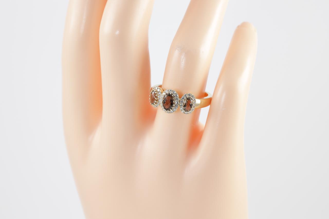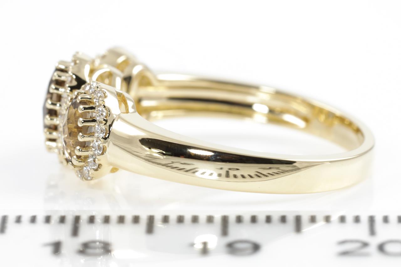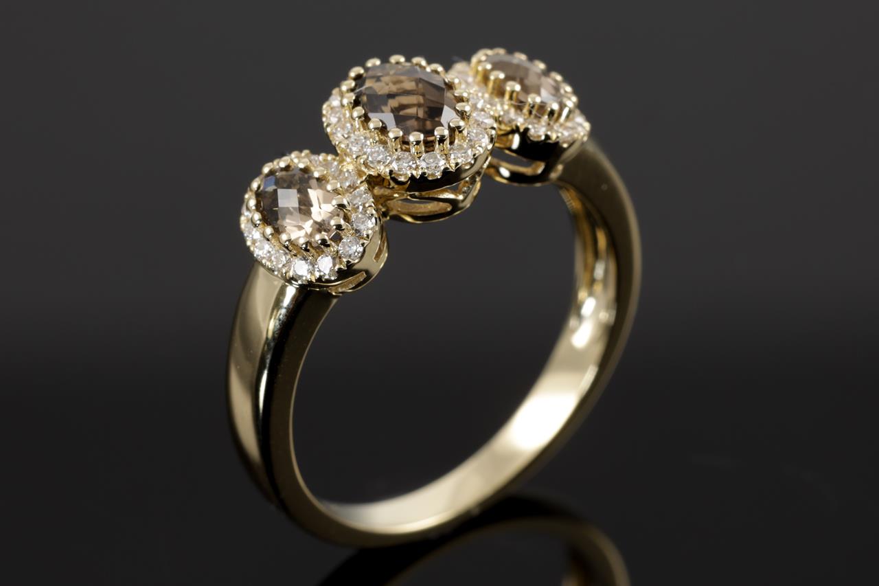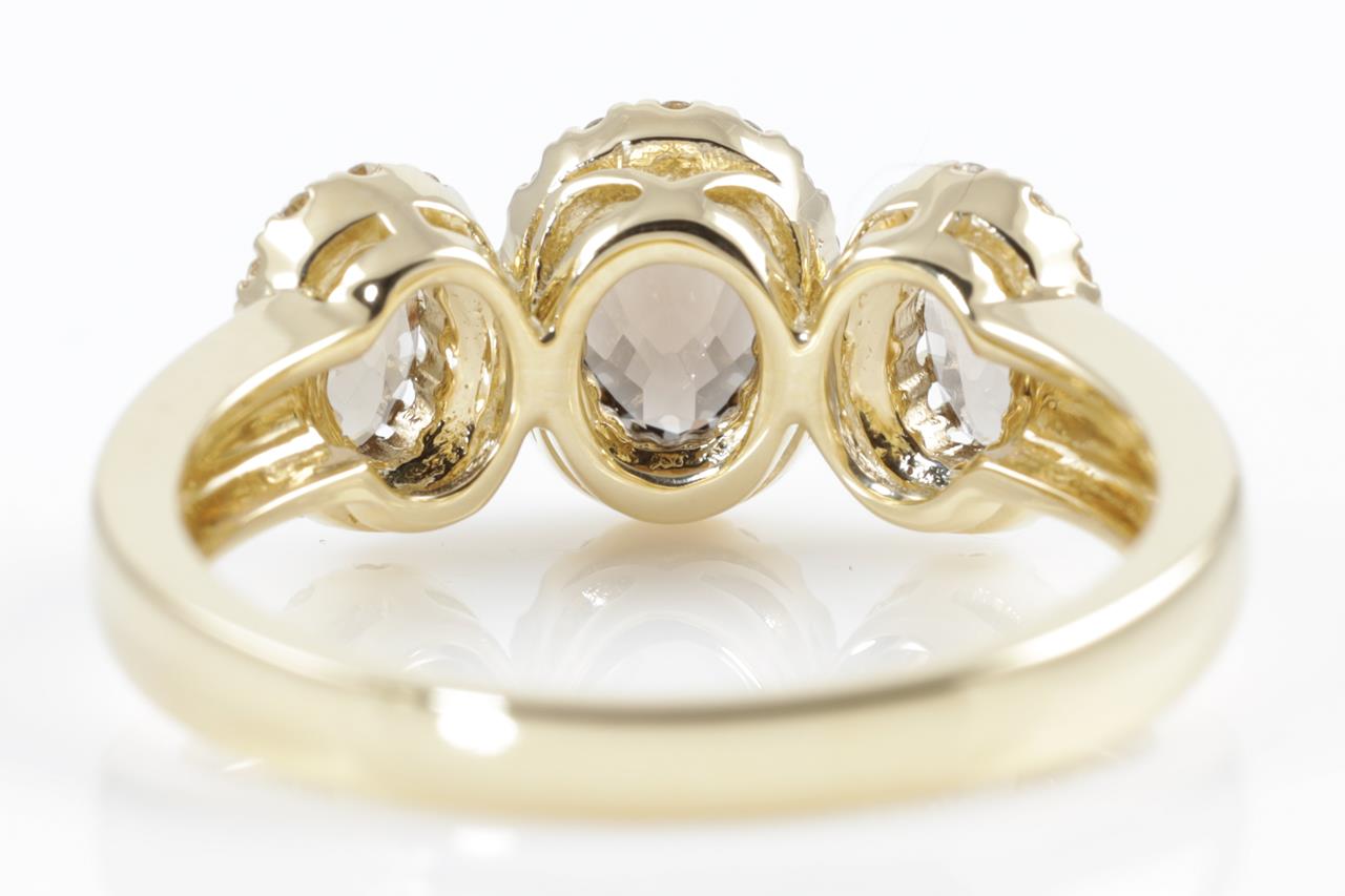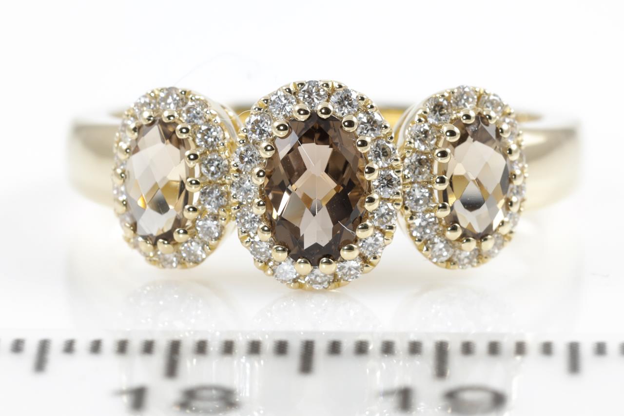 Quartz and Diamond ring with 3 oval Smokey Quartz of 0.83ct and Diamonds totalling 0.26cts. 14ct yellow gold. Ring size N. Weight: 3.9g. (New)