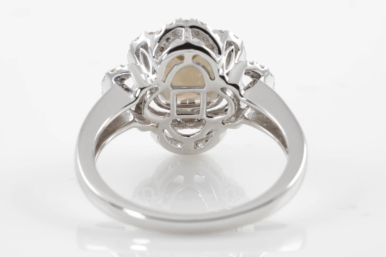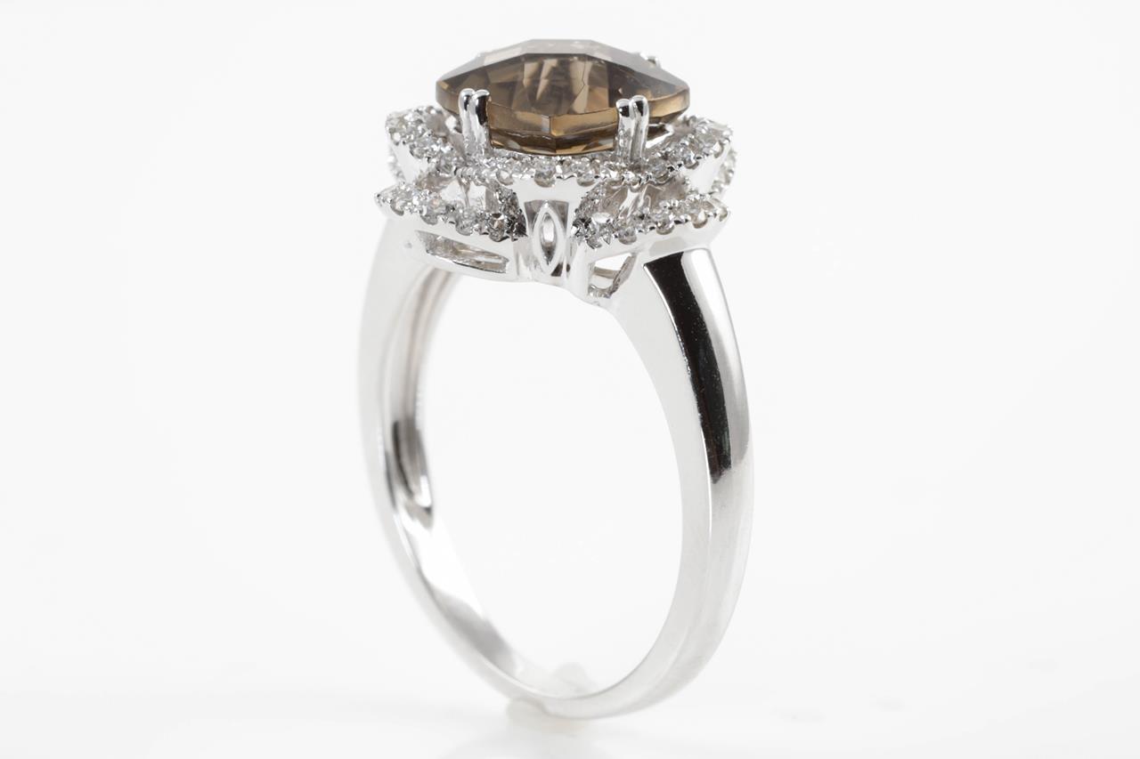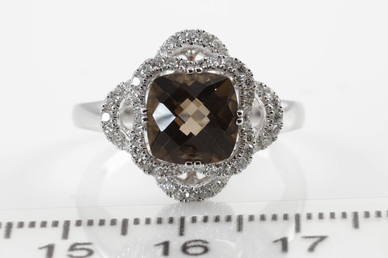 Quartz and Diamond ring with a cushion cut Smokey Quartz of 2.18ct and Diamonds totalling 0.37cts (Estimated grading: H SI). 14ct white gold. Ring size N. Weight: 4.5g. (New)