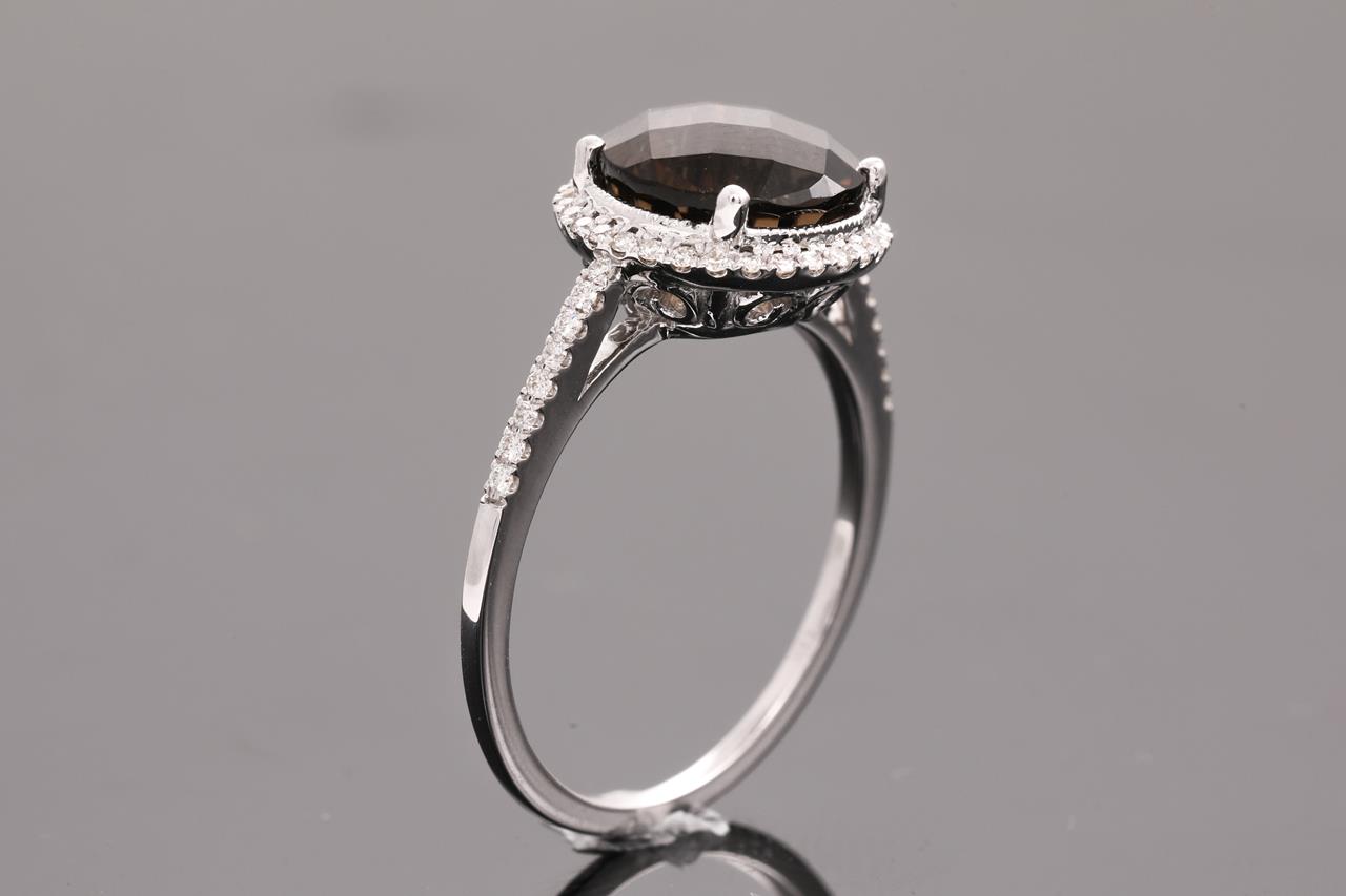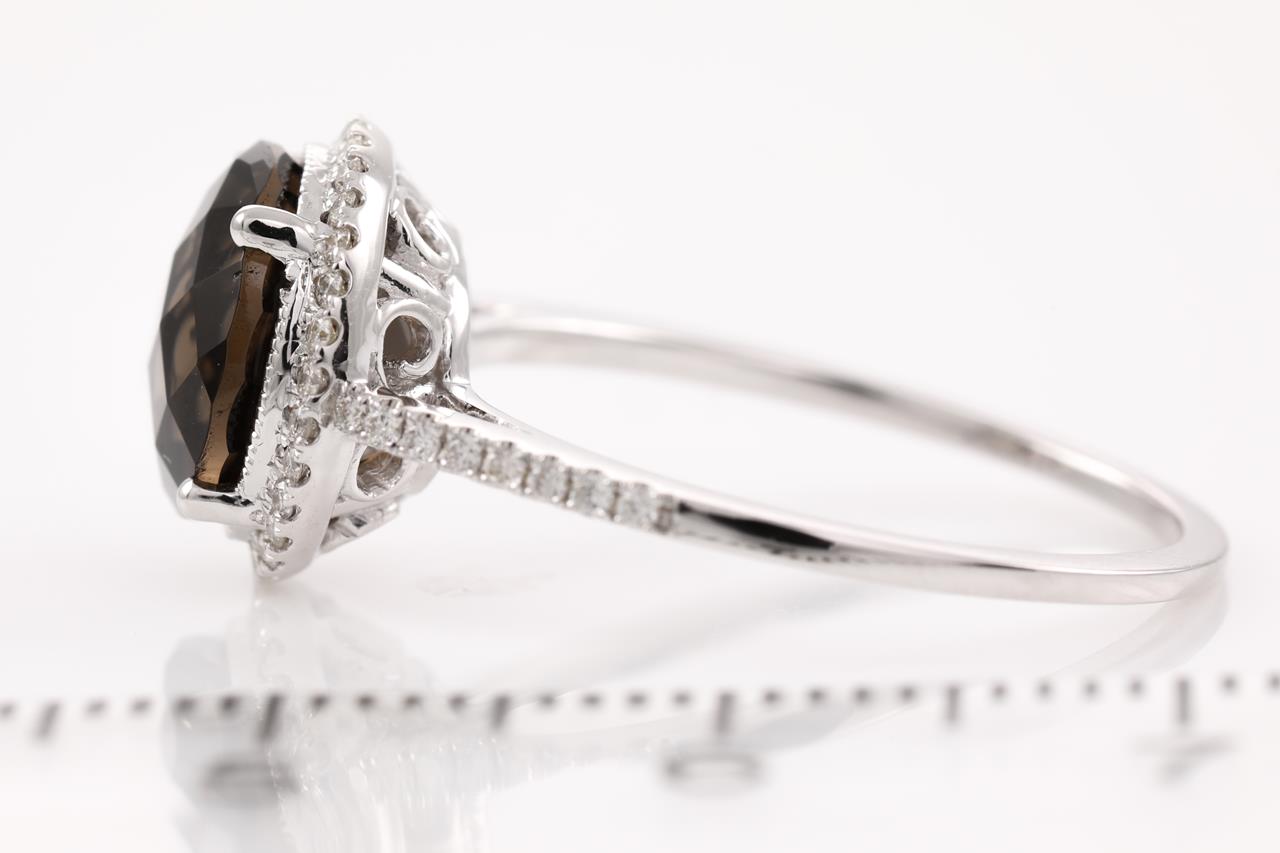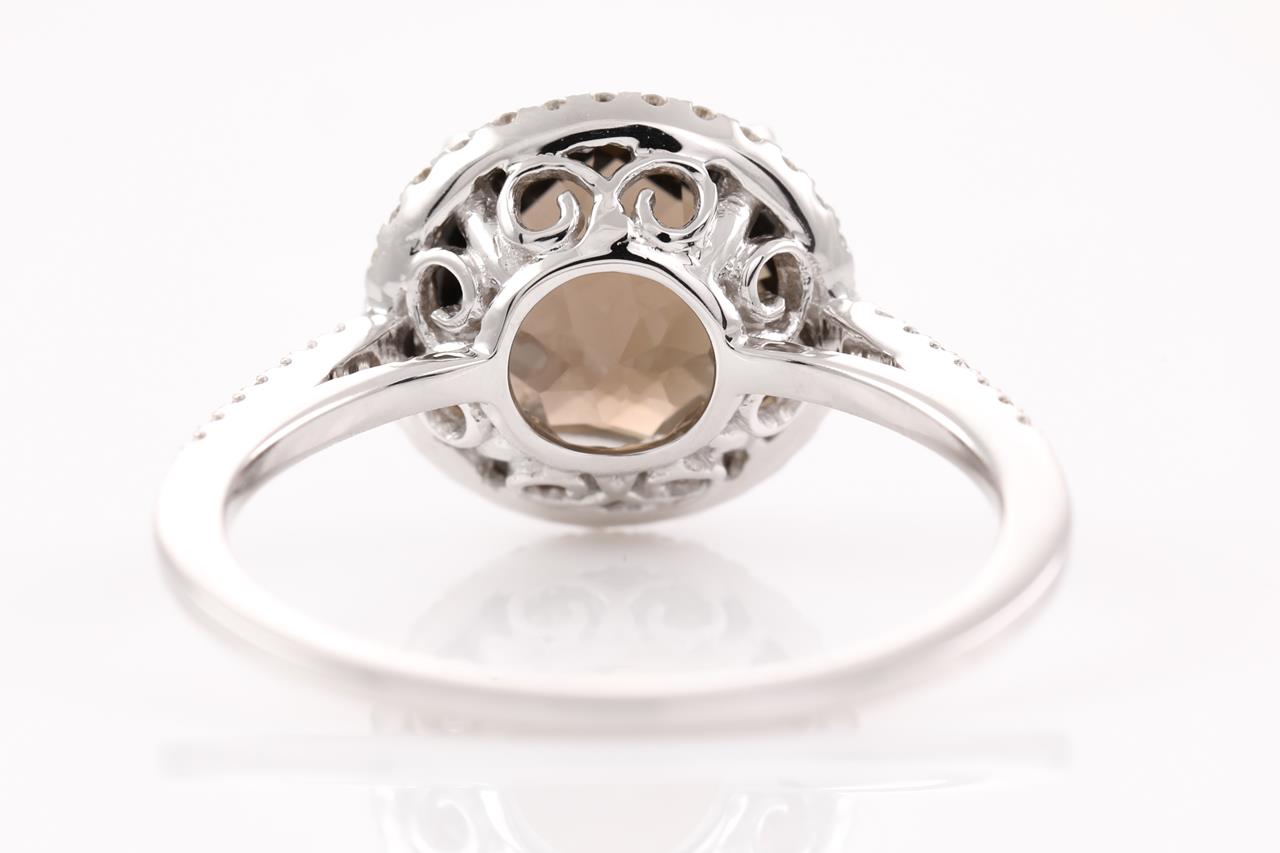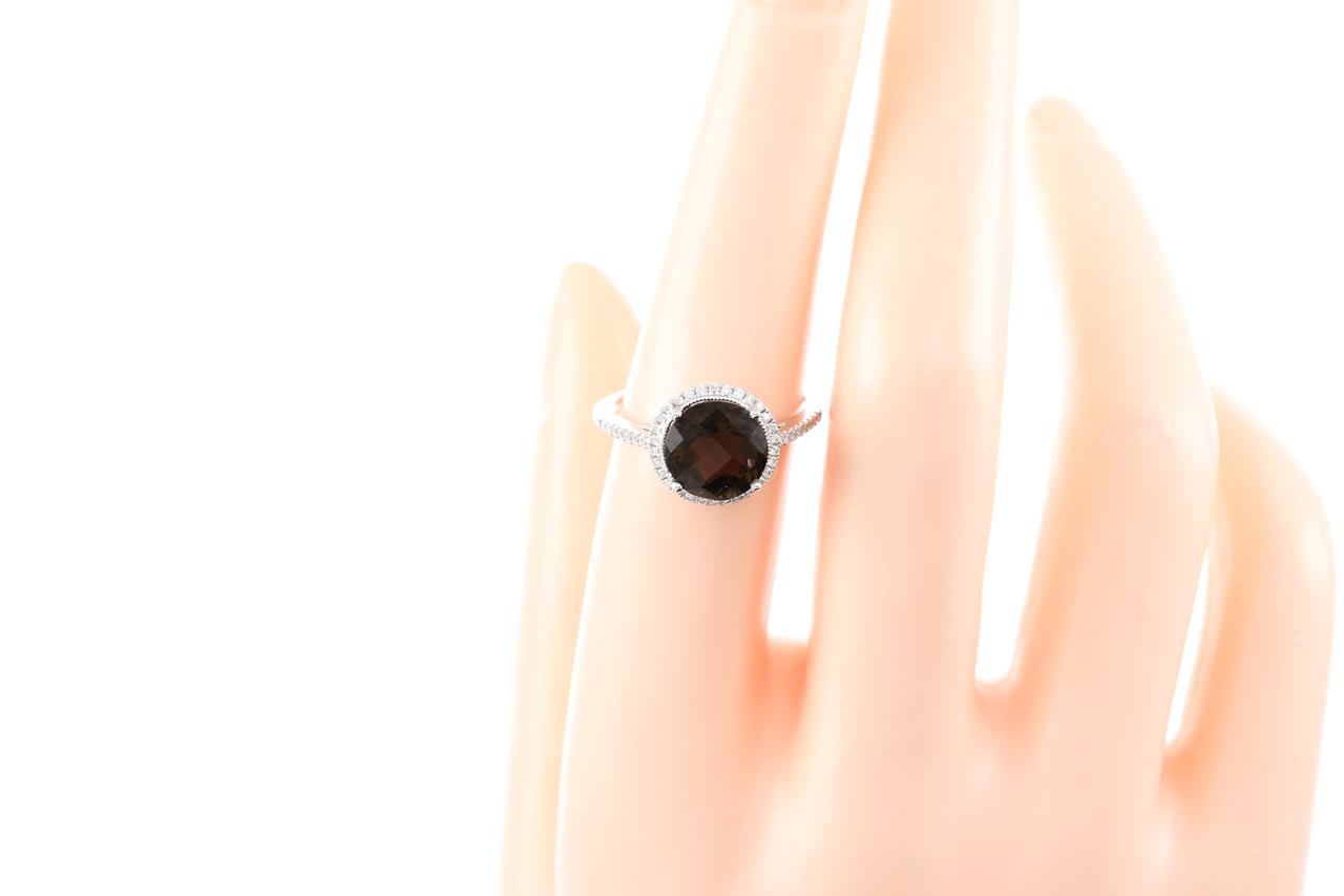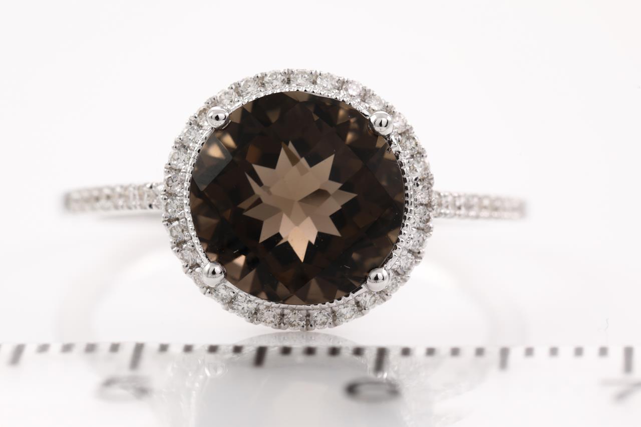 Quartz and Diamond ring with a round Smokey Quartz of 2.78ct and Diamonds totalling 0.18cts. 14ct white gold. Ring size N - ring resizing is not recommended. Weight: 2.7g. (New)
