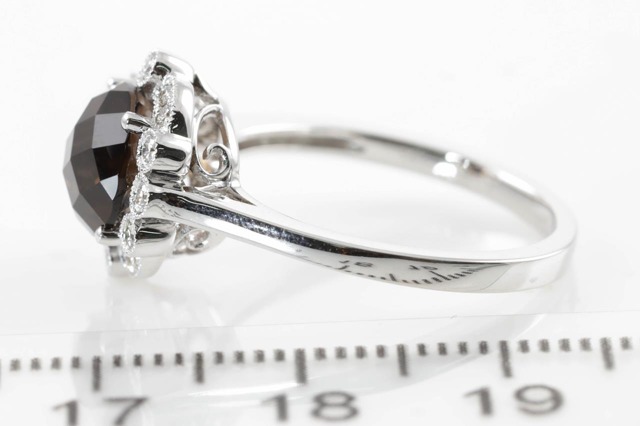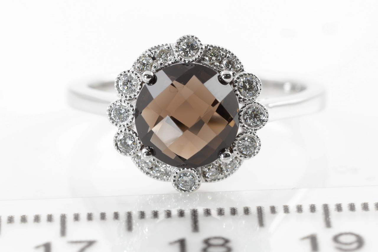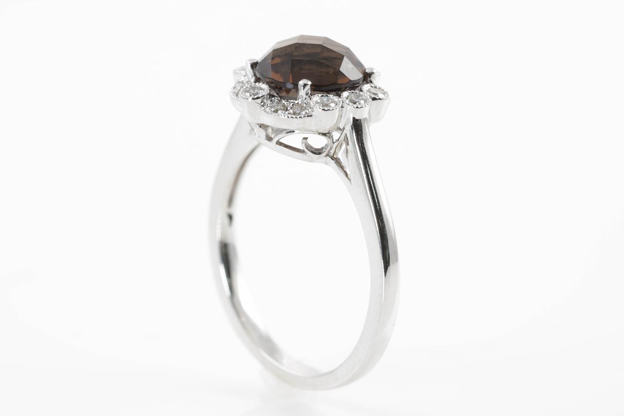Quartz and Diamond ring with a round Smokey Quartz of 2.00ct and Diamonds totalling 0.17cts. 14ct white gold. Ring size N. Weight: 3.6g. (New)