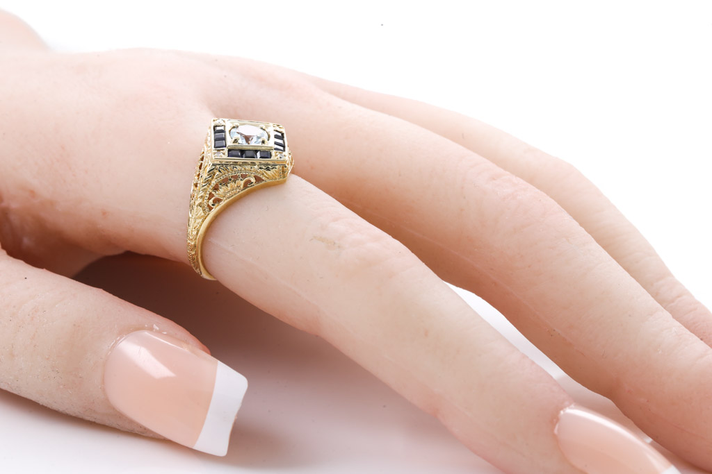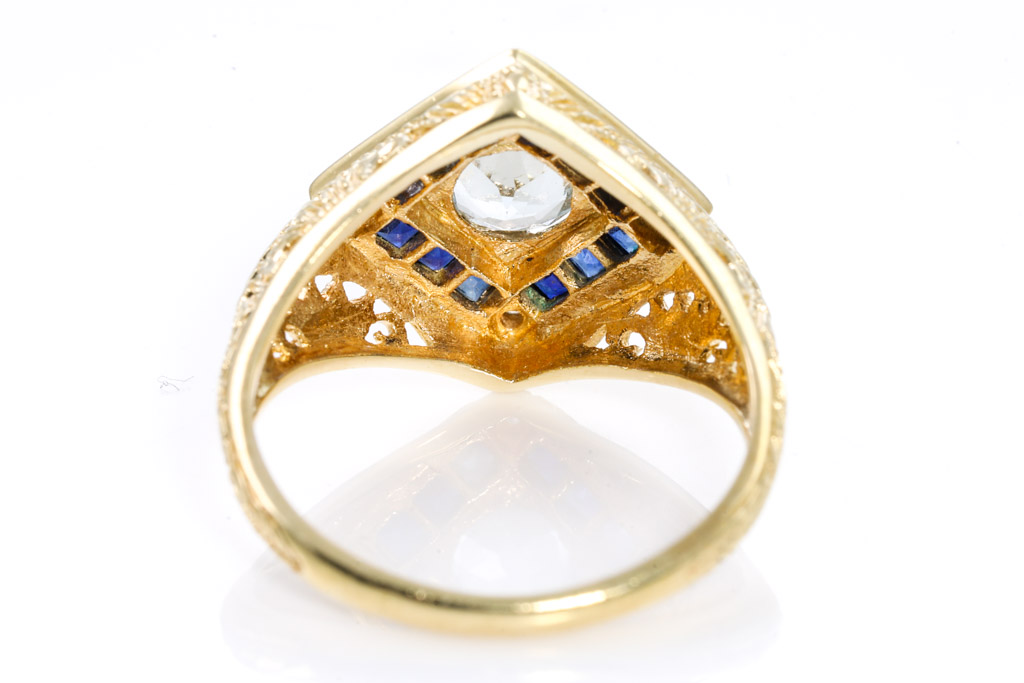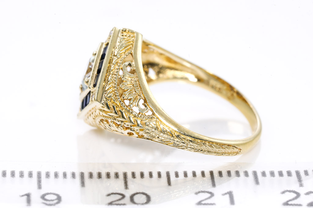 Vintage Quartz and Sapphire ring with round colourless quartz of approximately 0.48ct and blue princess cut Sapphires totalling approximately 0.12ct and Diamonds totalling approximately 0.01cts. 14ct yellow gold. Ring size L - resizing not recommended. Weight 3.4g. (Pre-owned)