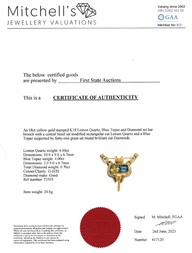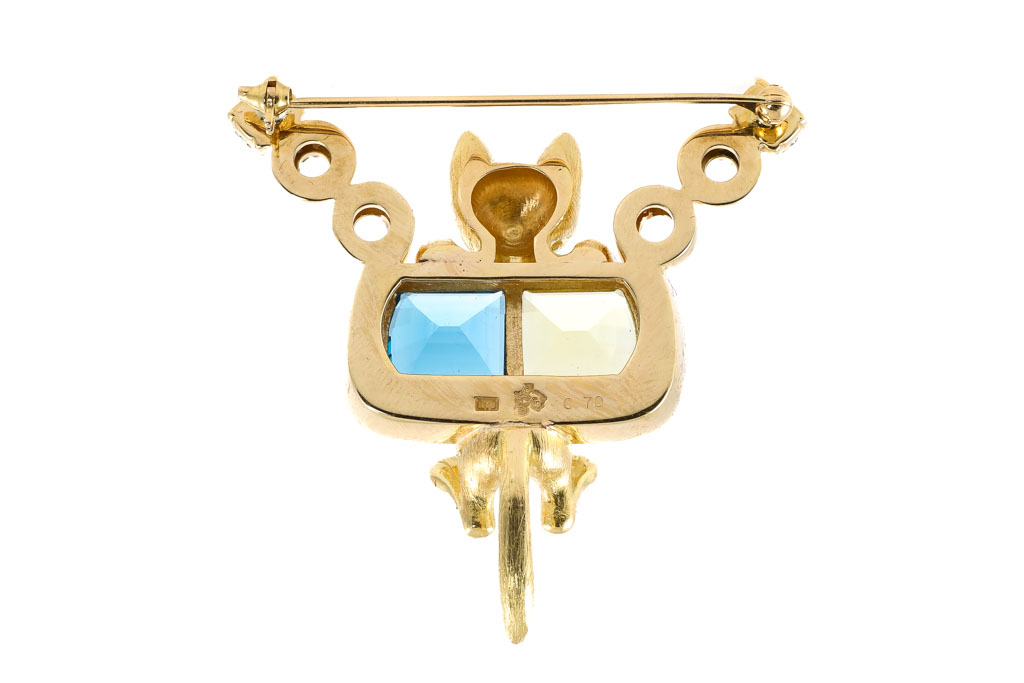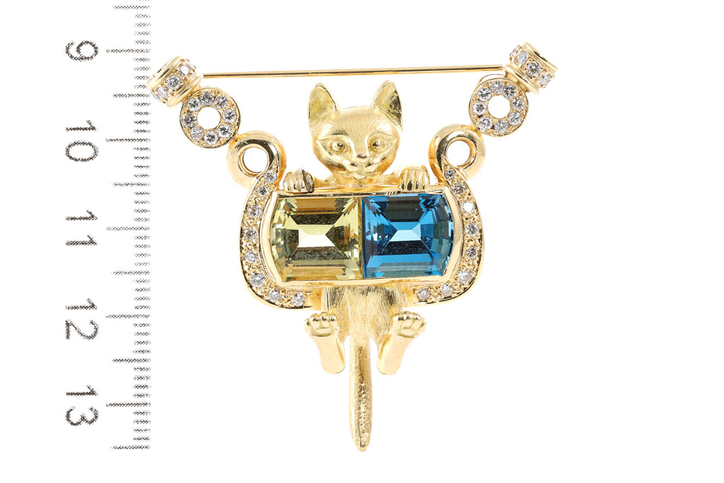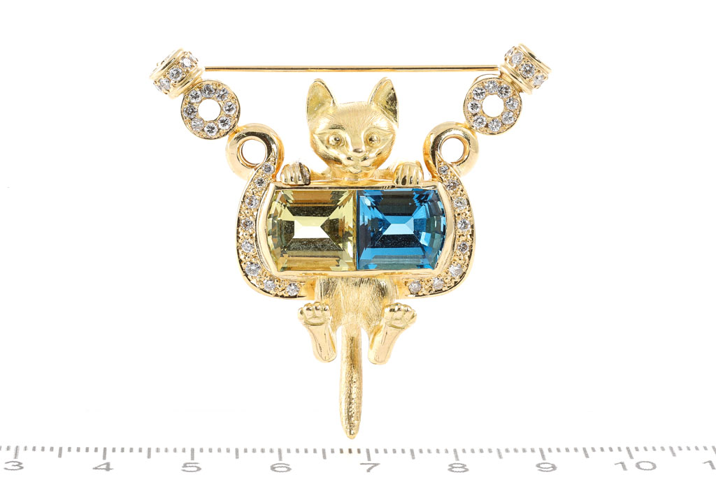 Quartz, Topaz and Diamond cat designed brooch with fancy cut Lemon Quartz of 4.00ct, fancy cut Blue Topaz of 4.00ct and Diamonds totalling 0.70cts (Estimated grading: G-H SI). 18ct yellow gold. Weight: 24.6g. With Certificate #417120. (Pre-owned)