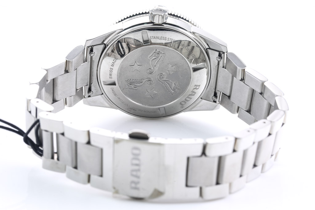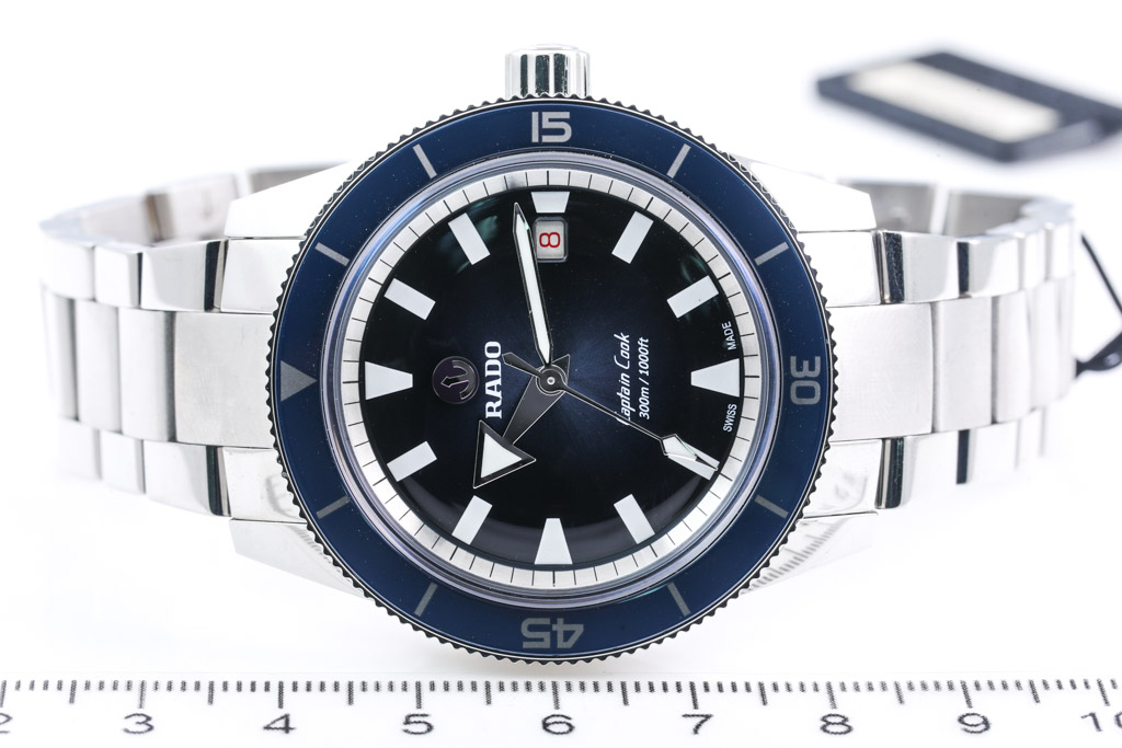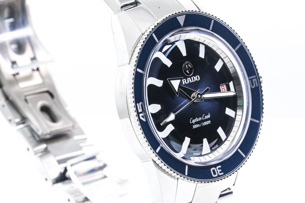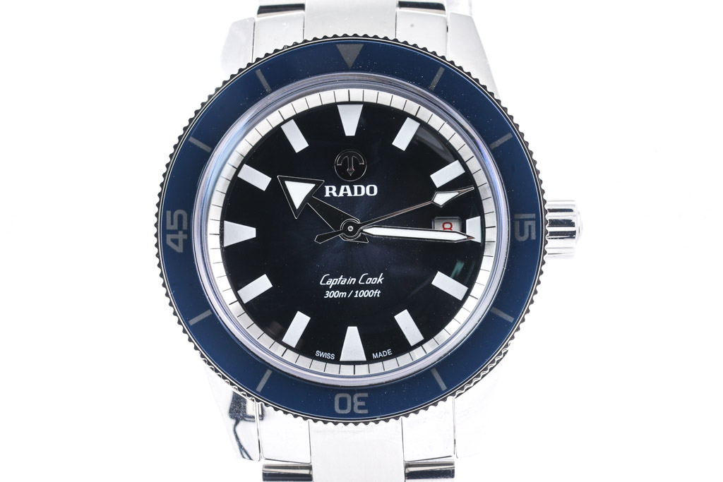 POUCH NOT BOX? Rado Captain Cook stainless steel automatic mens watch. Blue dial, date, case diameter: 42mm, wrist size: 21cm, Swiss made. Ref# R32105208. With Rado stainless steel bracelet and clasp. With Rado 2 Year International Warranty Card and Rado pouch. Rado warranty applies. (As New, Note: minor scratches on case and light wear on strap due to being display stock)
