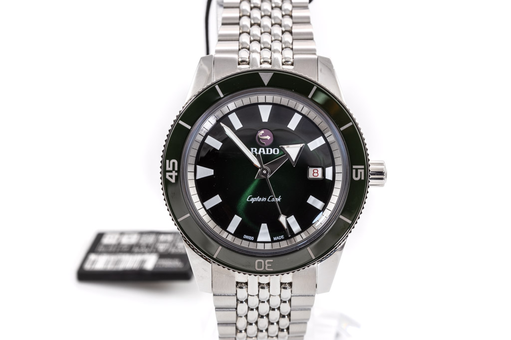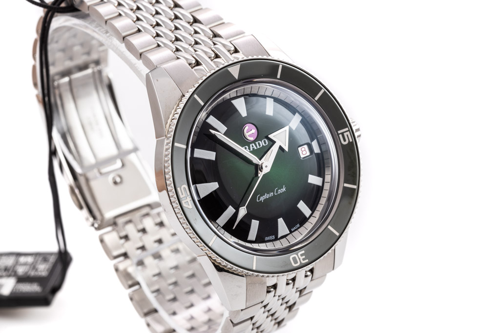 Rado Captain Cook stainless steel automatic mens watch. Green dial, date, case diameter: 42mm, wrist size: 20cm, Swiss made. Ref# R32505313. With Rado stainless steel bracelet and clasp. With Rado 2 Year International Warranty Card and Rado box. Rado warranty applies. (As New, Note: minor scratches on case and bracelet due to being display stock)
